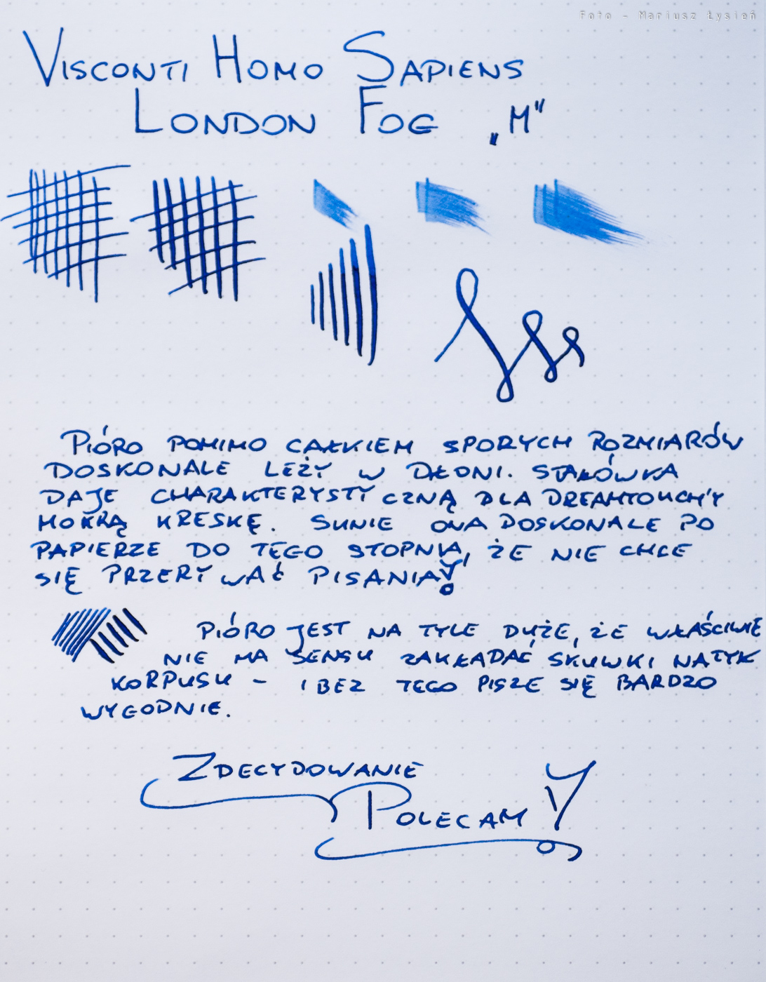 London Fog to kolejne bardzo udane pióro firmy Visconti. Oparto je na dobrze przyjętej bazie jaką jest kolekcja Homo Sapiens, a dodatkowo powiela ciekawe wzorce znane już z edycji Florentine Hills. Ze względu na bardziej stonowaną kolorystykę może on znaleźć większe grono nabywców. Jeżeli chodzi o wykonanie oraz właściwości piśmiennicze to pióro mogę zdecydowanie polecić.