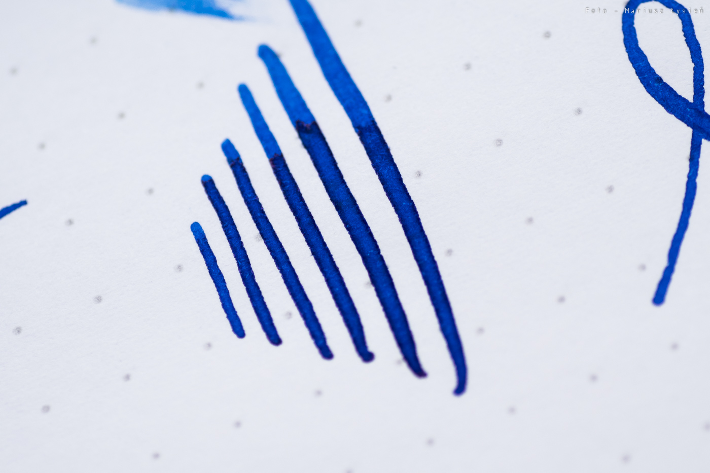 Palladowa stalówka Dreamtouch w tym przypadku ma szerokość „M”. Pisze ona doskonale, a przy tym umożliwia spore możliwości jeżeli chodzi o zmianę grubości linii. Niezależnie od wybranej szerokości, muszę przyznać, że stalówki Dreamtouch są doskonałe. Sposób w jaki suną po papierze, a także ich podatność nawet na niewielki nacisk jest tym, co je wyróżnia. Ilość podawanego na papier atramentu jest całkiem spora, lecz nie są to stalówki tzw. „lejące”. Na pewno ilość atramentu na papierze jest bardziej obfita aniżeli to co znamy z większości innych produkowanych obecnie stalówek.