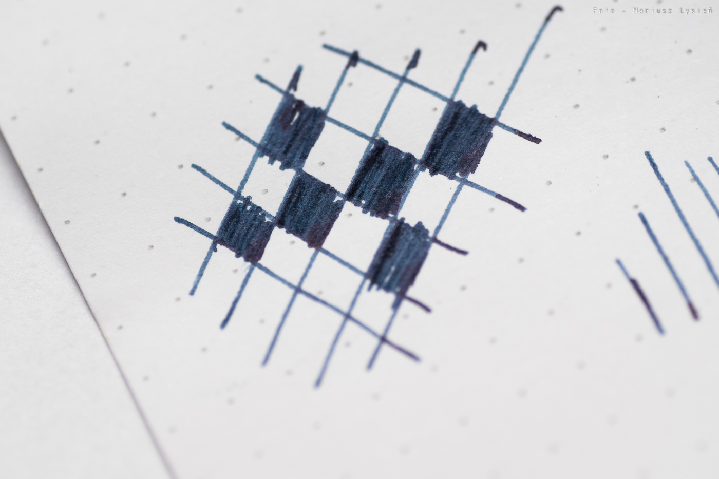 Jeśli chodzi o zasychanie w piórze, o którym czytałam w kilku opiniach nt. tego atramentu – ja się z tym nie zetknęłam. Może dlatego, że atrament nie zalegał bardzo długo w piórze, bo szybko go zużywałam. Duży plus daję również za przepływ. Minusem jest nieco zbyt długi czas schnięcia oraz nie najlepsza wodoodporność (choć zalany tekst w znacznej mierze będzie możliwy do odczytania).