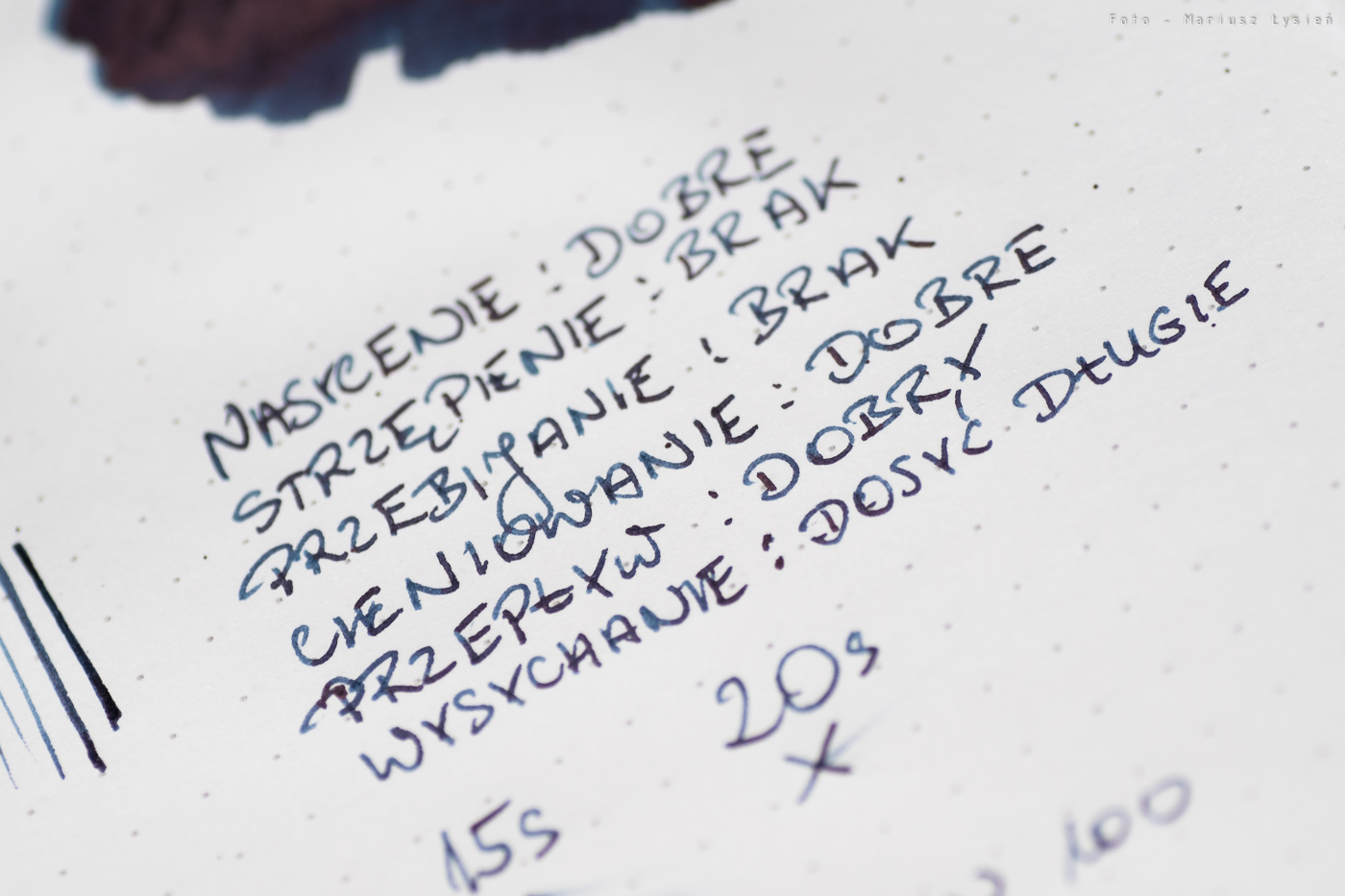 Podziękowania dla użytkownika Visvamitra z Forum o Piórach za udostępnienie próbki tego atramentu.