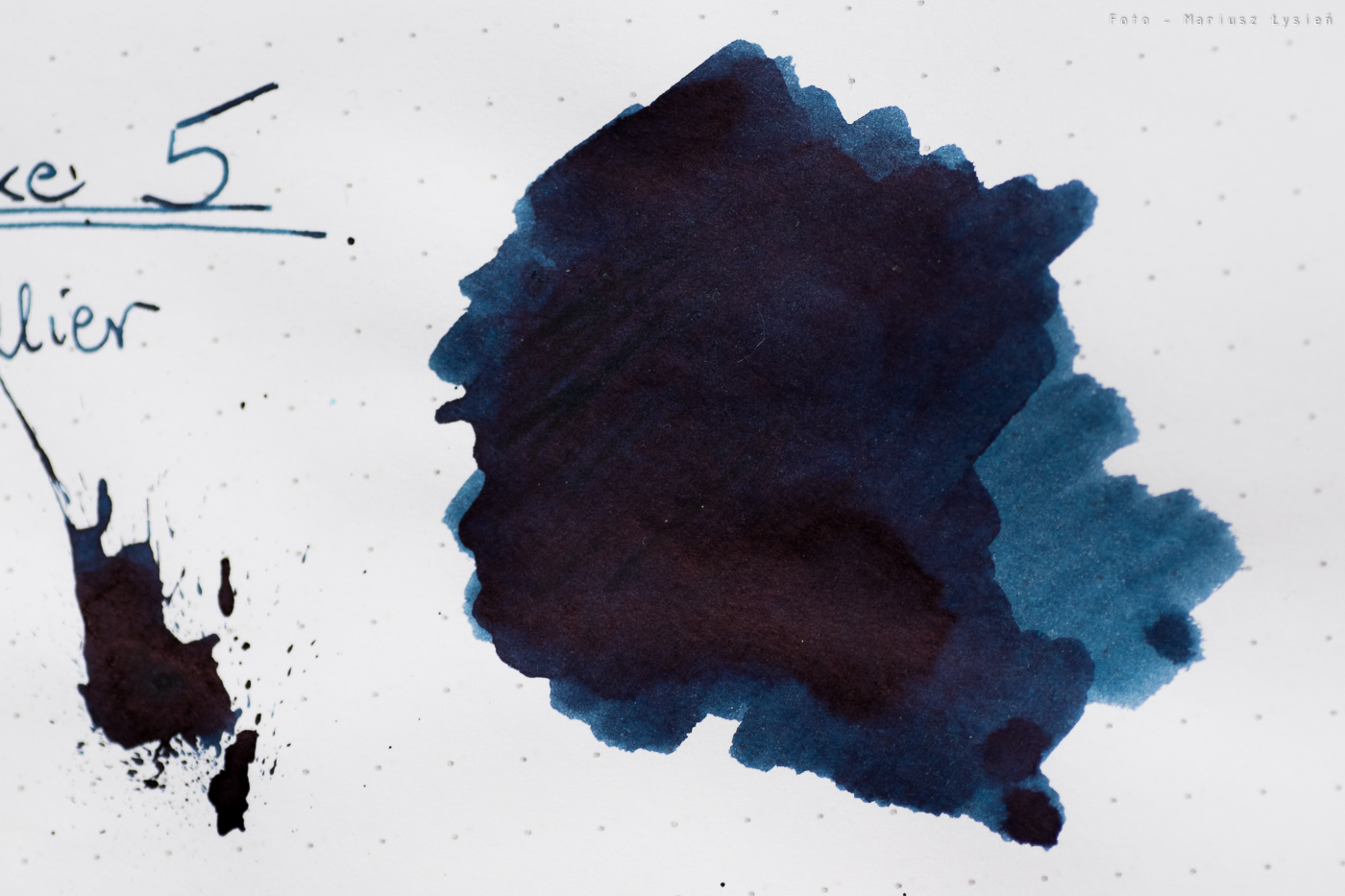 Bleu Equinoxe 5 to odcień ciemnoniebieski. Kolor całkiem ciekawy o ile nałożymy kilka warstw. Dużym plusem jest cieniowanie tego atramentu (jak widać na załączonych zdjęciach, nakładanie kolejnych warstw jest bardzo dobrze widoczne). Kleks to już zdecydowanie odcień blue-black.