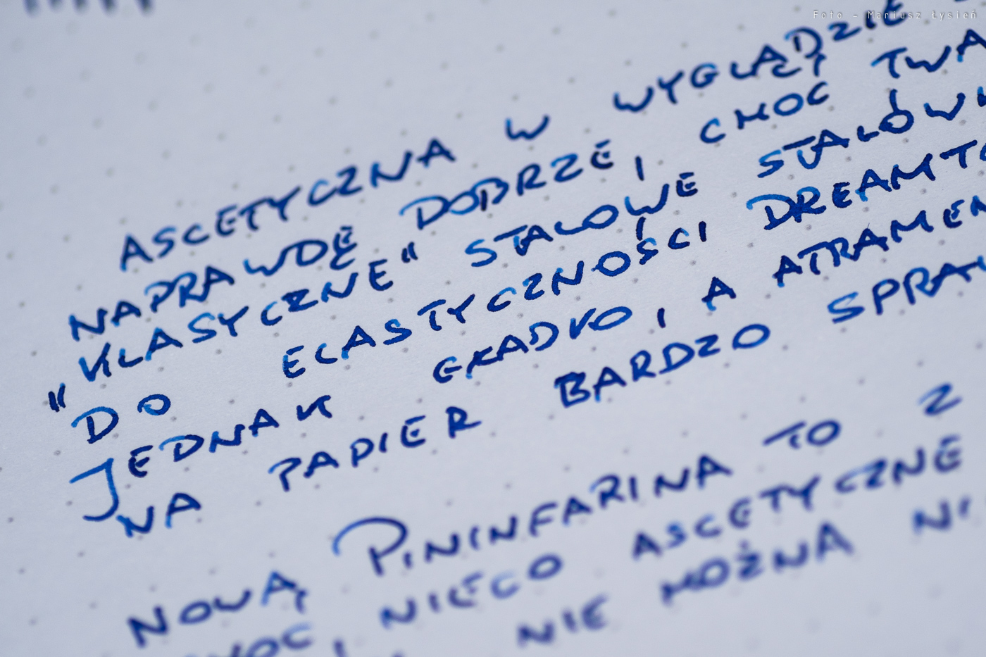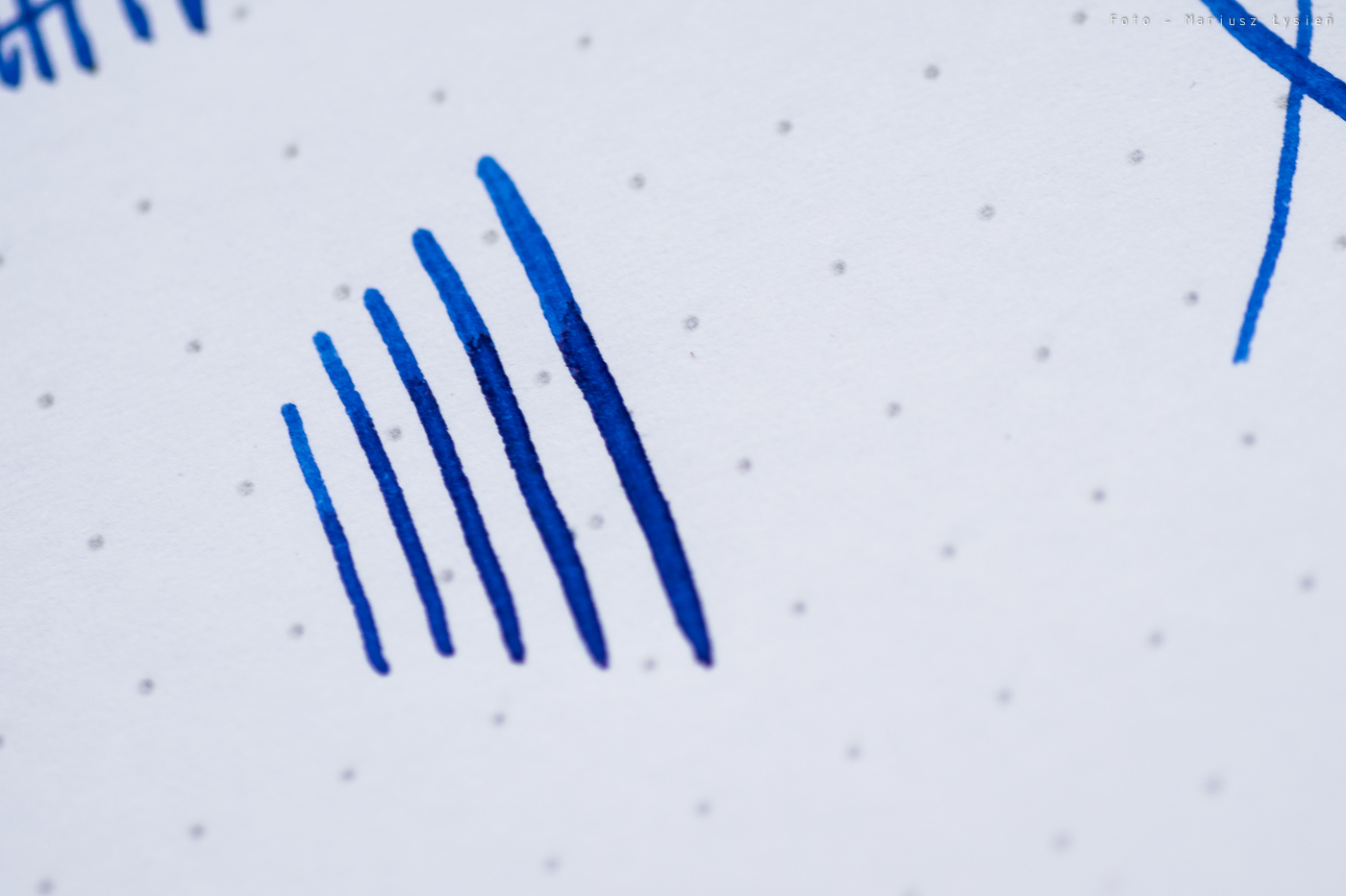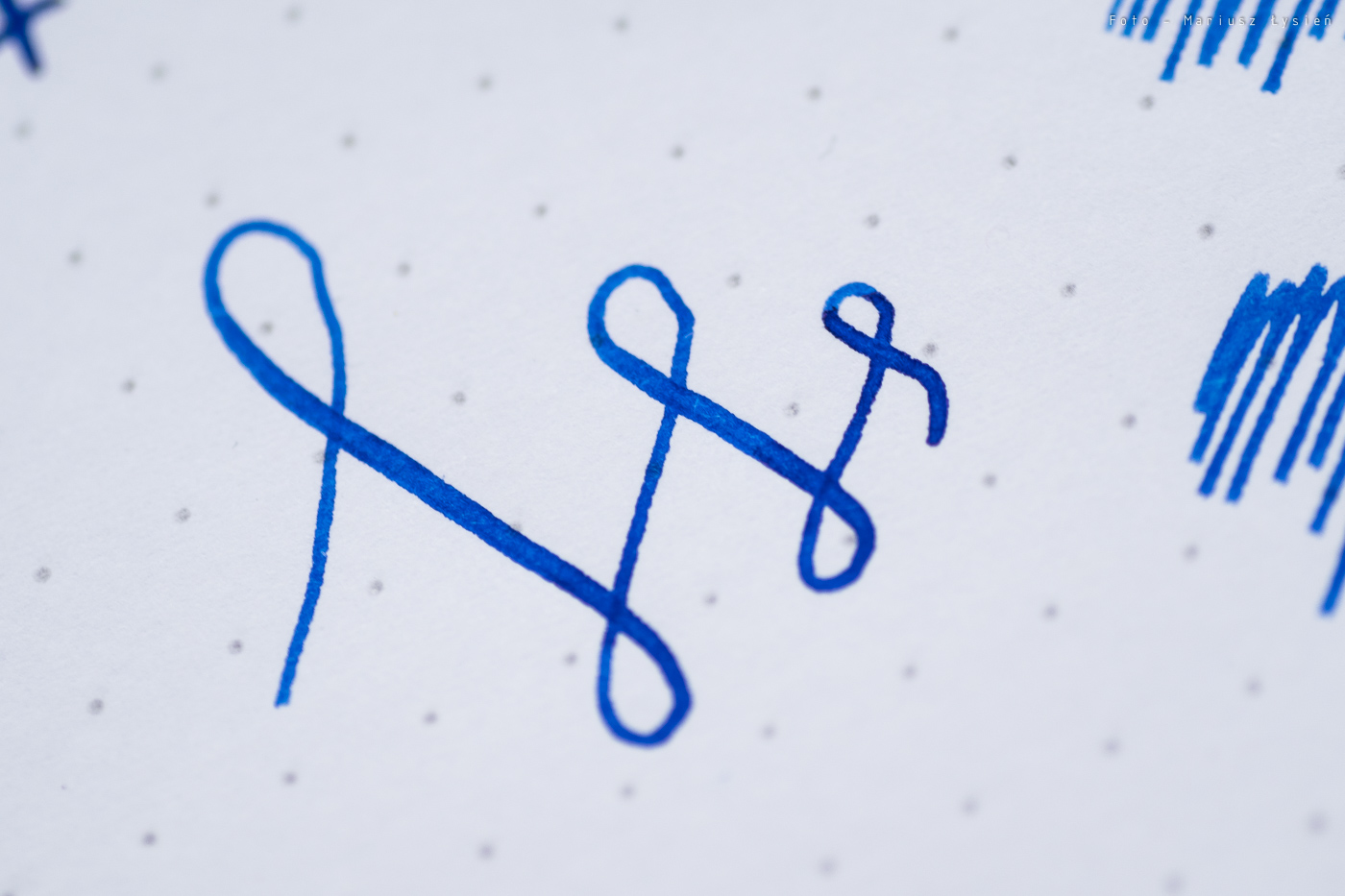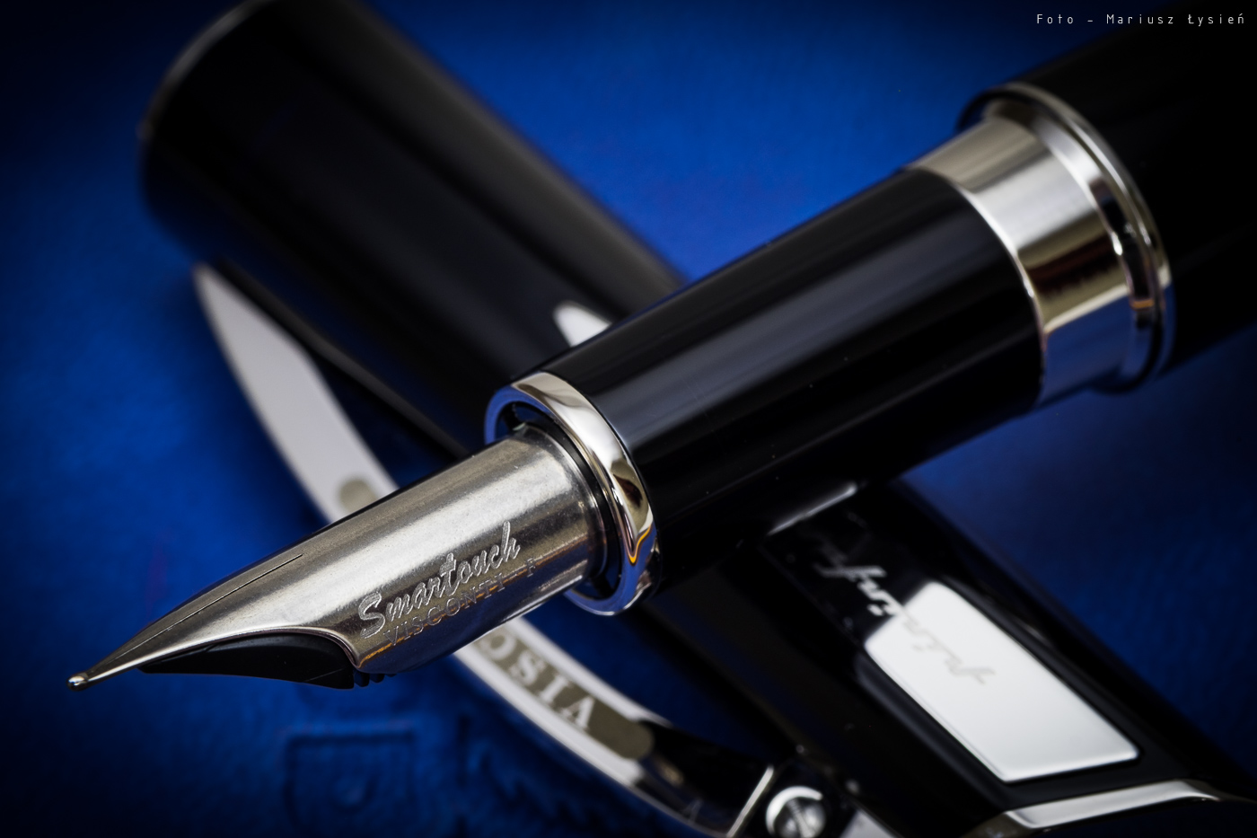 Stalówka Smartouch jest oferowana w rozmiarach od EF do B. Wykonana jest ona z materiału o nazwie Chromium 18 będącego stopem żelaza (72%), chromu (18%) i niklu (10%). Byłem ciekaw jak poradzi sobie ona w praktycznym teście. Muszę przyznać, że spisuje się ona naprawdę dobrze. Sunie całkiem gładko po powierzchni papieru, a ilość podawanego przez nią atramentu można określić jako umiarkowanie dużą. Czy można uznać ją za elastyczną? W dużym stopniu – tak. Stalówka ta pomimo grubości F, daje nam możliwość mniej więcej dwukrotnego zwiększenia grubości linii. Uczciwie jednak przyznam, ze pod tym względem przegrywa ona z wyśmienitymi palladowymi stalówkami Dreamtouch produkowanymi przez Visconti, które po prostu wymagają użycia mniejszej siły docisku wymaganego do wpłynięcia na grubość kreślonej linii. Trzeba jednak muszę przyznać, że stalówka ta jest przyjemna w użytkowaniu. W moim odczuciu jednak sama stalówka jest trochę zbyt minimalistyczna – poza napisami „Smartouch Visconti” oraz oznaczeniem szerokości stalówki, nie znajdziemy na niej żadnych elementów ozdobnych.
