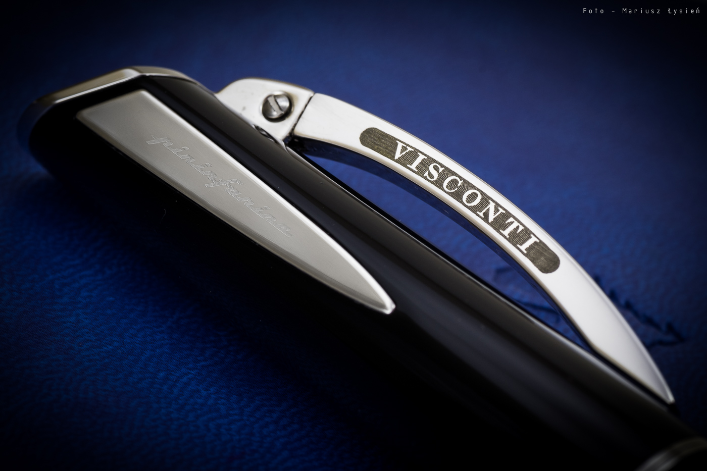 Klip jest naprawdę sprężysty i trzeba przyznać, że system w jaki rozwiązało to Visconti jest świetny. Klip pracuje lekko, dzięki czemu zamontowanie pióra do grzbietu notesu czy też materiału z którego wykonano naszą koszulę, jest bezproblemowe. Skuwkę wieńczy logo firmy Pininfarina, zaś na zakończeniu korpusu znajdziemy logo Visconti.