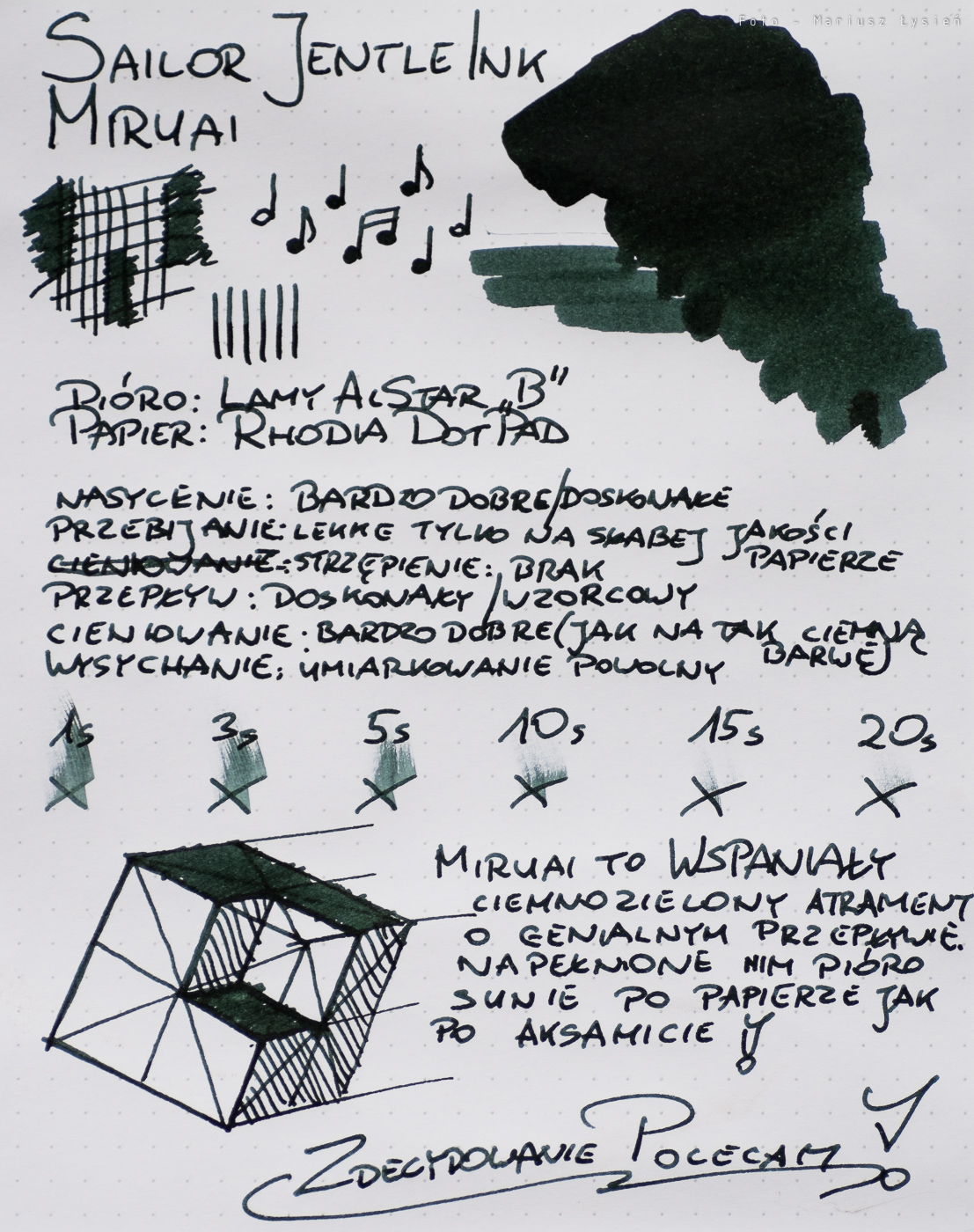 Miruai to kolejny doskonały atrament z linii Czterech Pór Roku firmy Sailor. Co więcej, atrament ten jest w naszym kraju bezproblemowo dostępy. Dodatkowo przystępna cena zachęca do zakupu tego świetnego i z pewnością wartego polecenia atramentu, który może być interesującą odmianą od klasycznej czerni bądź „dosłownej” zieleni.