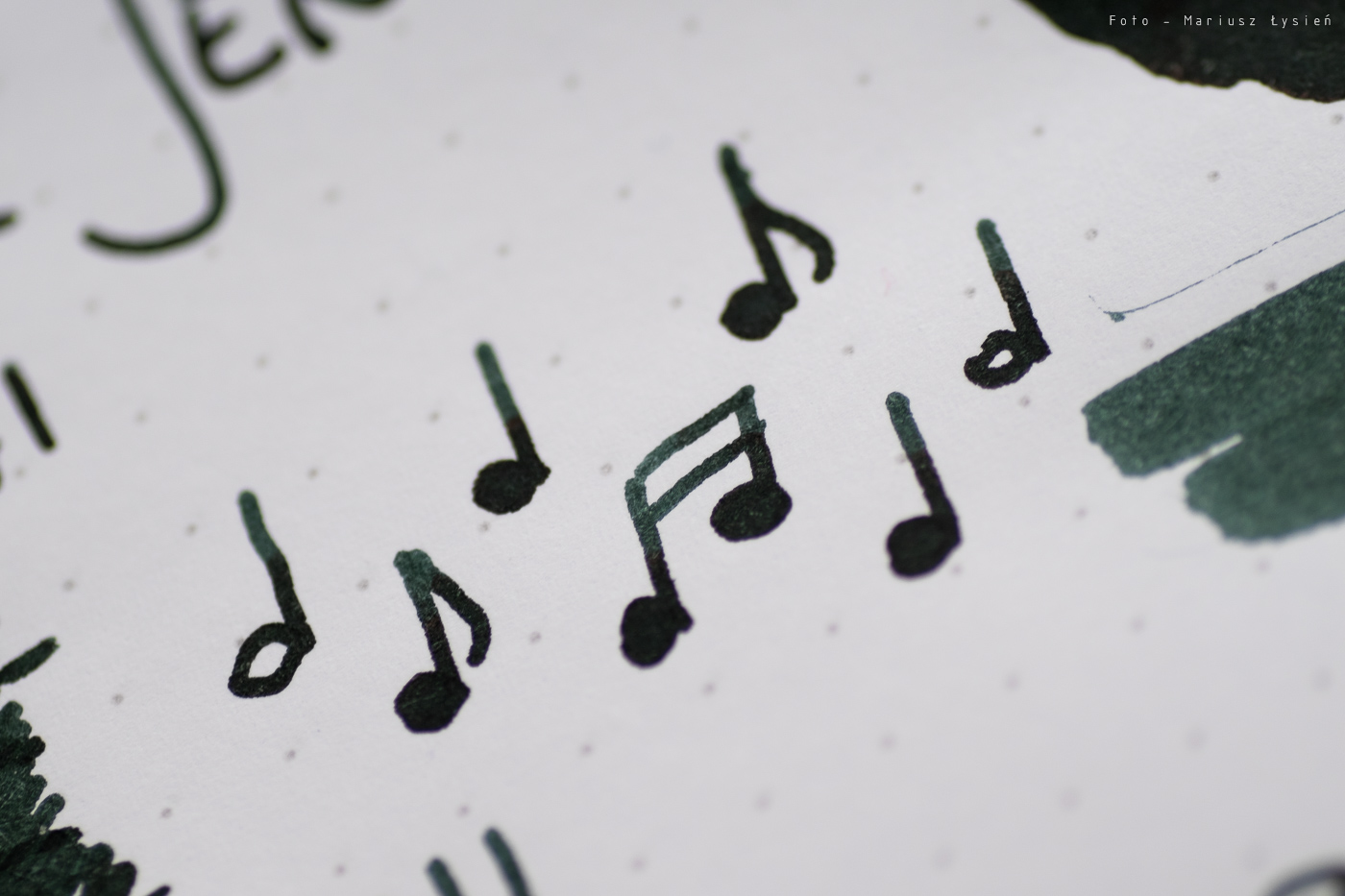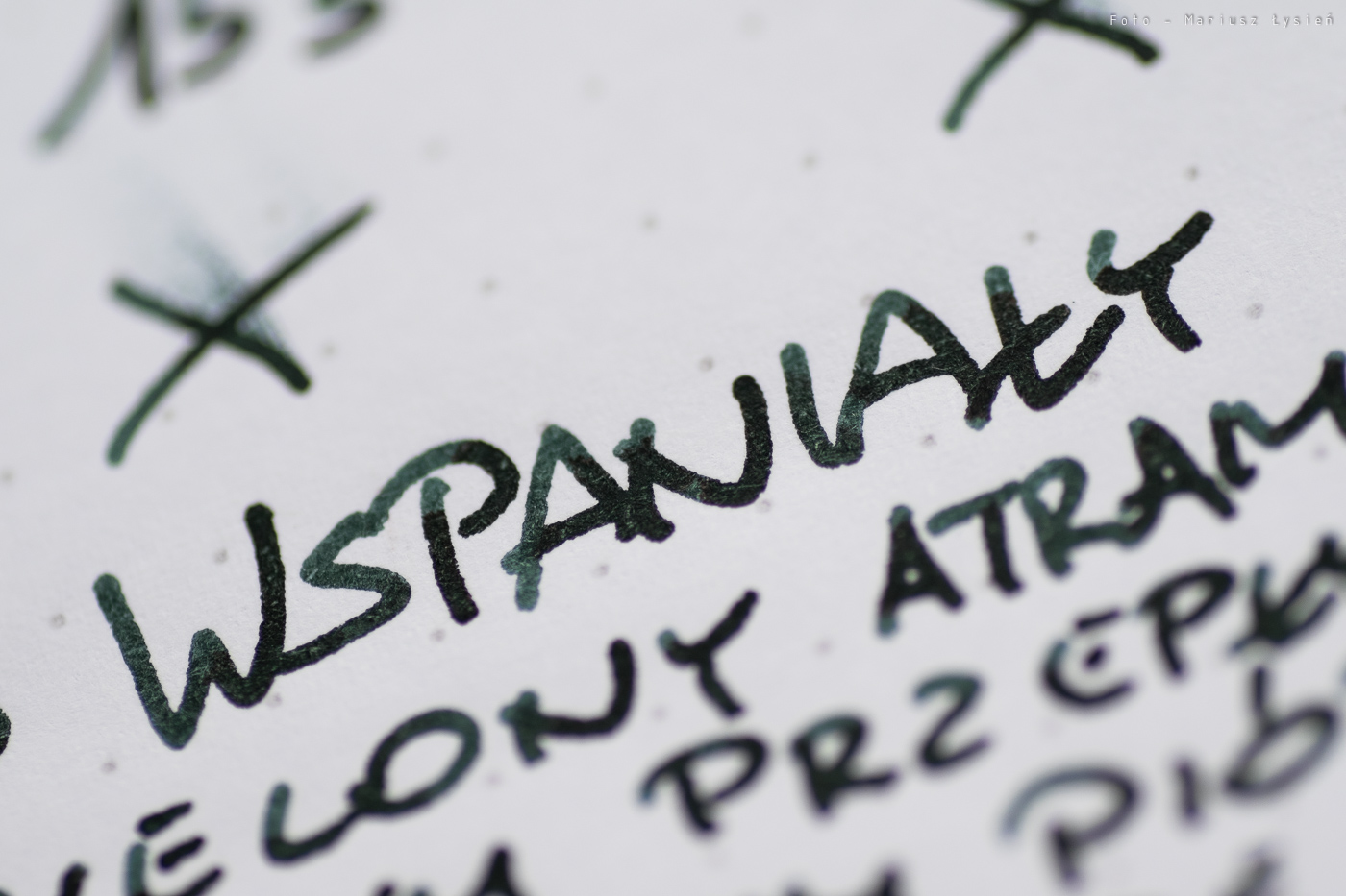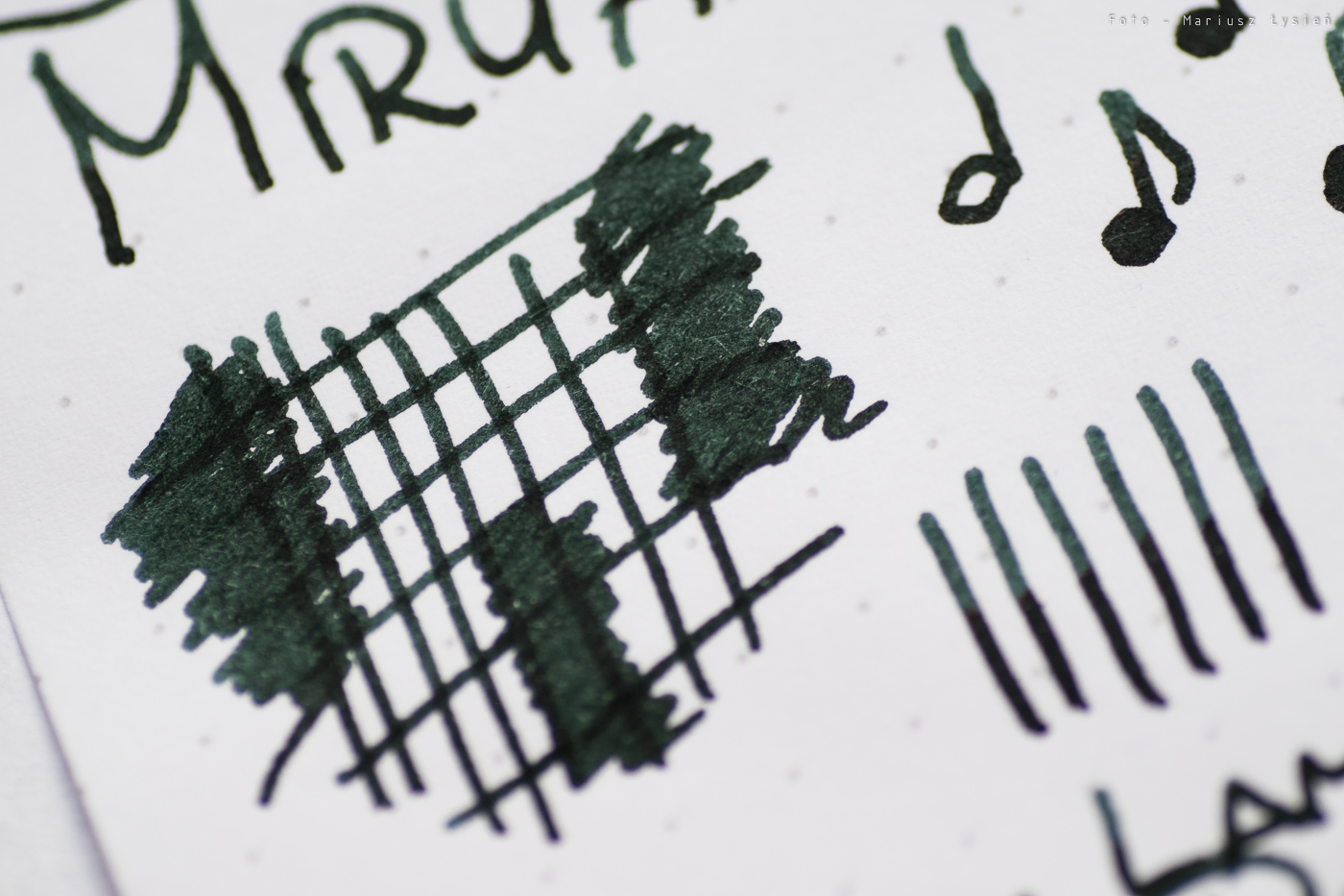 Tytułowy inkaust to bardzo ciemna zieleń i to do tego stopnia, że w piórze z tzw. „mokrą” stalówką może sprawiać wrażenie czarnego. Bardzo dobre nasycenie oraz ciemny kolor przekładają się na wysoką czytelność napisanego przez nas tekstu. Sama barwa jest także na tyle elegancka, że atramentem tym możemy się posługiwać właściwie w dowolnej sytuacji.