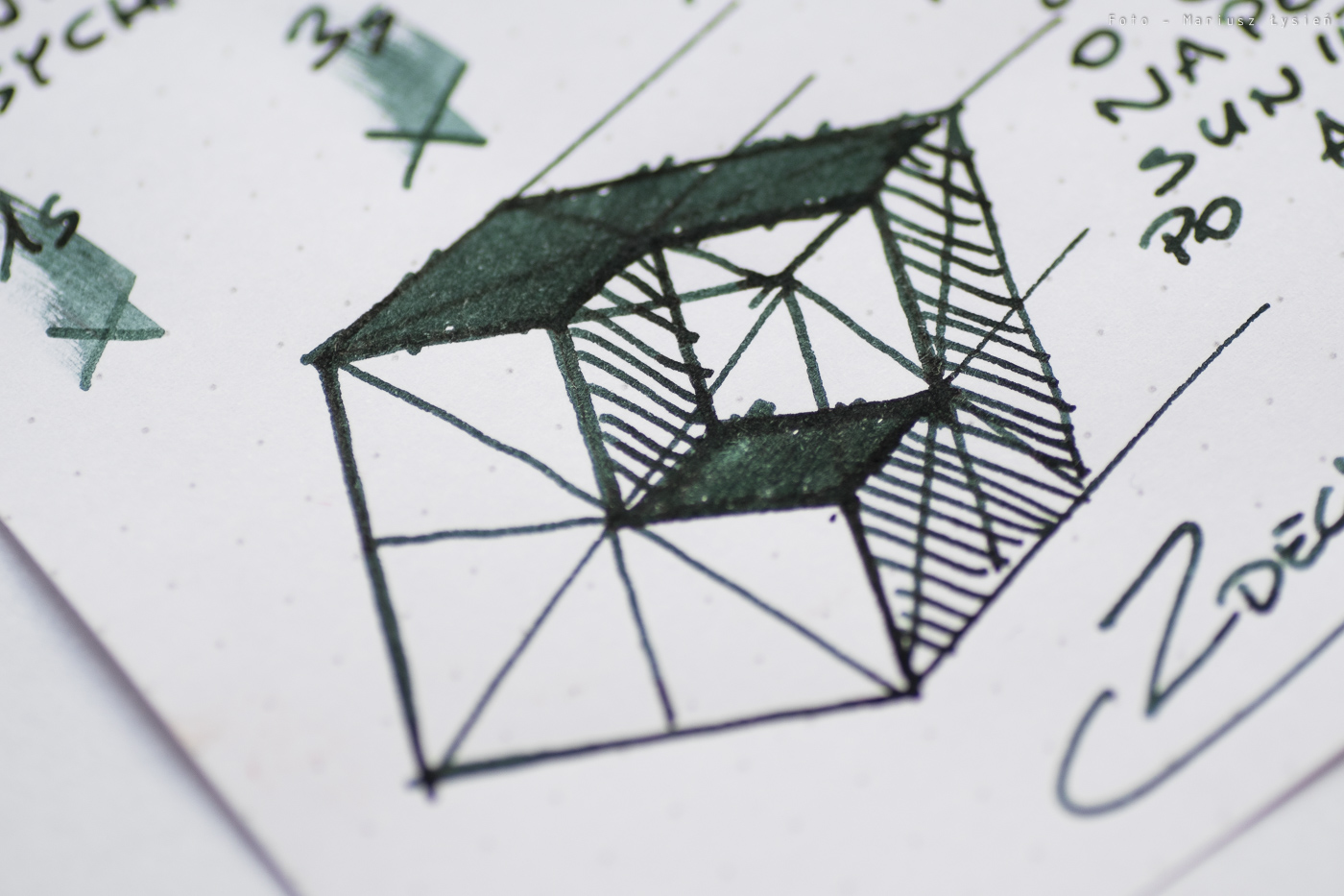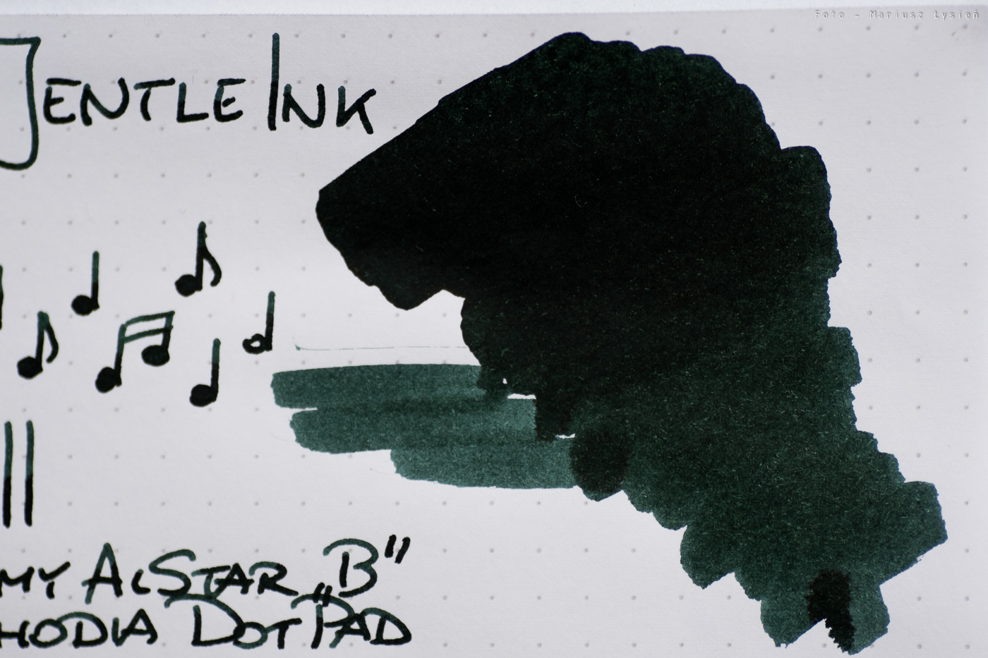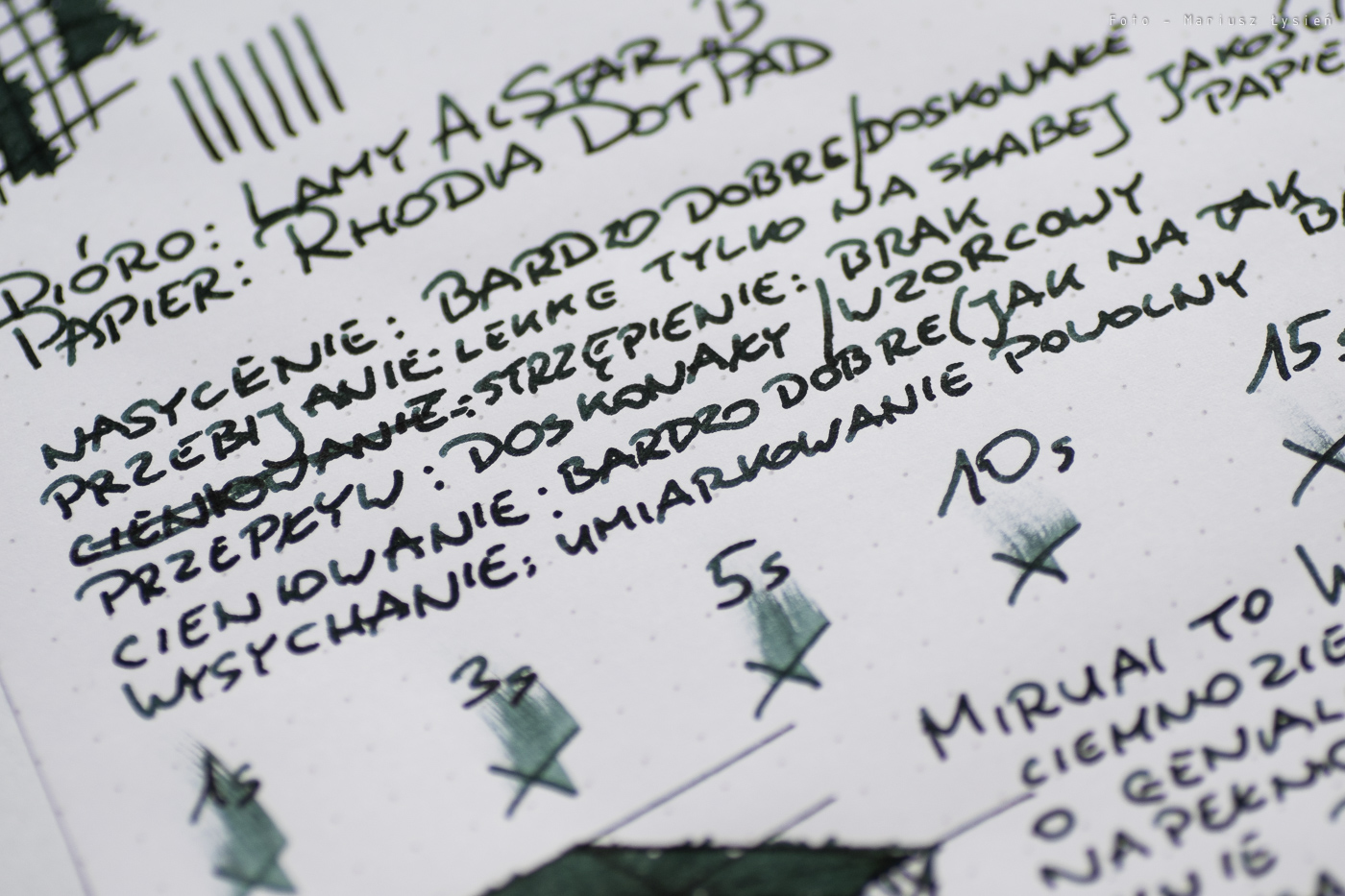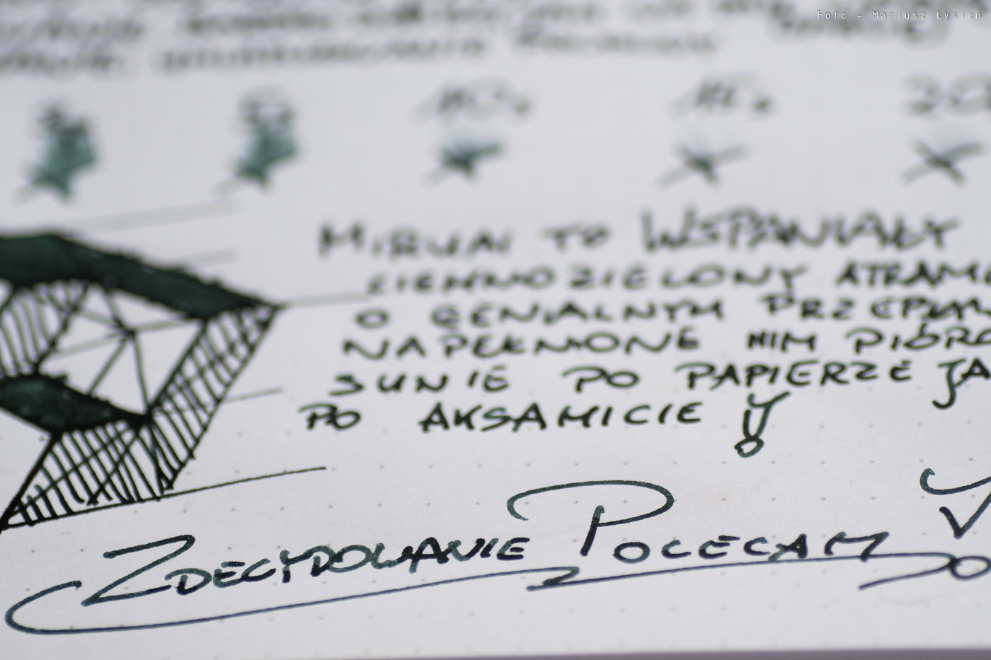 Tytułowy inkaust to bardzo ciemna zieleń i to do tego stopnia, że w piórze z tzw. „mokrą” stalówką może sprawiać wrażenie czarnego. Bardzo dobre nasycenie oraz ciemny kolor przekładają się na wysoką czytelność napisanego przez nas tekstu. Sama barwa jest także na tyle elegancka, że atramentem tym możemy się posługiwać właściwie w dowolnej sytuacji.