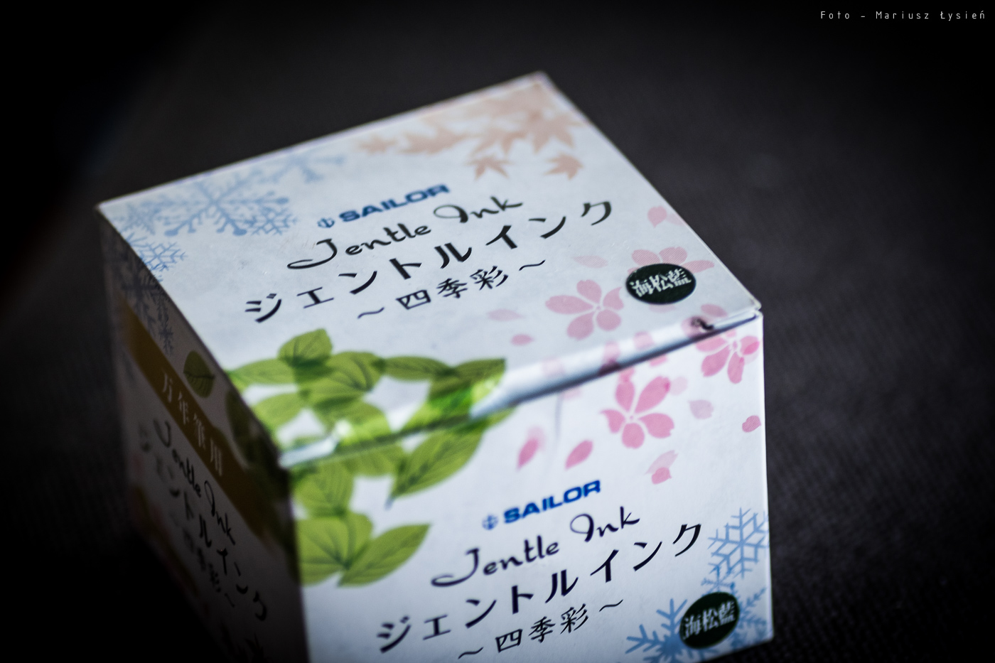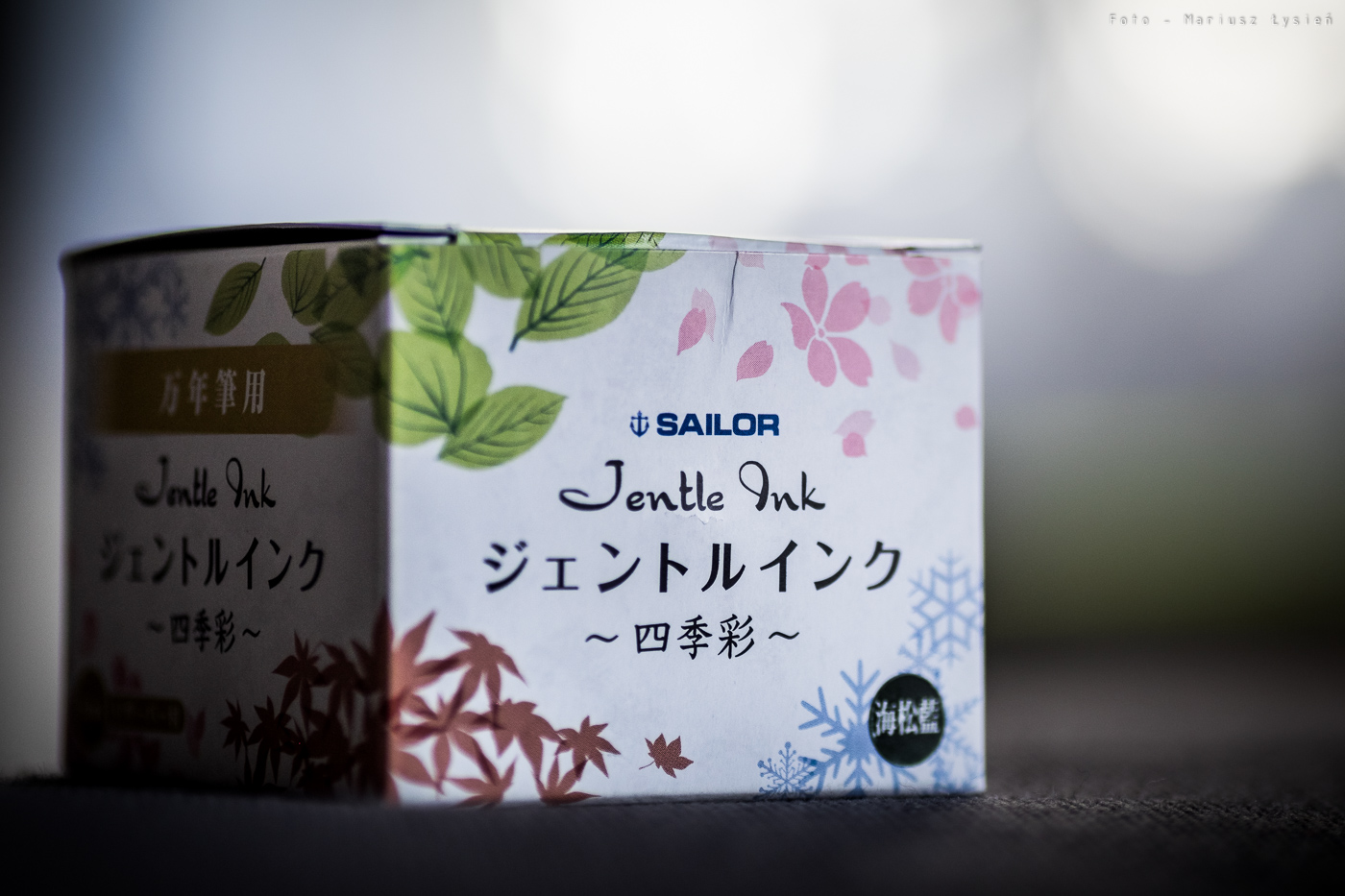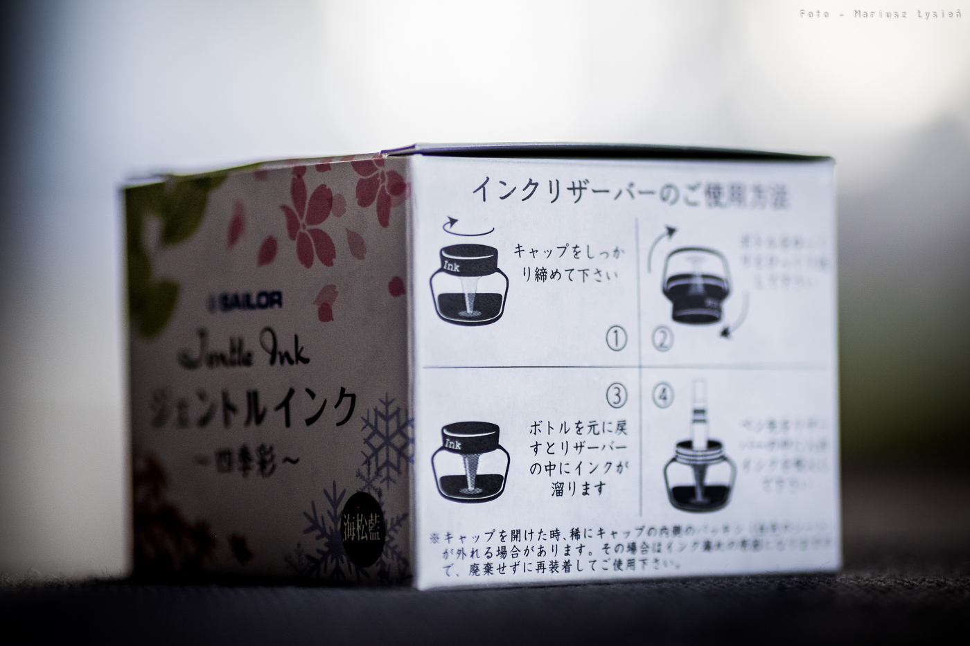 Atramenty z serii Jentle Ink sprzedawane są w białych, kartonowych opakowaniach, na których umieszczono symbole związane z tematyką czterech pór roku. Seria składa się z 8 kolorów, z których po dwa przypisano do odpowiadających im pór roku. Papierowe opakowanie robi dobre wrażenie i jest całkiem estetyczne. W mojej ocenie jedynym minusem są napisy praktycznie tylko i wyłącznie w języku japońskim, podczas gdy inkausty z tej serii są ogólnodostępne w innych krajach. Przyznam, że przynajmniej te najbardziej podstawowe informacje mogłyby być podane w języku bardziej powszechnym. Osoby nie władające językiem „kraju kwitnącej wiśni” mogą zidentyfikować ten kolor po kodzie: 13-1005-204.
