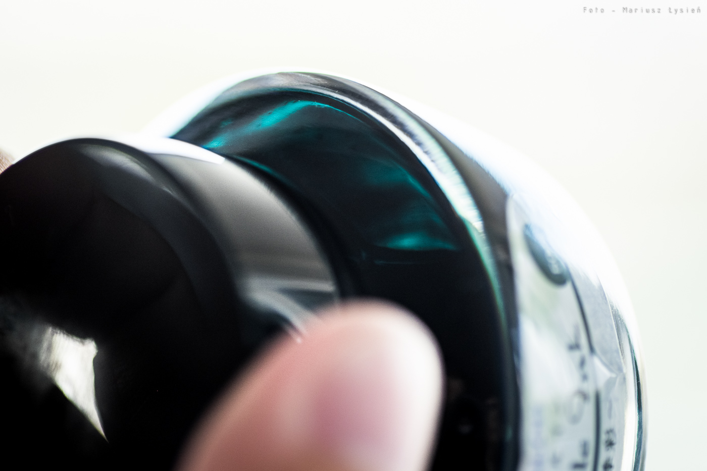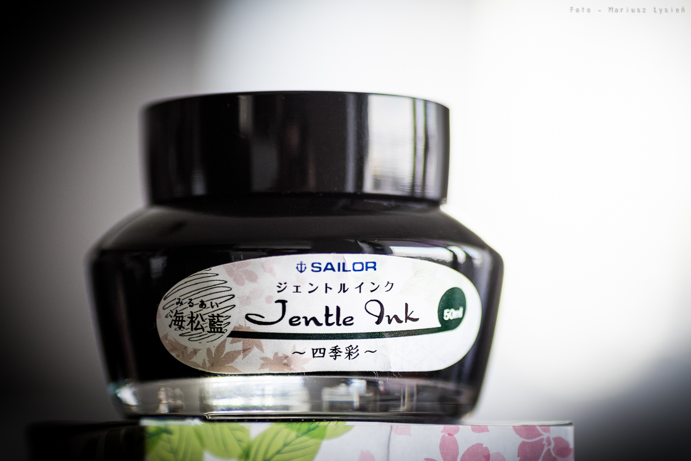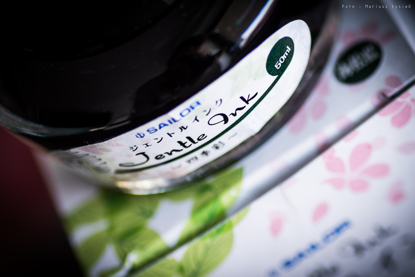 Ciecz zawarta jest w charakterystycznej dla firmy Sailor butelce. Ma ona objętość 50ml. Jej forma jest prosta, ale moim zdaniem funkcjonalna, a jej wygląd jest przyjemny dla oka. Szeroki korek sprawia, że umieszczenie dowolnego pióra w otworze butelki jest bezproblemowe. Z przodu naczynia umieszczono niewielką etykietę o owalnym kształcie. Moim zdaniem prezentuje się ona naprawdę ładnie, z tym, że oczywiście również wszystkie opisy poza napisami „Sailor” oraz „Jentle Ink” są również w języku Japońskim. Podsumowując, butelka bardzo mi się podoba. Być może nie jest to najpiękniejszy kałamarz na rynku, ale jest na pewno ładny i prezentuje się schludnie. Ta prostota na swój sposób urzeka. Typowo japoński pragmatyzm odnajdziemy także wewnątrz butelki. Umieszczono tam niewielki plastikowy element, którego użycie opisano na kartonowym opakowaniu (oczywiście wszystkie opisy tradycyjnie w języku Japońskim). Niemniej jego zastosowanie sprowadza się do ułatwienia zatankowania pióra, gdy w butelce jest już niewiele atramentu. Po prostu odwracamy do góry dnem zakręconą butelkę i po chwili ustawiamy ją w normalnej pozycji. To właśnie ten prosty ruch sprawia, że pozostały w butelce atrament zapełnia plastikowy element, wewnątrz którego możemy po odkręceniu butelki zanurzyć pióro i nabrać komfortowo atrament.