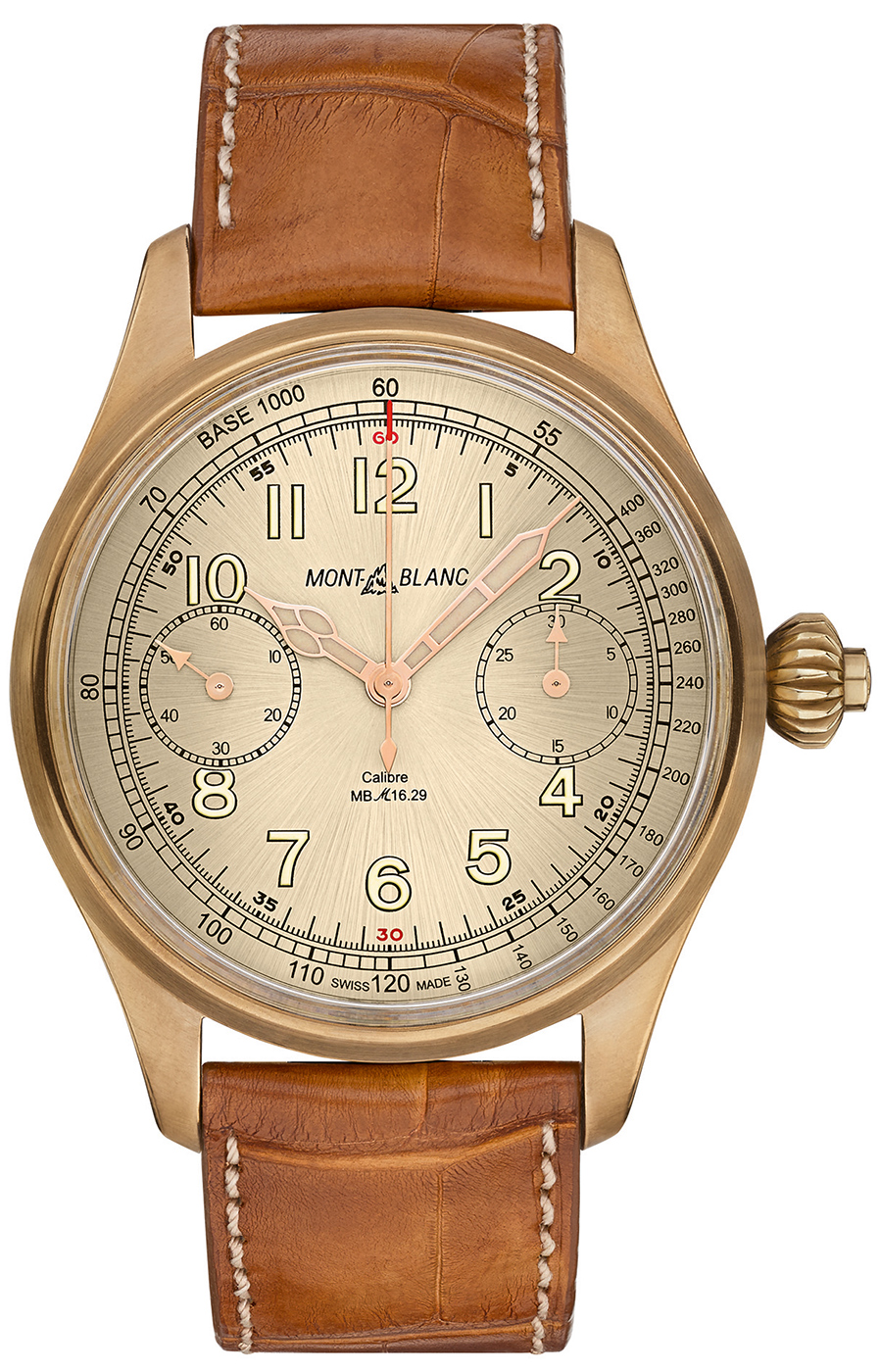 Tarcza w kolorze szampańskim, została ozdobiona szlifem słonecznym. Na jej powierzchni, w układzie horyzontalnym umieszczono dwie sub-tarcze. Ta umieszczona na godzinie 9 pełni rolę tzw. „małej sekundy”, natomiast na totalizatorze umieszczonym na godzinie 3 zliczany jest czas w zakresie do 30 minut. Wokół tarczy naniesiono podziałkę sekundową oraz skalę tachymetru. Szerokie, centralnie osadzone wskazówki są szkieletowane. Ich wypełnienie stanowi Super LumiNova w kolorze beżowym. Tym samym materiałem pokryto arabskie cyfry indeksów godzinowych. Na powierzchni cyferblatu umieszczono także historyczne logo firmy Montblanc. Szkło szafirowe chroniące tarczę jest wypukłe. Zostało ono pokryte warstwą antyrefleksyjną.