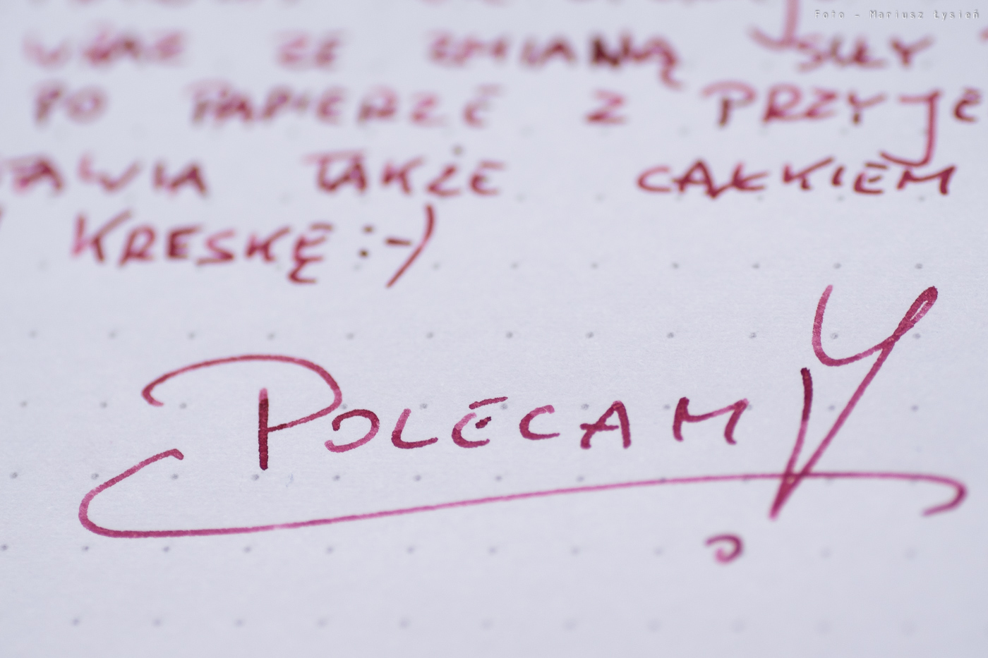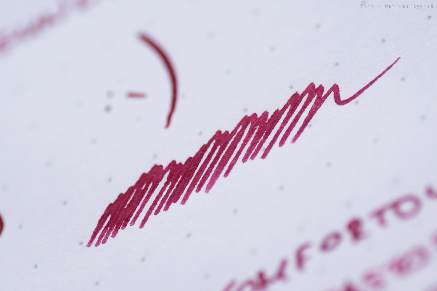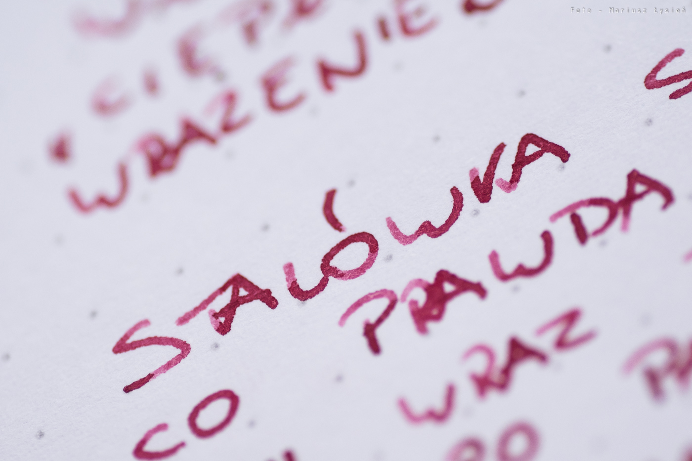 W testowanym piórze zamontowano stalówkę o szerokości EF. Z uwagi na fakt, że preferuję szersze stalówki, często nieufnie podchodzę do tak wąskich „rozmiarówek”. Okazało się, że moje obawy były zupełnie niesłuszne. Stalówka pisze doskonale, z przyjemnym oporem. Zostawia ona także całkiem mokrą jak na EF linię. Co prawda nie uda nam się uzyskać zbyt dużej rozpiętości linii wraz ze zmianą siły docisku, ale to nie jest szczególny problem – zwłaszcza w przypadku cienko piszącej stalówki.