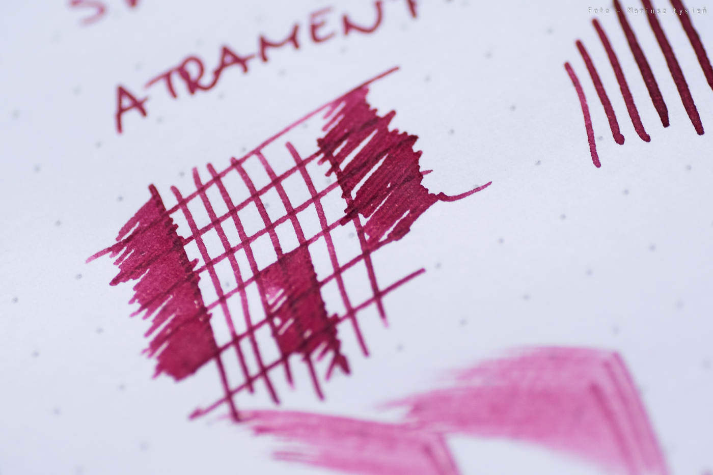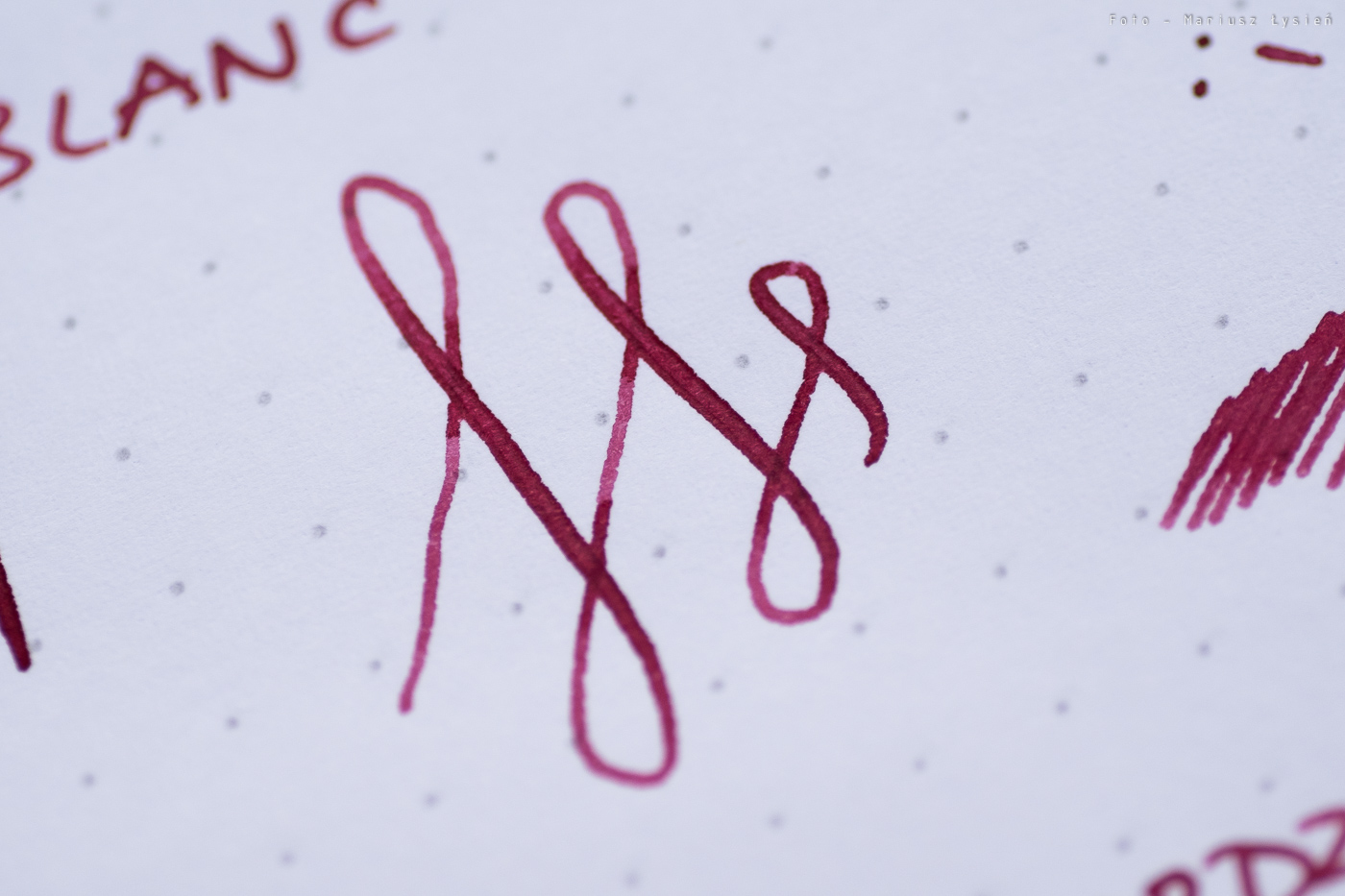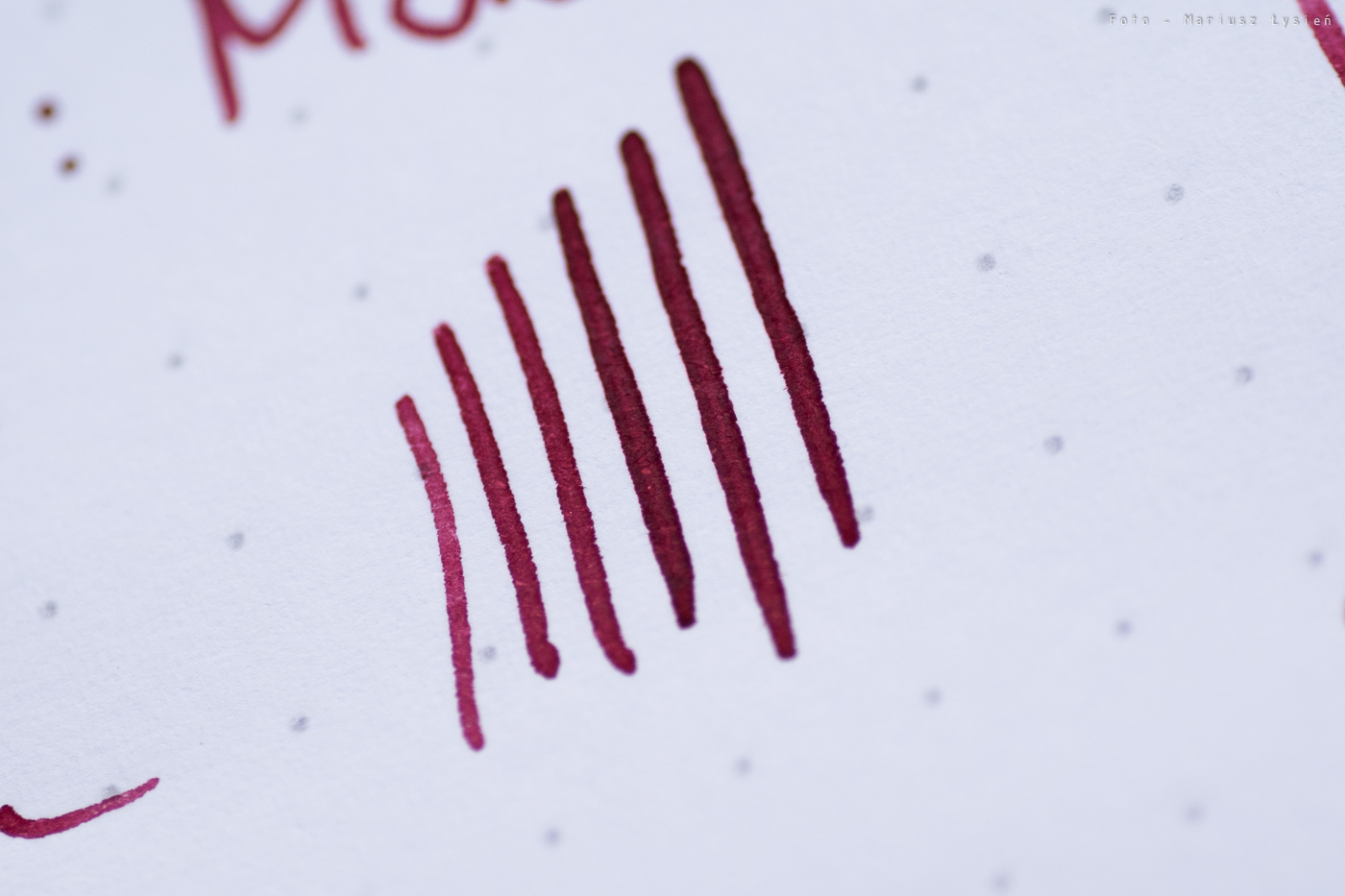 W testowanym piórze zamontowano stalówkę o szerokości EF. Z uwagi na fakt, że preferuję szersze stalówki, często nieufnie podchodzę do tak wąskich „rozmiarówek”. Okazało się, że moje obawy były zupełnie niesłuszne. Stalówka pisze doskonale, z przyjemnym oporem. Zostawia ona także całkiem mokrą jak na EF linię. Co prawda nie uda nam się uzyskać zbyt dużej rozpiętości linii wraz ze zmianą siły docisku, ale to nie jest szczególny problem – zwłaszcza w przypadku cienko piszącej stalówki.