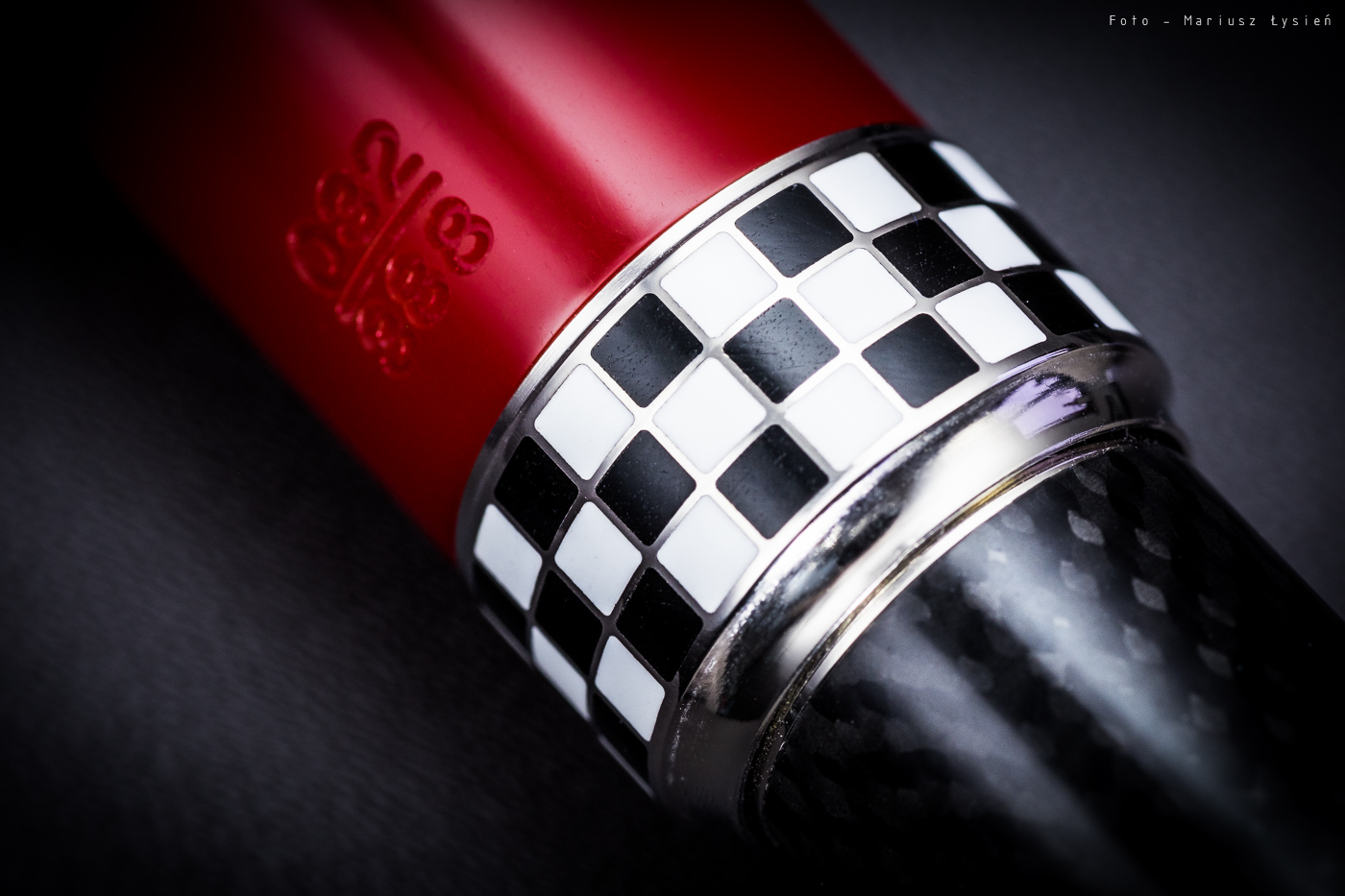 Mowa tutaj przede wszystkim o włóknie węglowym z którego wykonano korpus. Przy takiej ilości tego materiału, jest to rzadki widok w piórze wycenionym mocno poniżej 2000zł. Zastosowanie włókna węglowego w roli głównej najczęściej przywodzi na myśl ceny mniej więcej dwukrotnie wyższe. Włókno węglowe zostało połączone z żywicą w kolorze czerwonym (wykonano z niej zarówno zakończenie korpusu jak i skuwkę). Barwa żywicy jest tak naprawdę wypadkową pomiędzy klasyczną czerwienią, a odcieniem „lekko wiśniowym”. Jej głęboki kolor doskonale komponuje się z włóknem węglowym. Oba materiały rozdzielono wykonanymi z metalu pierścieniami. Taki zabieg stylistyczny sprawił, że wizualnie udało się ukryć gwint służący do mocowania skuwki podczas, gdy pióro jest zamknięte. Ciekawym spostrzeżeniem jest fakt, że poprzez zastosowanie włókna węglowego, pióro jest przyjemne i „ciepłe” w dotyku.