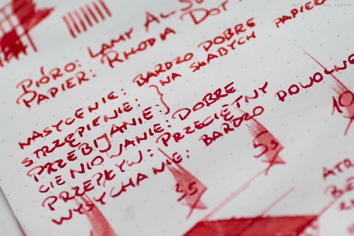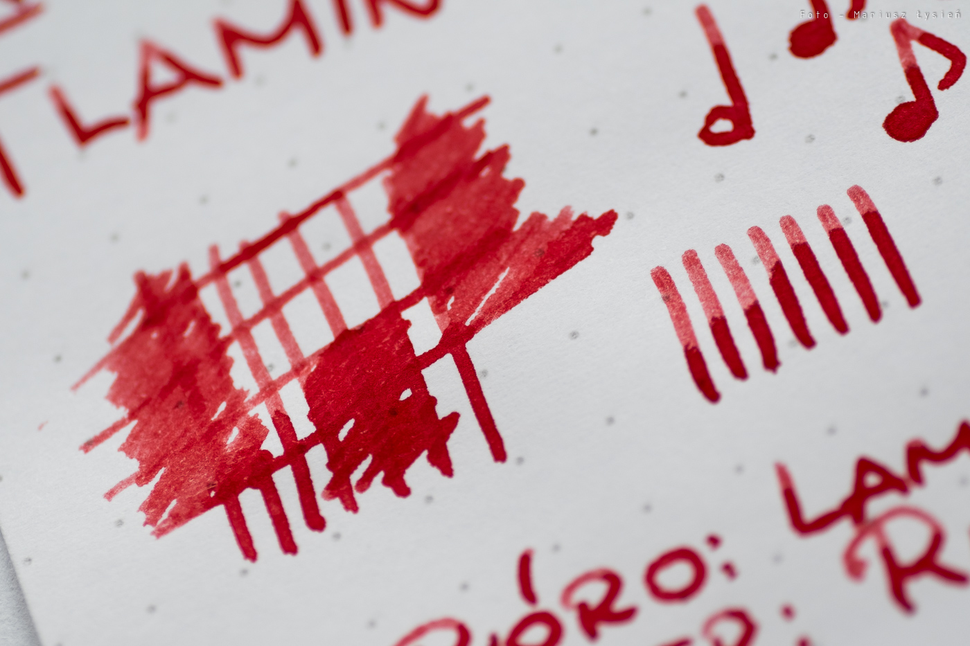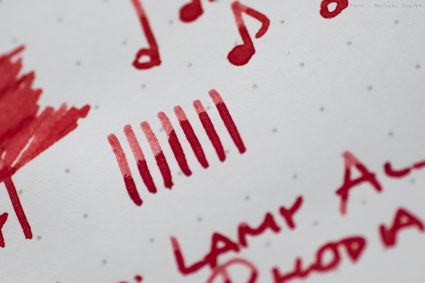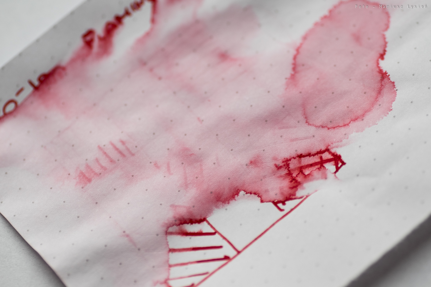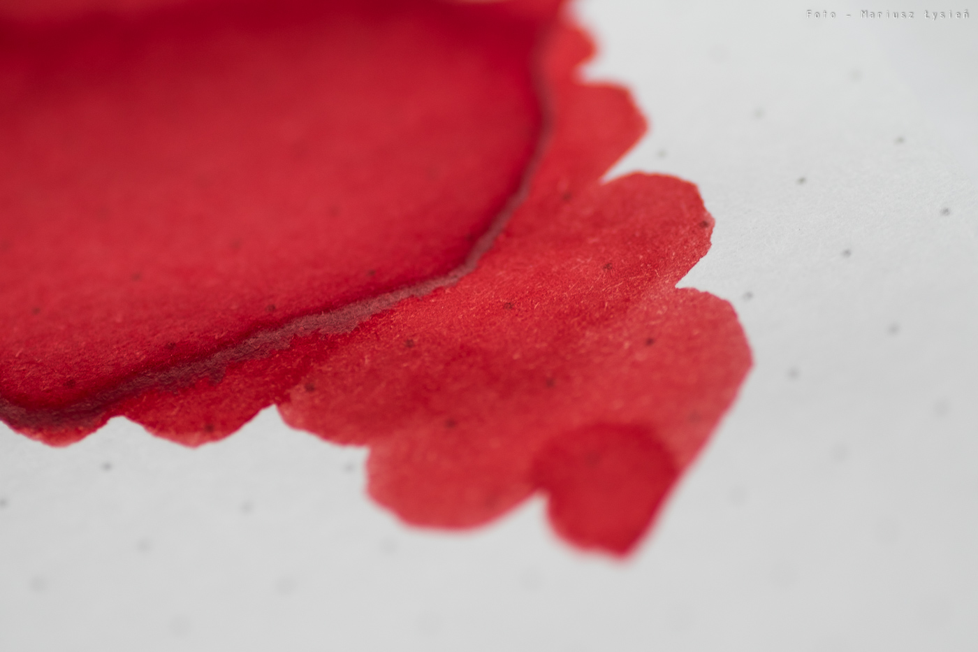 Już po kolorze cieczy zawartej w butelce można łatwo wywnioskować z jakimi barwami będziemy mieli do czynienia. Atrament zasadniczo ma kolor czerwony, jednak bez trudu odnajdziemy w nim domieszkę pomarańczu i różu. To raczej specyficzne połączenie. Dla osób lubiących takie odcienie, inkaust ten z pewnością będzie ciekawą propozycją. Barwa jest mocno nasycona i żywa, dzięki czemu na papierze prezentuje się atrakcyjnie.