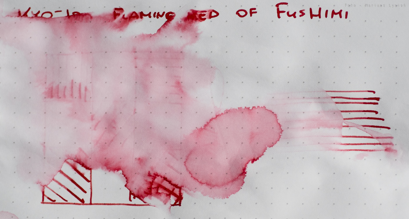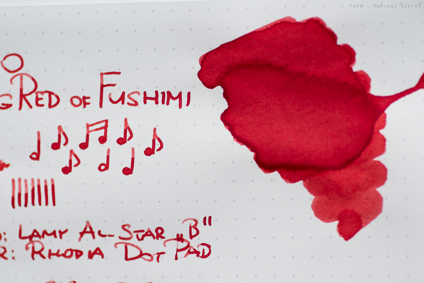 Trzecim testowanym przez nas atramentem z serii Kyo-iro jest inkaust noszący dosyć enigmatyczną nazwę „Flaming Red of Fushimi”. Tak naprawdę ma ona odzwierciedlać charakterystyczną dla wielu japońskich świątyń pomarańczowo-czerwoną barwę.