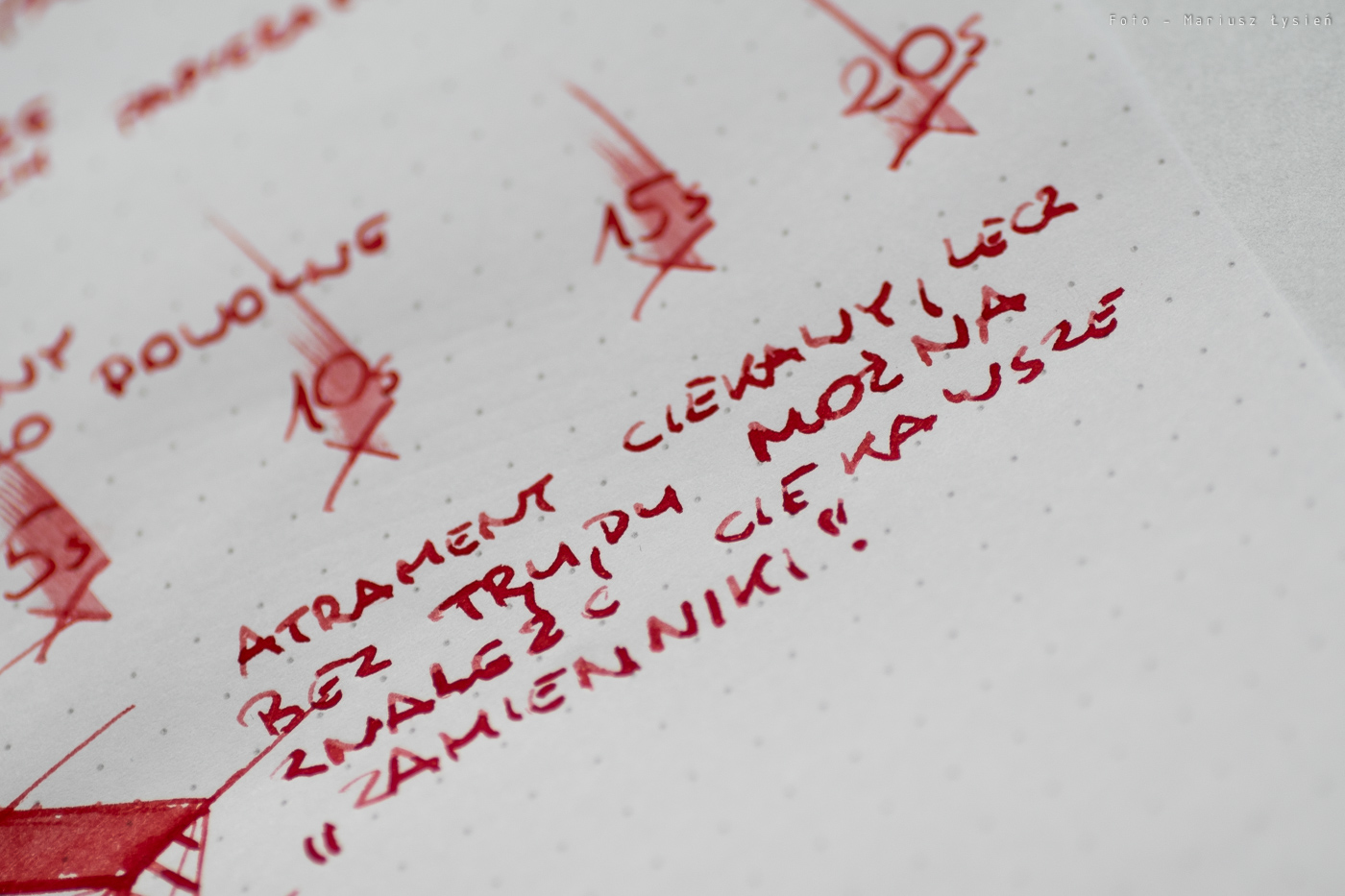 Ponarzekać trzeba na przepływ. Wydawać by się mogło, że powinno być dobrze, gdyż ciecz nie wygląda na gęstą, jednak były momenty, kiedy musiałem walczyć o to, by na papierze pozostał odpowiednio wyraźny ślad. Takich problemów nie odnotowałem w poprzednich dwóch atramentach z tej serii, więc podejrzewałem, że w tym przypadku również będzie dobrze lub nawet bardzo dobrze.