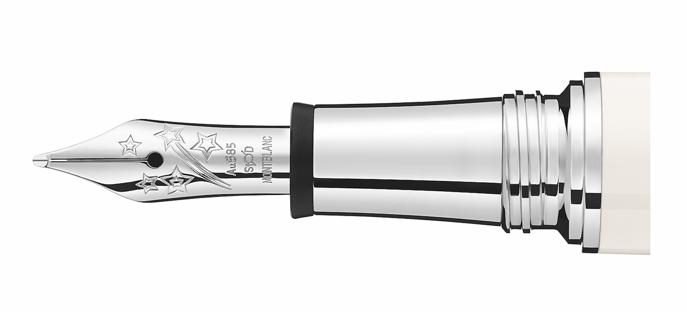 Stalówkę wykonano ze złota próby Au585 z delikatnym motywem spadającej gwiazdy. Kolorystyka, czyli biel połączona z czernią, świetnie komponuje się z elementami platynowanymi. Skuwka i korpus wykonane zostały z żywicy w kolorze białym, zakończenie skuwki i korpusu to czarna żywica. Montblanc powrócił do klipu o delikatnej linii – “teardrop clip”, idealnie pasującego do opływowych kształtów pióra. Na skuwce zobaczymy platynowany pierścień z naniesionym napisem „Montblanc”. Zwieńczenie skuwki utrzymano w stylu art deco, tradycyjnie naniesiono na nim logo Montblanc`a. Platynowana sekcja zakończona jest pierścieniem w kolorze czarnym. Całość utrzymana jest w bardzo minimalistycznym i eleganckim design`ie.