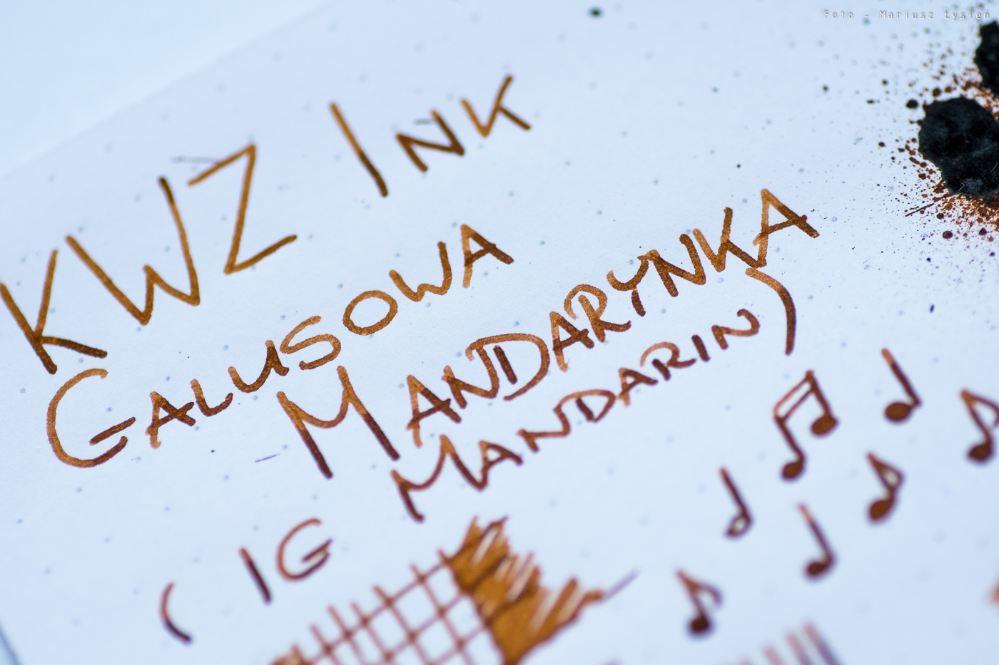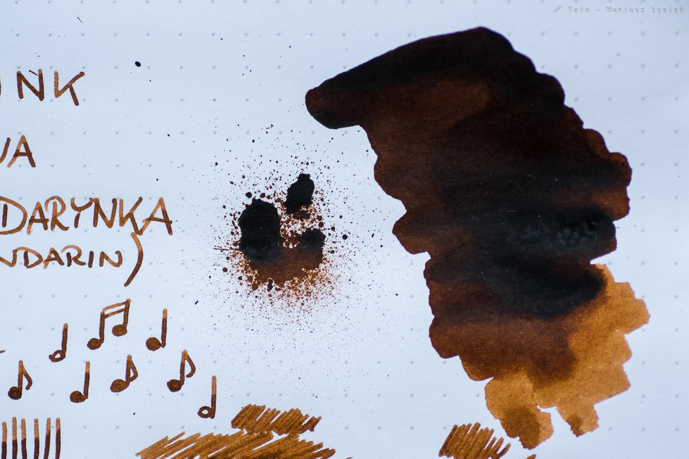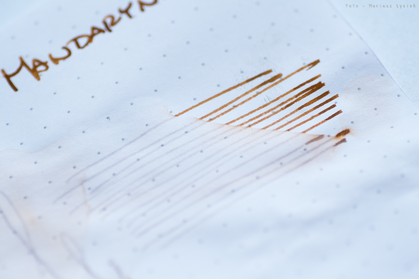 Dopiero co naniesiony na papier atrament ma faktycznie mandarynkowy kolor, jednak wraz z wysychaniem zamienia się on w barwę rdzawo-pomarańczowo-brązową. Zapisany tekst jest bardzo czytelny. Kolor jest wg. mnie rewelacyjny – nie jest ani za jasny, ani też zbyt ciemny. Myślę, że każdy miłośnik atramentów o podobnej kolorystyce będzie z niego zadowolony.