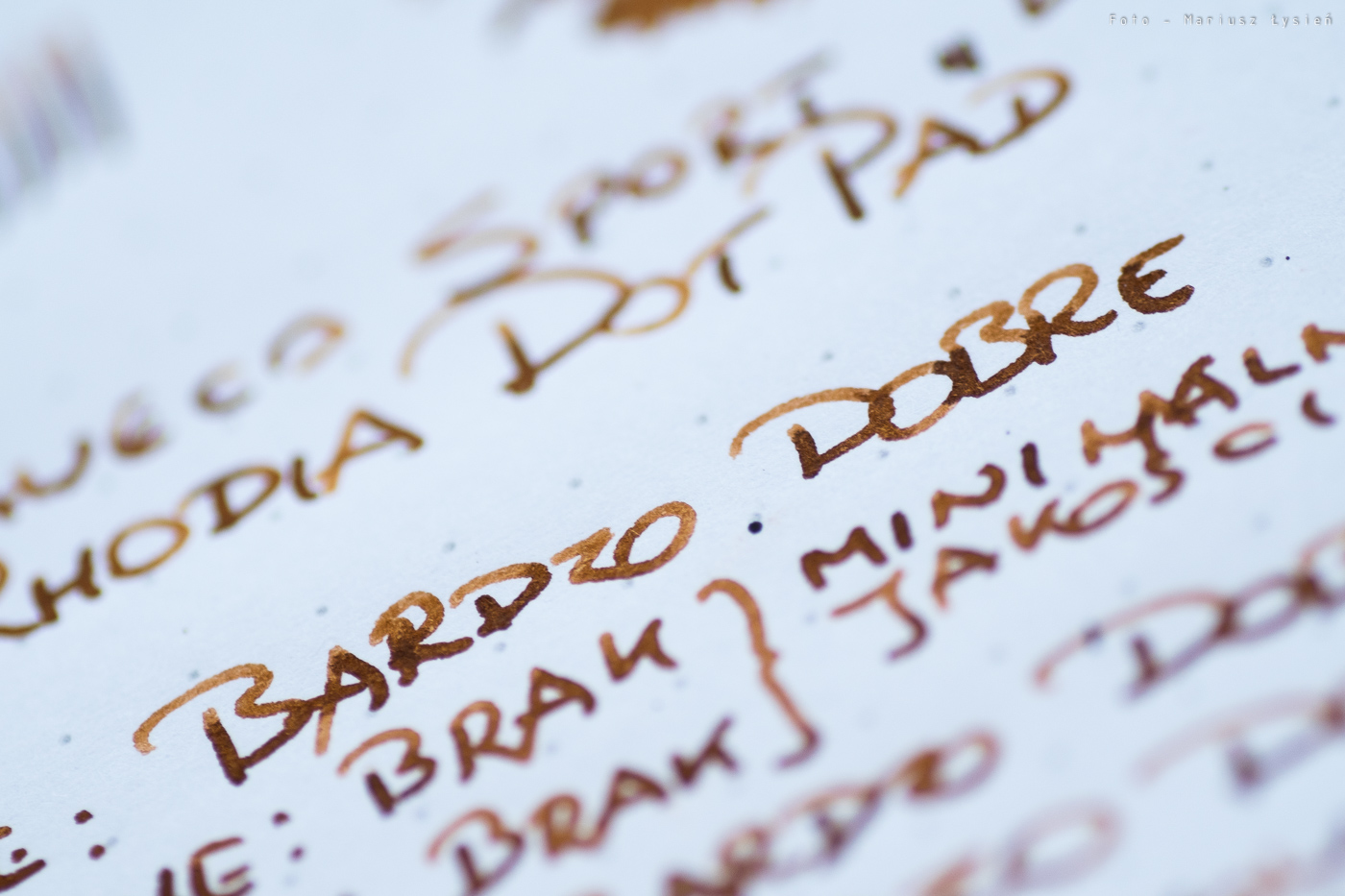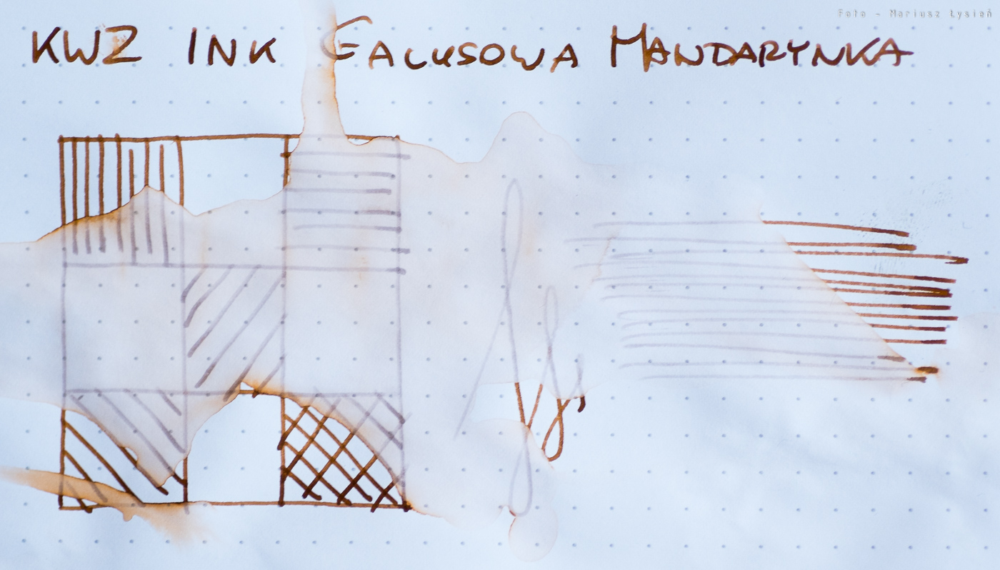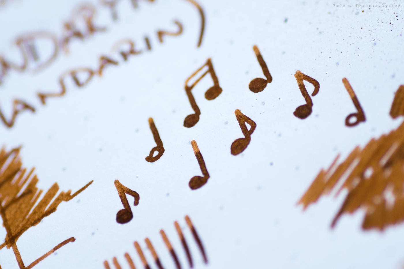 Dopiero co naniesiony na papier atrament ma faktycznie mandarynkowy kolor, jednak wraz z wysychaniem zamienia się on w barwę rdzawo-pomarańczowo-brązową. Zapisany tekst jest bardzo czytelny. Kolor jest wg. mnie rewelacyjny – nie jest ani za jasny, ani też zbyt ciemny. Myślę, że każdy miłośnik atramentów o podobnej kolorystyce będzie z niego zadowolony.