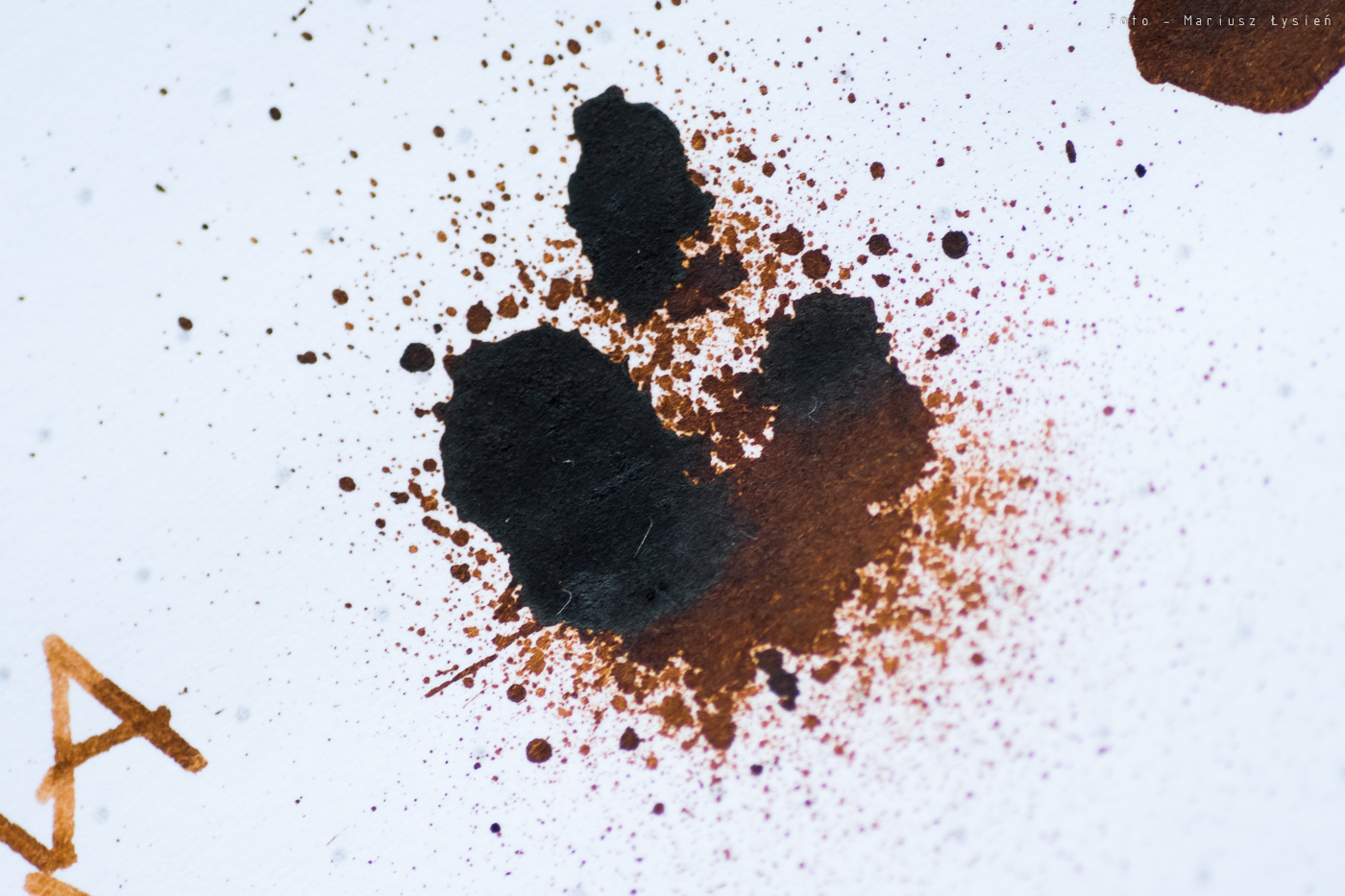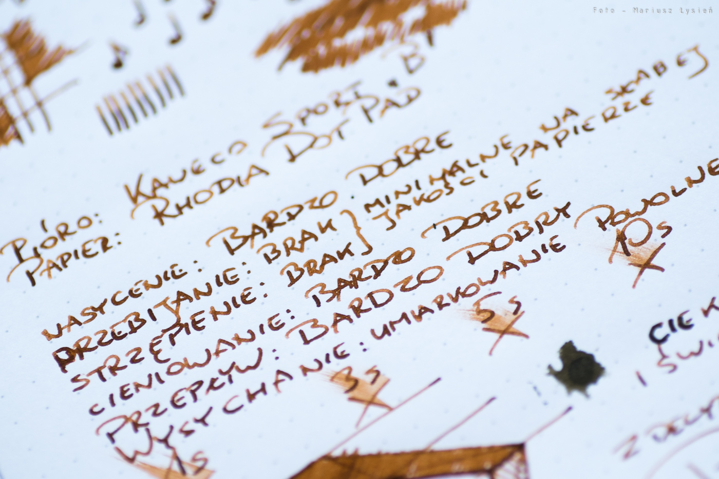 Cieniowanie jest bardzo dobre, chociaż widać, że atrament ten ma jeszcze większe możliwości, które mogą się objawić po zastosowaniu fleksującej i podającej sporo atramentu stalówki. W końcu spora część „kleksa” jest prawie czarna. Niemniej w przypadku pióra Kaweco Sport ze stalówką „B” też zapisany tekst prezentuje się atrakcyjnie.
