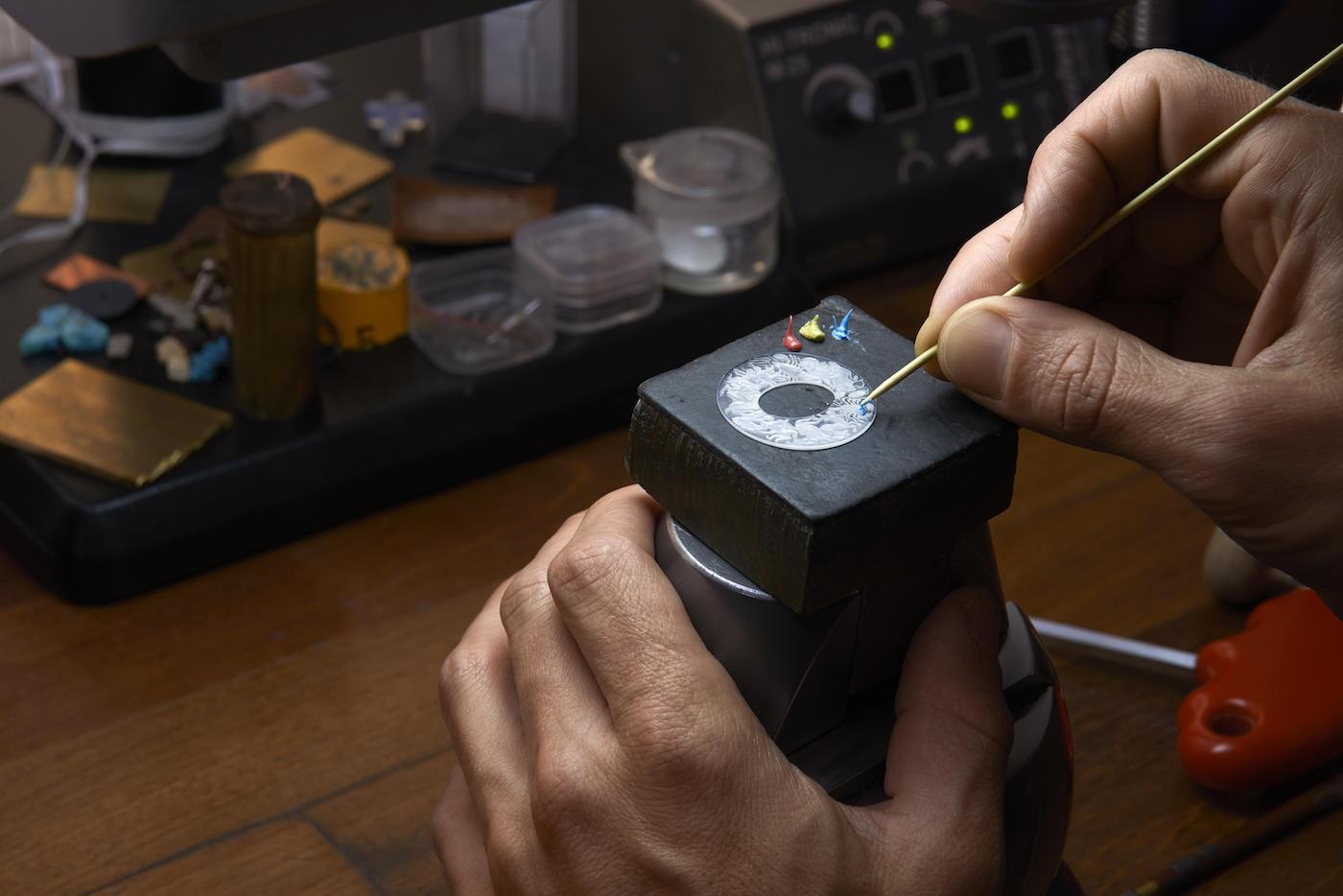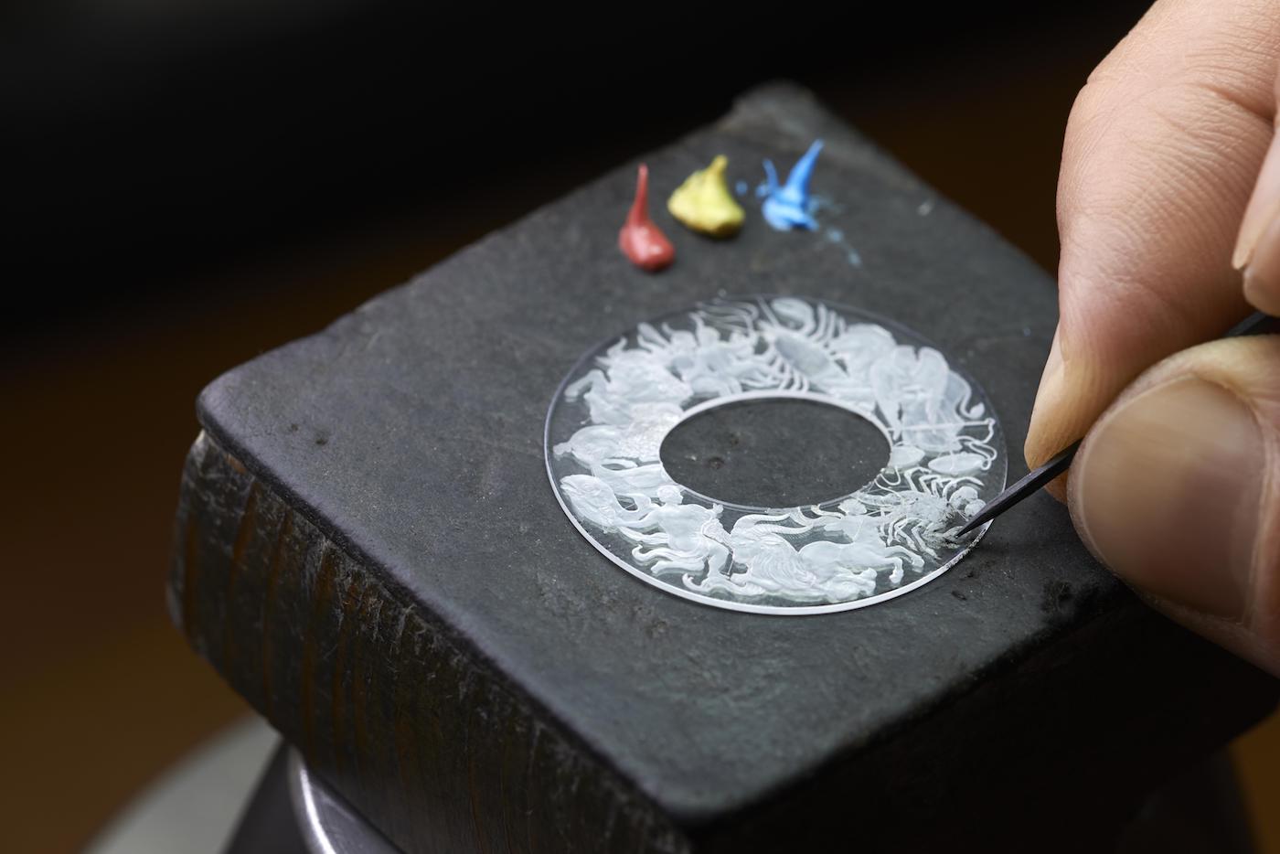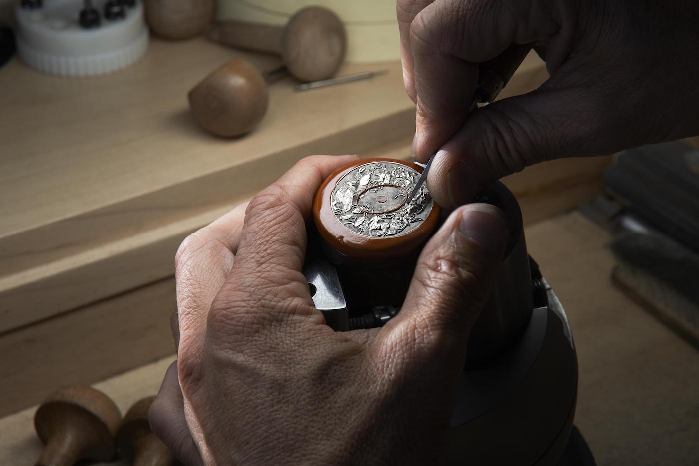 - grawerowana – jest to wariant w którym tarczę graweruje się ręcznie. Za materiał wyjściowy służy krążek wykonany z białego złota. Całość wykonywana jest pod dużym powiększeniem, tak by późniejszy nabywca oglądający cyferblat przez szkło powiększające mógł cieszyć się niezwykłymi detalami. W tym miejscu trzeba przyznać, że dokładność zarówno tego jak i innych wariantów jest niezwykła. Interesująco przedstawia się kontrast pomiędzy powierzchniami matowymi oraz polerowanymi (wśród których najmocniej wyróżniają się elementy wykonane z żółtego złota).
