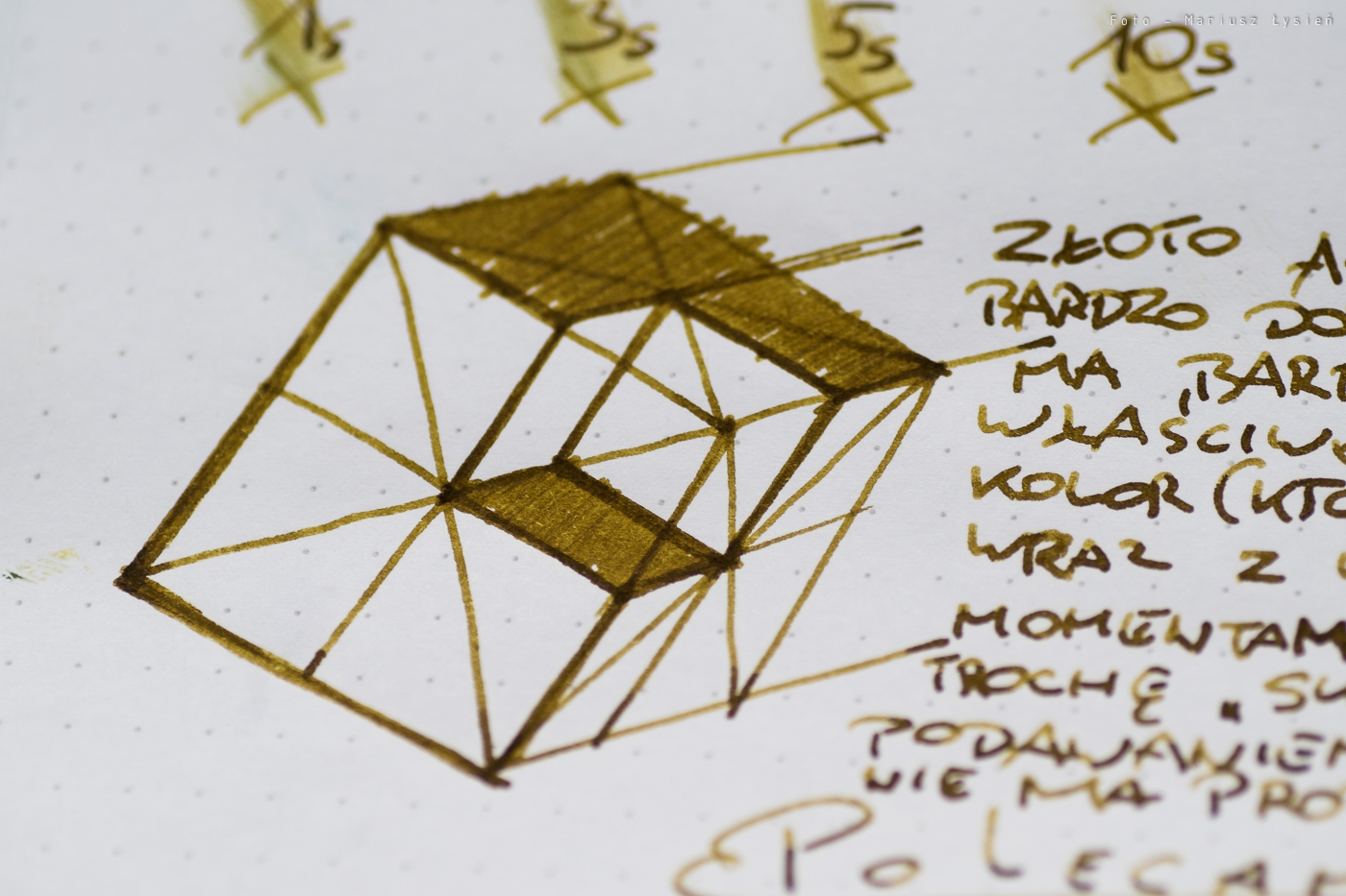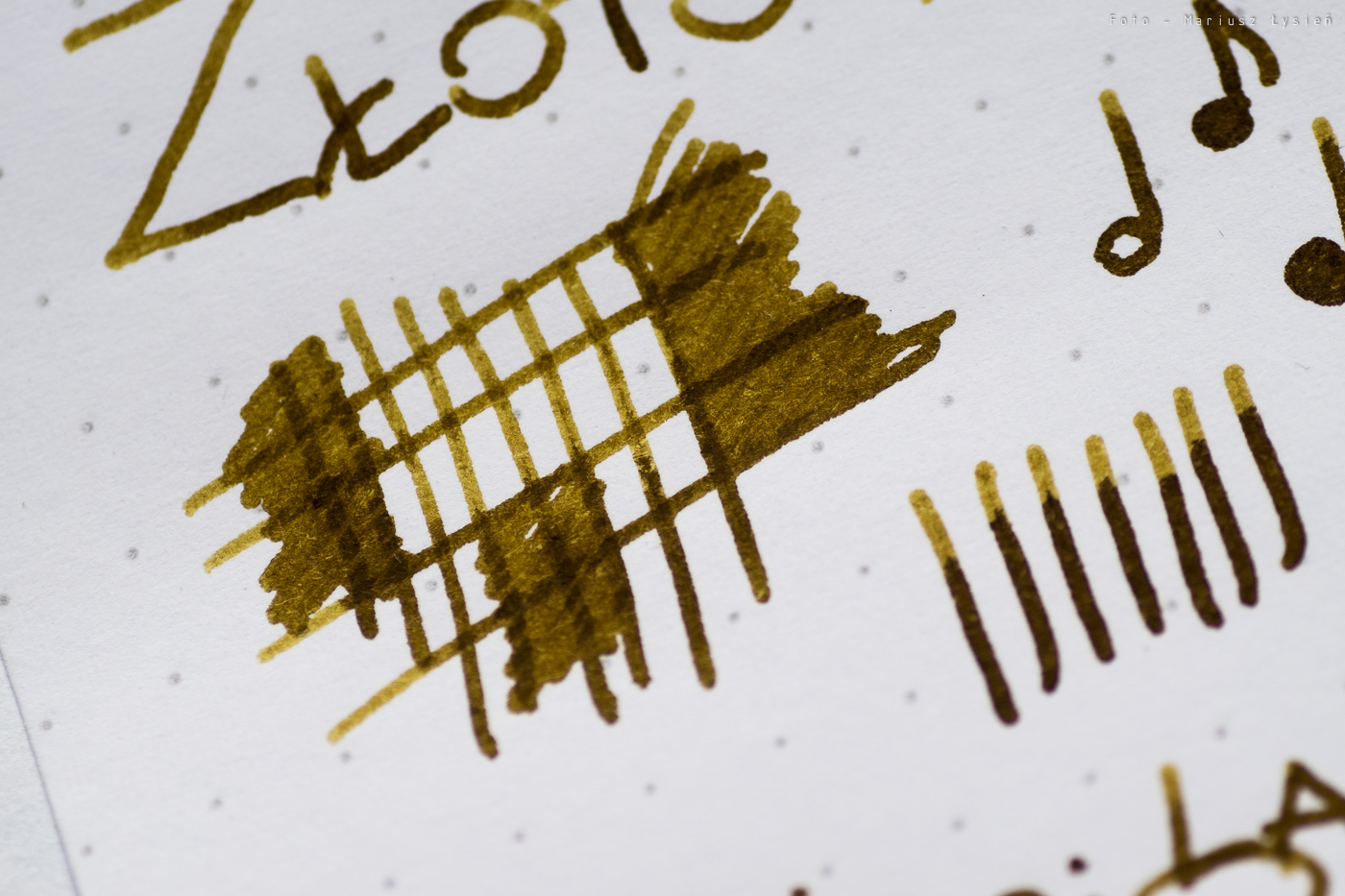 Nazwa jest nieco problematyczna. Faktycznie, gdy atrament jest dopiero co nałożony na papier, wtedy widoczna jest jego „złota” natura. Ciecz jest wtedy mocno nakierowana w stronę barwy żółtej. Wraz z wysychaniem kolor jednak mocno brązowieje. W takim wypadku trudno już doszukać się „złota”. Niezależnie od tego faktu, barwa atramentu jest ciekawa.