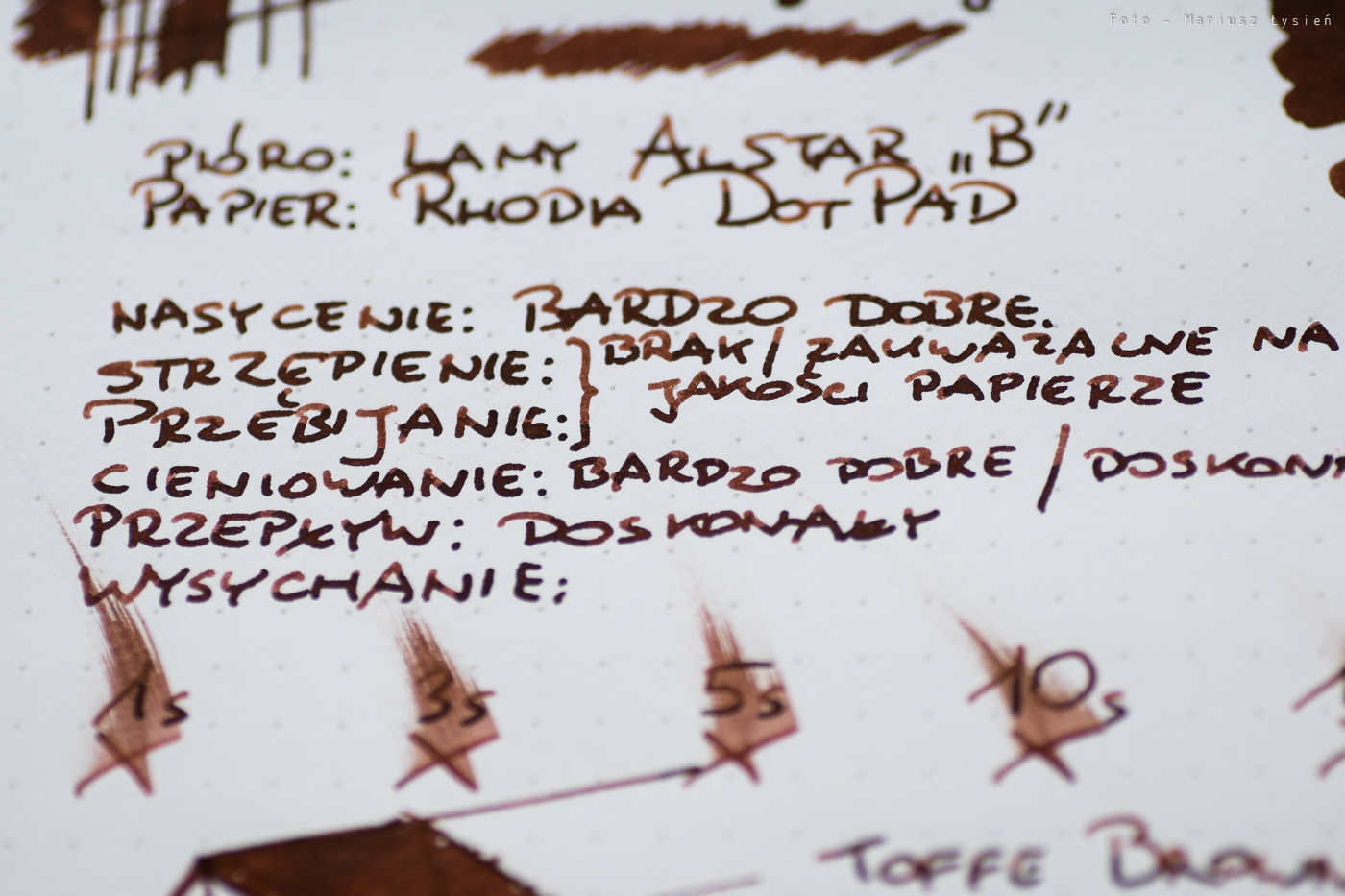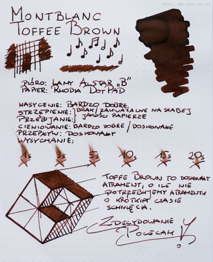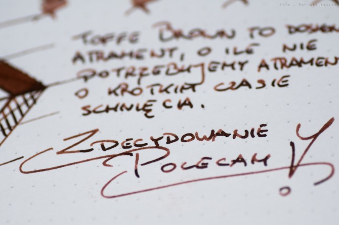 Montblanc Toffee Brown to doskonały atrament, o ile nie poszukujemy inkaustu wodoodpornego i szybkoschnącego. W pozostałych przypadkach jeżeli tylko preferujemy brązy, będzie to z pewnością dobry wybór, gdyż stosunek cena/jakość jest doskonały. Zdecydowanie polecam, gdyż jest to jeden z moich ulubionych brązowych atramentów.