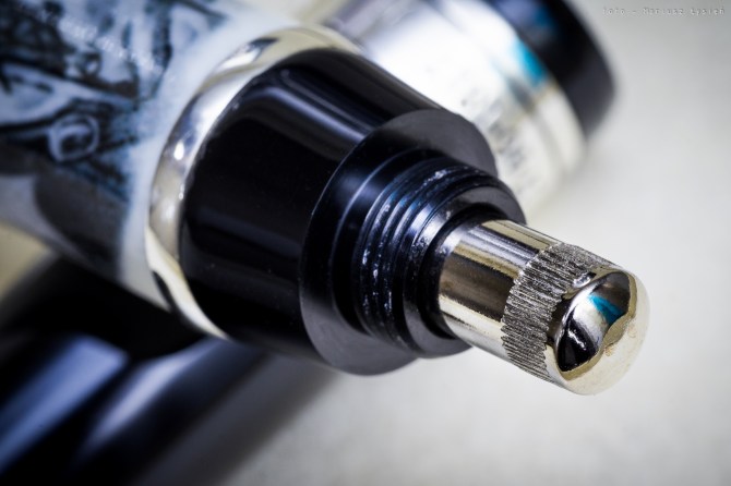 Pióro napełniane jest za pomocą wbudowanego wewnątrz tłoka, którego pokrętło ukryto pod zakręcanym zakończeniem korpusu.
