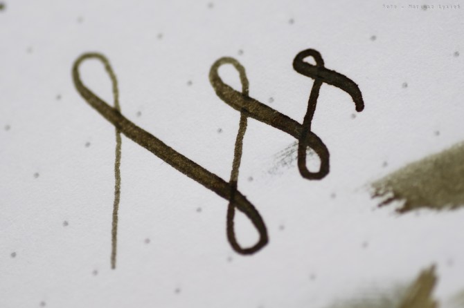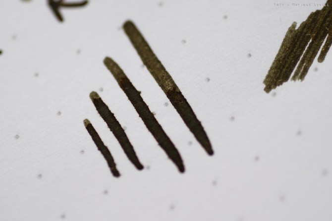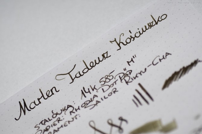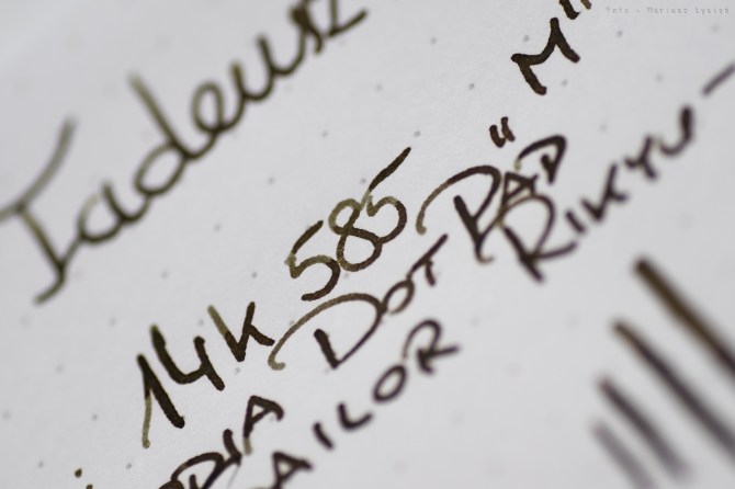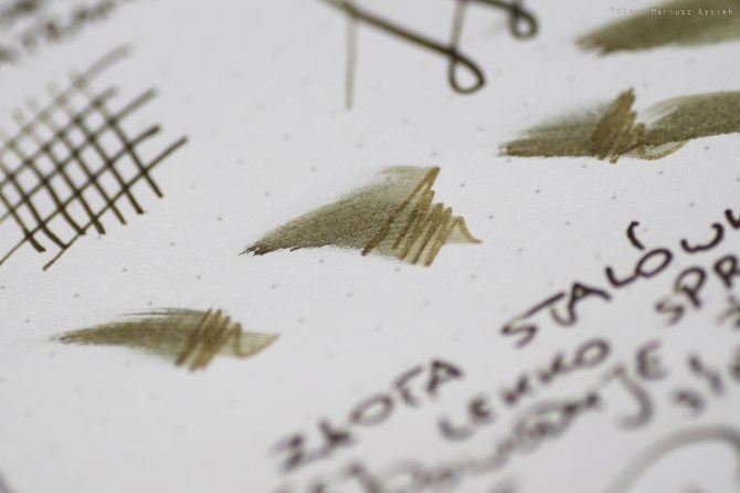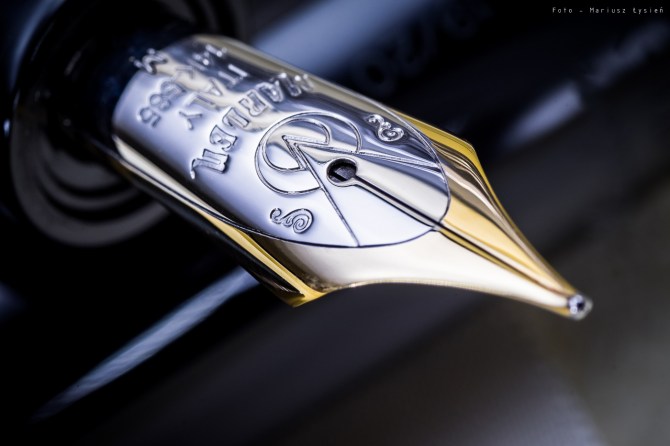 Stalówkę wykonano z 14 karatowego złota. Pisze ona wyśmienicie. Sunie gładko po papierze, a atrament podawany jest niezwykle sprawnie. Stalówka ta cechuje się także przyjemną sprężystością. Widać to zresztą po możliwej do otrzymania palecie grubości, które stalówka ta potrafi kreślić. Doskonała stalówka – mogę ją polecić z czystym sumieniem. W testowanym piórze zamontowana była ona w rozmiarze „M”.