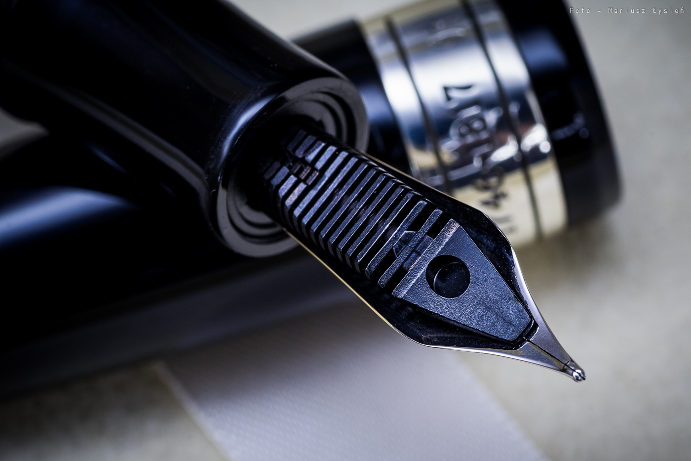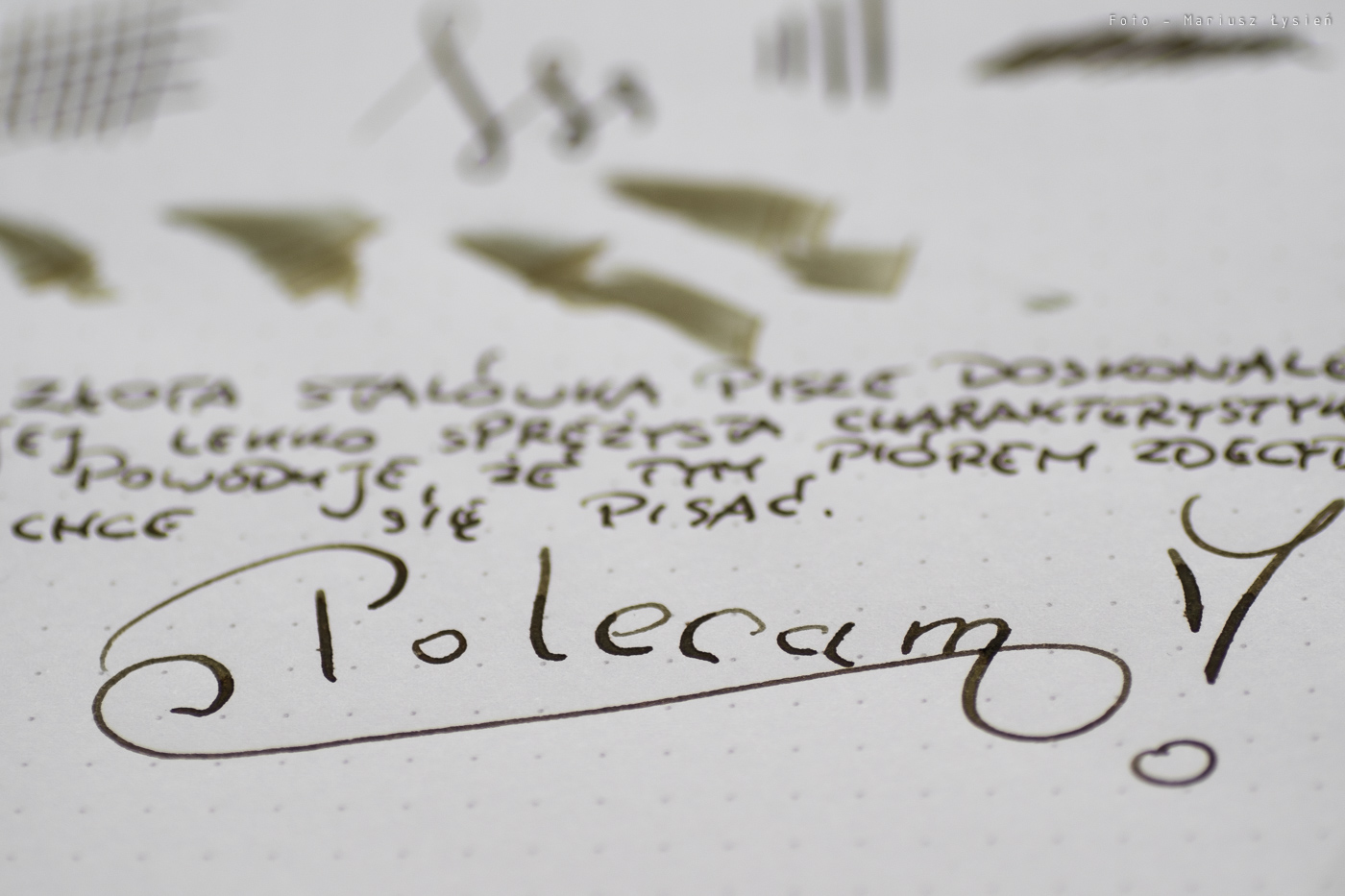 Stalówkę wykonano z 14 karatowego złota. Pisze ona wyśmienicie. Sunie gładko po papierze, a atrament podawany jest niezwykle sprawnie. Stalówka ta cechuje się także przyjemną sprężystością. Widać to zresztą po możliwej do otrzymania palecie grubości, które stalówka ta potrafi kreślić. Doskonała stalówka – mogę ją polecić z czystym sumieniem. W testowanym piórze zamontowana była ona w rozmiarze „M”.