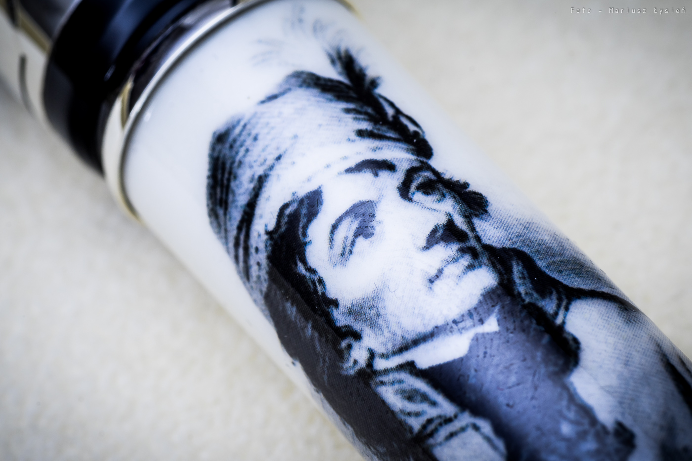 Główny element korpusu wykonano z jasnej ceramiki. Na jego powierzchni umieszczono podobiznę bohatera tej edycji. Element ten jest wykonany bardzo starannie, chociaż faktura samego obrazka nie sugeruje, aby był on malowany ręcznie. Wydaje mi się, że w tym przypadku można byłoby się pokusić o tradycyjny malunek, chociaż trzeba przyznać, że nawet monochromatyczne malowidła na ceramice nie są proste do wykonania. Trzeba też uczciwie przyznać, że wspomniana faktura widoczna jest jedynie pod naprawdę dużym powiększeniem.