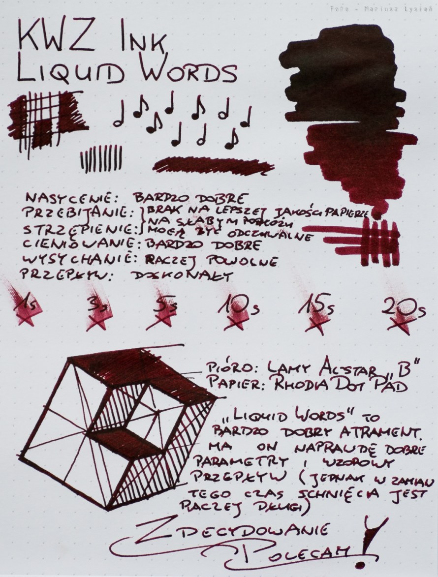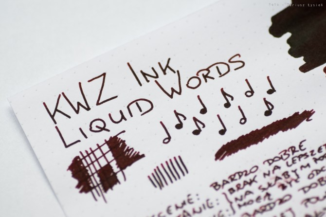 KWZ Ink Liquid Words to naprawdę świetny atrament. Produkt ten ma znakomite właściwości, wobec czego trudno go nie polecić. Dlatego jeżeli tylko będziecie obecni na Pen Show Poland w tym roku i/lub lubicie atramenty w tym kolorze, to zachęcam do zakupu tego inkaustu. Będą to napewno dobrze ulokowane pieniądze. Miałem też odnieść się do Sailora BungBox Piano Mahogany co niniejszym czynię. O ile podobał Wam się jego kolor to tym bardziej polecam zakup tegorocznej edycji specjalnej atramentu KWZ Ink. Dlaczego? Otóż Liquid Words moim zdaniem właściwie w niczym mu nie ustępuje (Sailor co prawda szybciej wysycha i oferuje lepszą wodoodporność, ale umówmy się, że to nie są kluczowe kwestie w codziennym użytkowaniu dla większości z nas), natomiast jest kilkukrotnie tańszy (atramenty Sailor z serii BungBox zresztą same w sobie należą do najdroższych na świecie). Liquid Words to bardzo dobra jakość w jeszcze lepszej cenie.