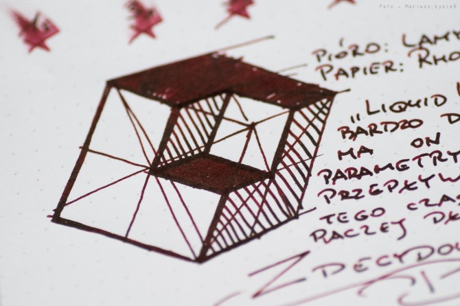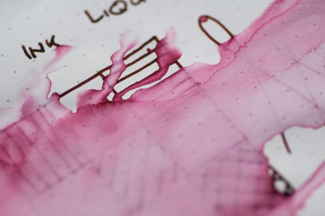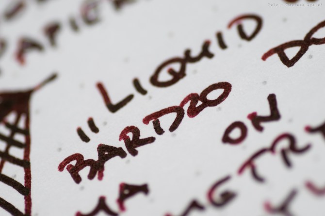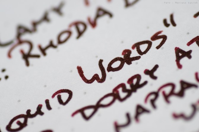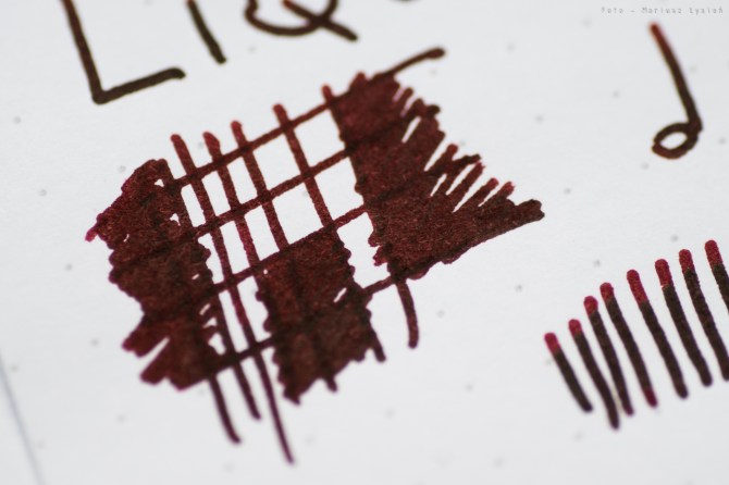 Gdy dowiedziałem się, że Liquid Words ma być „atramentem w kolorze ciemnej czerwieni bądź wiśni” zmartwiłem się. Dlaczego? Ano dlatego, że takie inkausty owszem podobają mi się w chwili zakupu, jednak szybko entuzjazm opada, przez co następnie sięgam po inne barwy. Jaki jest faktycznie Liquid Words? Moim zdaniem barwę trudno opisać. Generalnie można przyznać, że faktycznie jest to barwa bardzo ciemnej, mocno dojrzałej wiśni. Jest ona na tyle ciemna, że niektórzy być może pomylą ten kolor z ciemnym brązem o dużym udziale czerwieni. To właśnie sprawia, że atrament ten będzie w pełni użytecznych podczas codziennego użytkowania.