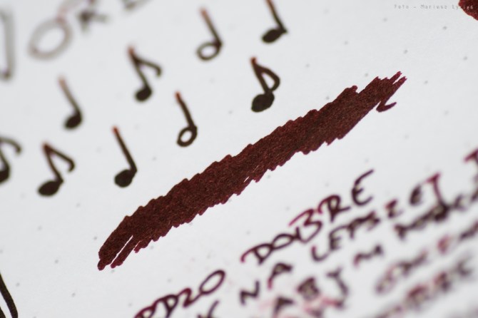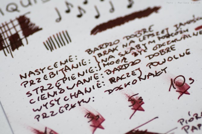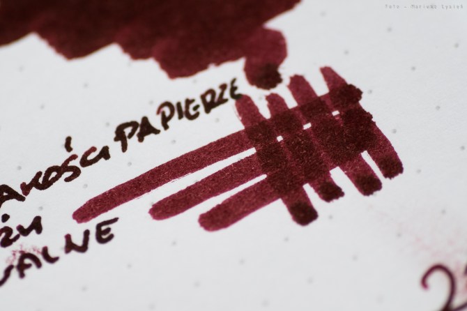 Nasycenie jest bardzo dobre. Kolor jest pełny i wyrazisty, chociaż dosyć ciemny. W użyciu z bardzo mokrą stalówką może sprawiać wrażenie bardzo ciemnego bordo. Przebijania i strzępienia nie odnotowałem na lepszych jakościowo papierach. Na słabszej jakości podłożach oba te zjawiska mogą być jednak odczuwalne (szczególnie przebijanie).