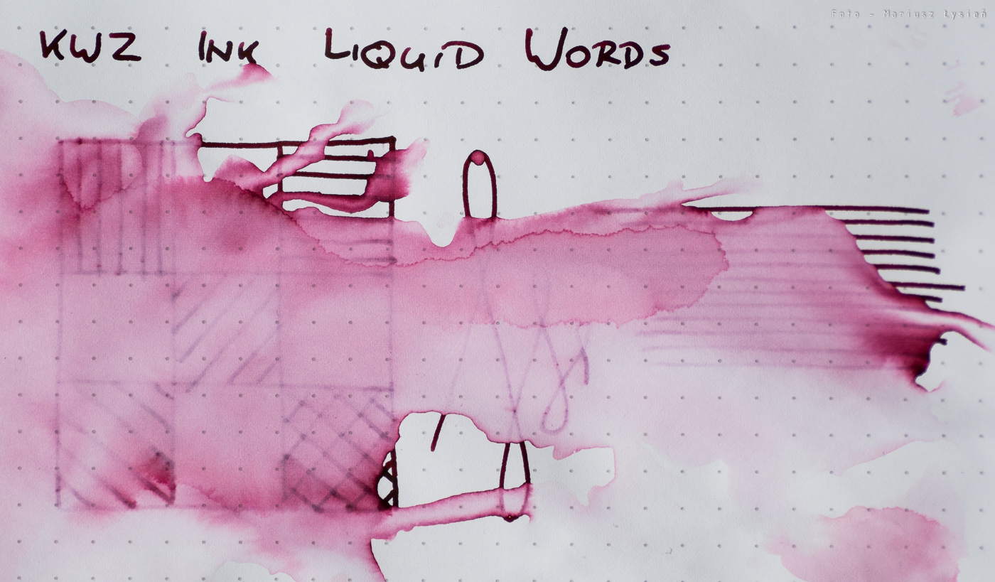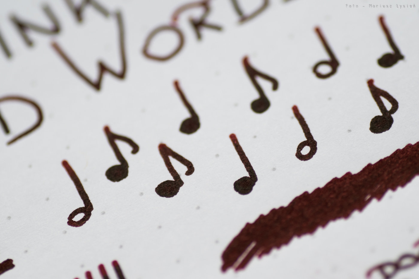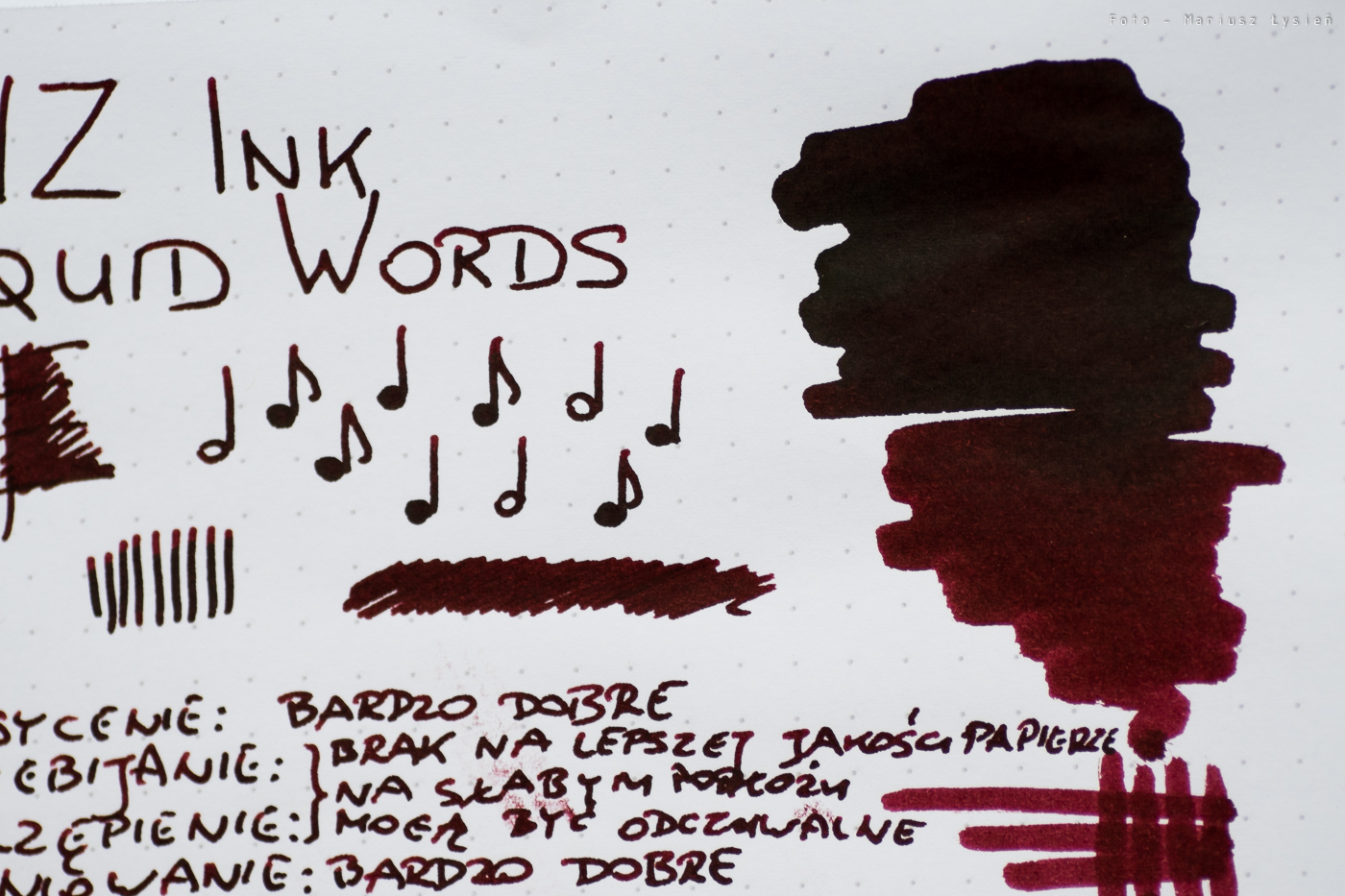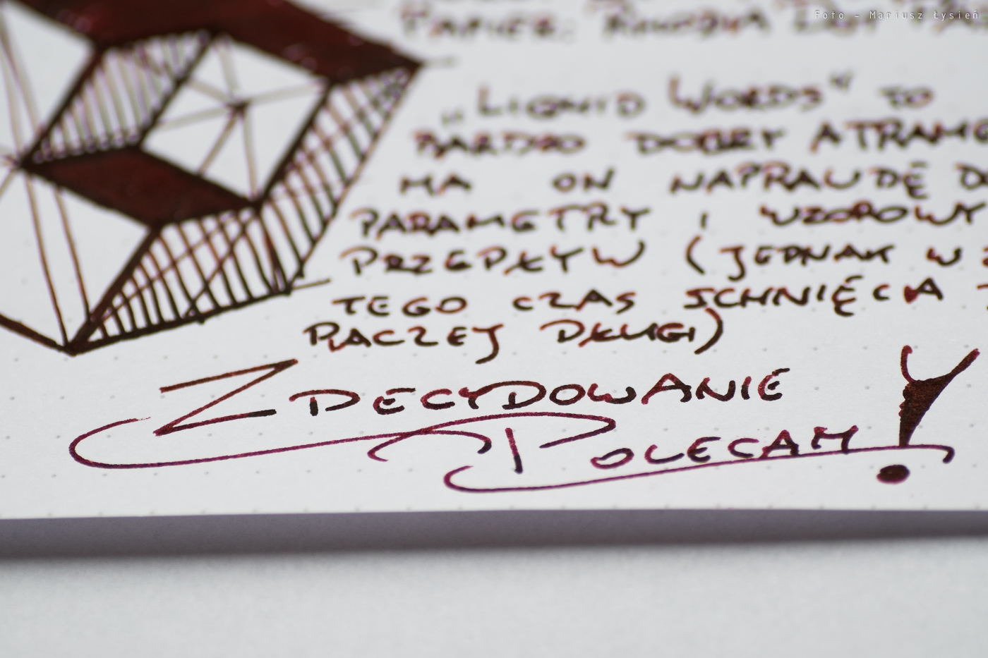 Gdy dowiedziałem się, że Liquid Words ma być „atramentem w kolorze ciemnej czerwieni bądź wiśni” zmartwiłem się. Dlaczego? Ano dlatego, że takie inkausty owszem podobają mi się w chwili zakupu, jednak szybko entuzjazm opada, przez co następnie sięgam po inne barwy. Jaki jest faktycznie Liquid Words? Moim zdaniem barwę trudno opisać. Generalnie można przyznać, że faktycznie jest to barwa bardzo ciemnej, mocno dojrzałej wiśni. Jest ona na tyle ciemna, że niektórzy być może pomylą ten kolor z ciemnym brązem o dużym udziale czerwieni. To właśnie sprawia, że atrament ten będzie w pełni użytecznych podczas codziennego użytkowania.