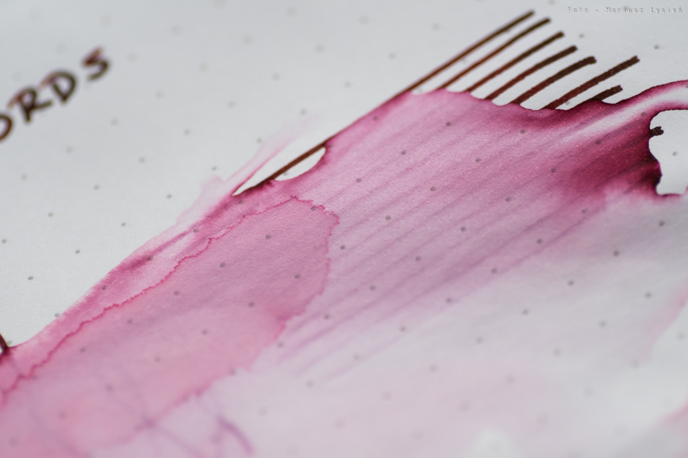 Nasycenie jest bardzo dobre. Kolor jest pełny i wyrazisty, chociaż dosyć ciemny. W użyciu z bardzo mokrą stalówką może sprawiać wrażenie bardzo ciemnego bordo. Przebijania i strzępienia nie odnotowałem na lepszych jakościowo papierach. Na słabszej jakości podłożach oba te zjawiska mogą być jednak odczuwalne (szczególnie przebijanie).