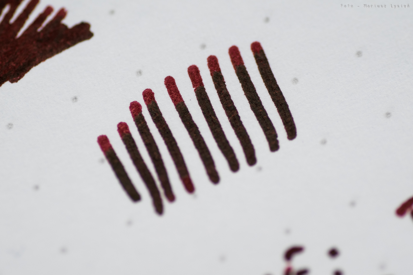 Cieniowanie jest moim zdaniem bardzo dobre, chociaż trzeba wziąć poprawkę na ciemną barwę atramentu. Pomimo tego cieniowanie jest widoczne. Przepływ jest doskonały. Powiedziałbym, że wręcz wzorcowy. Pióro napełnione tym atramentem sunie gładko i aksamitnie po powierzchni kartki papieru. Po prostu „wow”.