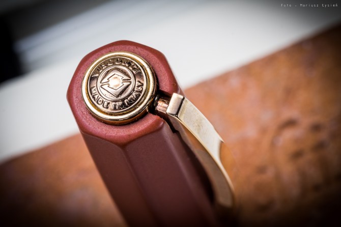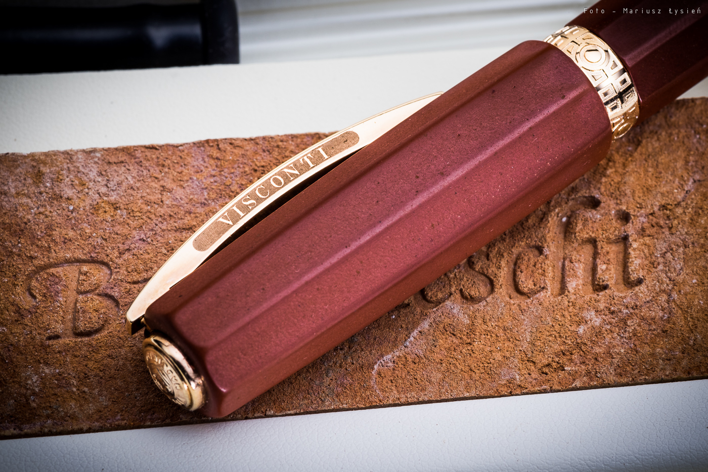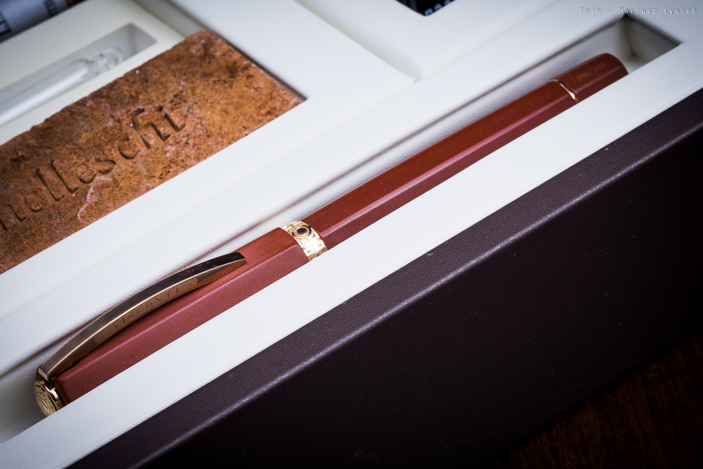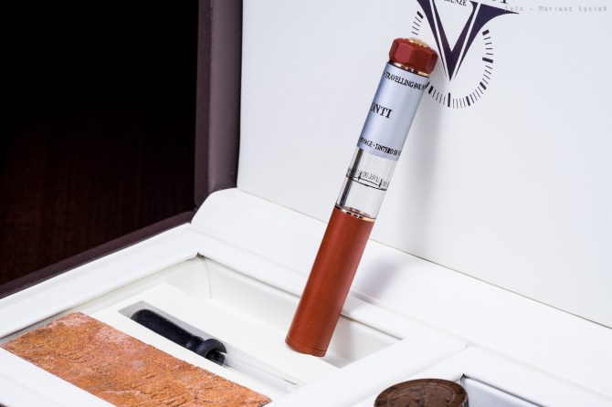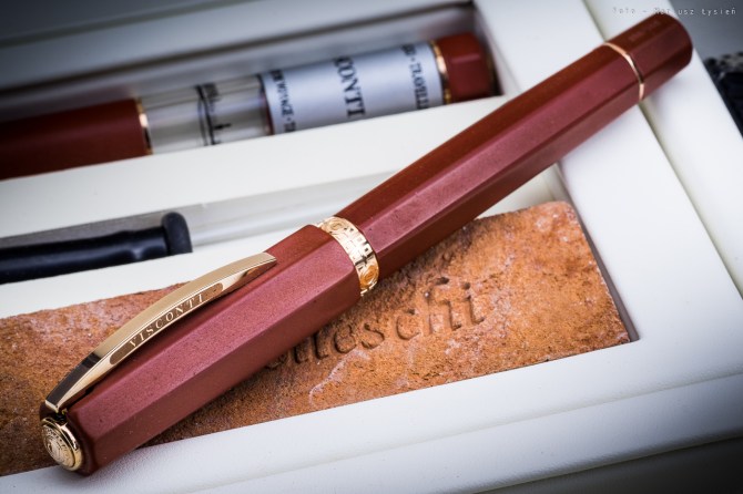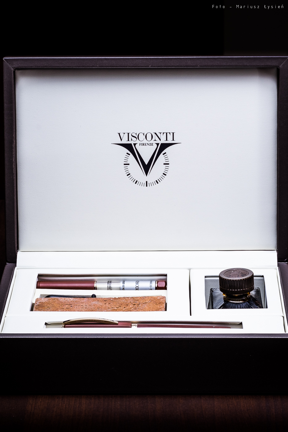 Pióro zapakowane jest w kartonowe opakowanie, które skrywa pokrowiec będący tak naprawdę dopiero wierzchnią warstwą. W jego wnętrzu znajdziemy sporej wielkości kasetkę, której powierzchnia została wykończona ekoskórą. Materiał ten jest jednak na tyle dobrej jakości, że niejeden się pomyli nie wiedząc jaki rodzaj skóry to jest. Na górze opakowania nabito sporej wielkości logo producenta. Po otwarciu kasety naszym oczom ukazuje się kremowe wnętrze, które zawiera podobnie jak w przypadku modelu Speakeasy, kilka ciekawych elementów. Poza piórem wiecznym, instrukcją oraz kartą potwierdzającą autentyczność produktu, znajdziemy tam pipetę do napełniania dołączonego kałamarza podróżnego. Kałamarz ten od wielu lat jest stałym elementem oferty Visconti, jednak ten który znajdujemy w pudełku, jest specjalnie przygotowaną wersją na potrzeby edycji limitowanej. Jego kolorystyka jest ściśle dopasowana do pozostałych produktów, które otrzymuje nabywca. Wewnątrz pudełka umieszczono także piękny kałamarz z atramentem w kolorze brązowym. Szkoda jedynie, że w regularnej ofercie nie mamy możliwości zakupienia takiego… Ostatnim elementem, o którym należy wspomnieć, jest „cegiełka” z materiału Cotto Fiorentino z wypaloną nazwą modelu, którego dotyczy edycja limitowana. Jest to tradycyjna terakota, która jest jednym z przeważających materiałów, używanych we Florencji (w której przecież znajduje się główna siedziba producenta).