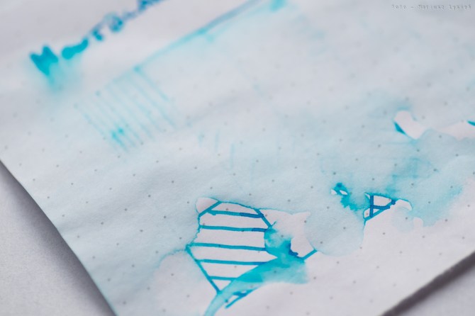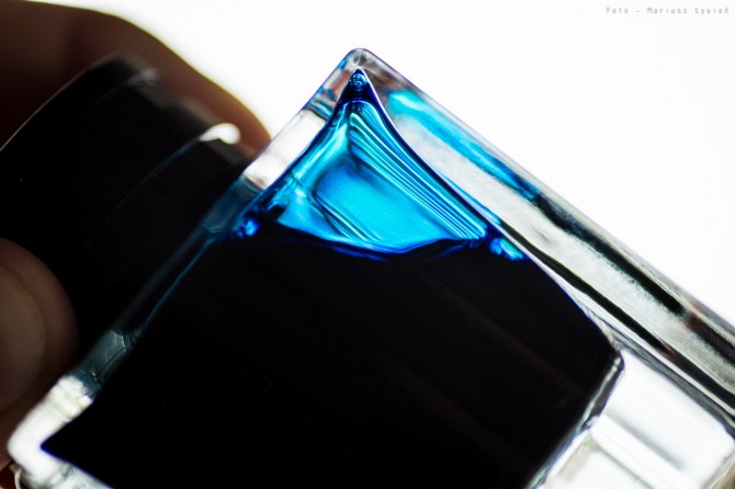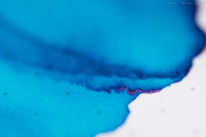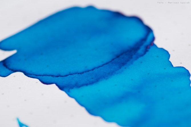 Pierwsze wrażenie podczas dosyć nieśmiałej próby sprawiło, że nie wiedziałem co myśleć. Z jednej strony spodziewałem się jasnej barwy, a z drugiej strony, jest ona znacznie ciemniejsza niż wspomniany na początku Miles Davis Ink. Ze względu na inne obowiązki musiałem także odłożyć na pewien czas przygotowywaną próbkę z „kleksem”. Po jego wyschnięciu nie miałem już wątpliwości, że barwa jest bardzo miła dla oka. „Ciemna niezapominajka” to chyba właściwe określenie koloru. Barwa jest „czysta” i prezentuje się moim zdaniem świetnie. Widać także, że nie jest to klasyczny odcień niebieskiego atramentu.