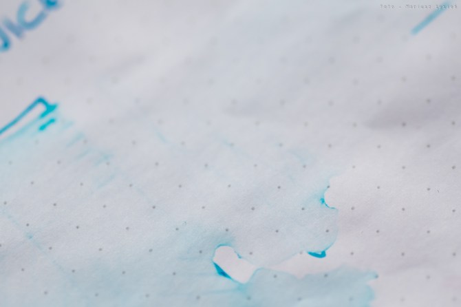 Atrament nie schnie zbyt szybko, jednak trzeba wziąć poprawkę na szeroką i mokrą kreskę stalówki Lamy Safari w rozmiarze „B”. Tak naprawdę jedyną wadą (o ile można to tak ująć skoro atrament ten nie jest oznaczony jako wodoodporny) jest jego odporność na kontakt z wodą. Około 80-90% solidnie zamoczonej płaszczyzny przestaje być czytelne, gdyż woda skutecznie wypłukuje atrament z powierzchni papieru. Trochę szkoda, że producent nie przewidział przynajmniej minimalnej wodoodporności – z pewnością dla wielu osób byłby to atut w codziennym użytkowaniu tego produktu.