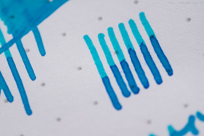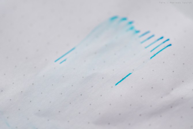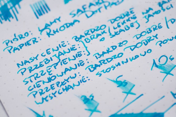 Nasycenie jest bardzo dobre. Moim zdaniem wszystkie osoby narzekające na zbyt jasny odcień atramentu dedykowanego kolekcji Miles Davis, będą obecnie zadowolone. Kolor jest jasny, ale nie jest to przesadne rozjaśnienie. Napisany tekst jest w pełni czytelny i nie męczy oka (no chyba że ktoś używa japońskiej stalówki EF bądź UEF, ale moim zdaniem w takich stalówkach używa się wyłącznie ciemnych inkaustów). W „normalnej” europejskiej F czy M jest to kolor, którego spokojnie możemy używać na co dzień.