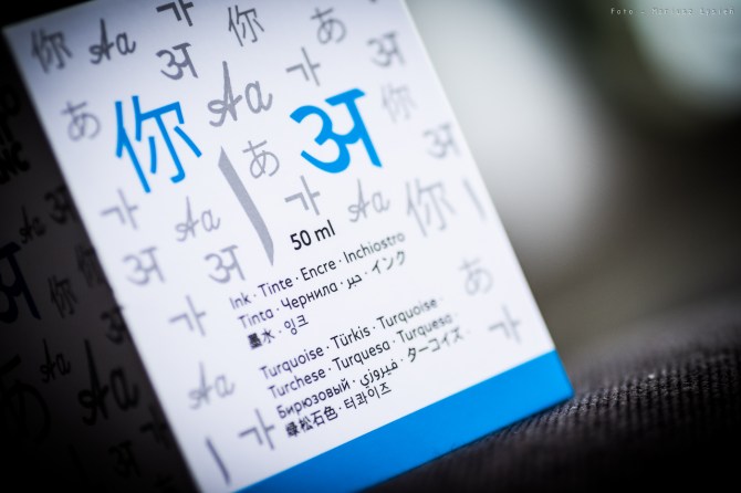 Poza charakterystyczną dla kolekcji UNICEF grafiką zawierającą pierwsze symbole wybranych alfabetów, mamy tutaj do czynienia z opakowaniem przypominającym w pewien sposób pudełka z oferty regularnej. Mamy bowiem sztywny kartonowy wkład, który „wyjeżdża” po pociągnięciu za tasiemkę umieszczoną na jego boku. Zewnętrza część jest jednak wykonana ze znacznie mocniej i lepiej usztywnionego kartonu. Muszę przyznać, że taka forma pakowania atramentów jest wg mnie rewelacyjna i wprowadza wręcz nową jakość do czegoś, co przecież zawsze było wykonane naprawdę solidnie. Buteleczka jest centrowana w wewnętrznej części opakowania za pomocą wkładki z białej gąbki. Powoduje to, że nasz kałamarz znajduje się zawsze w centrum pudełka i nie przemieszcza się na boki.