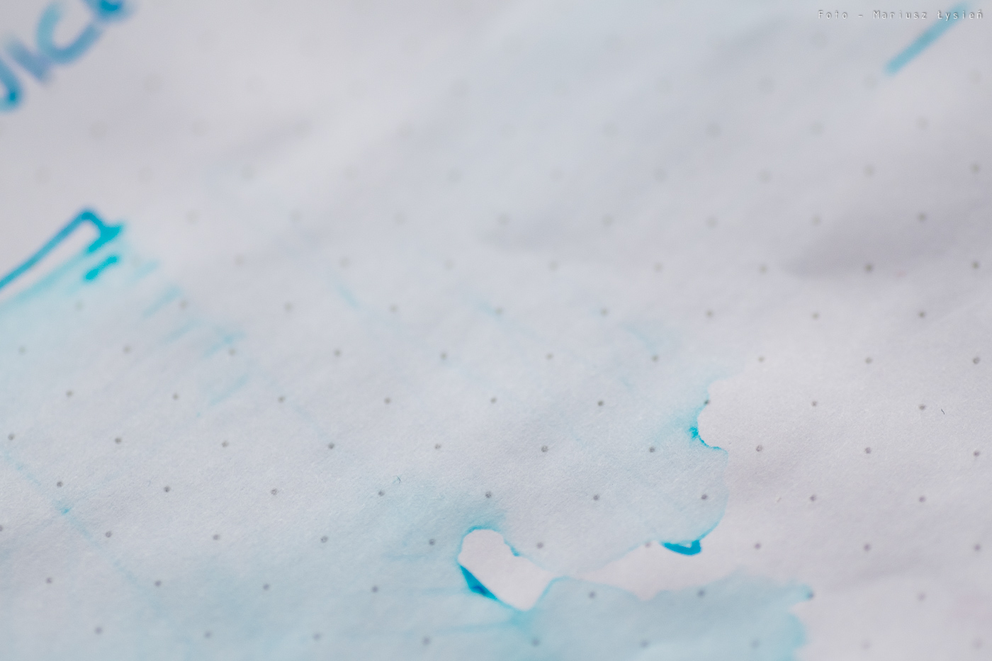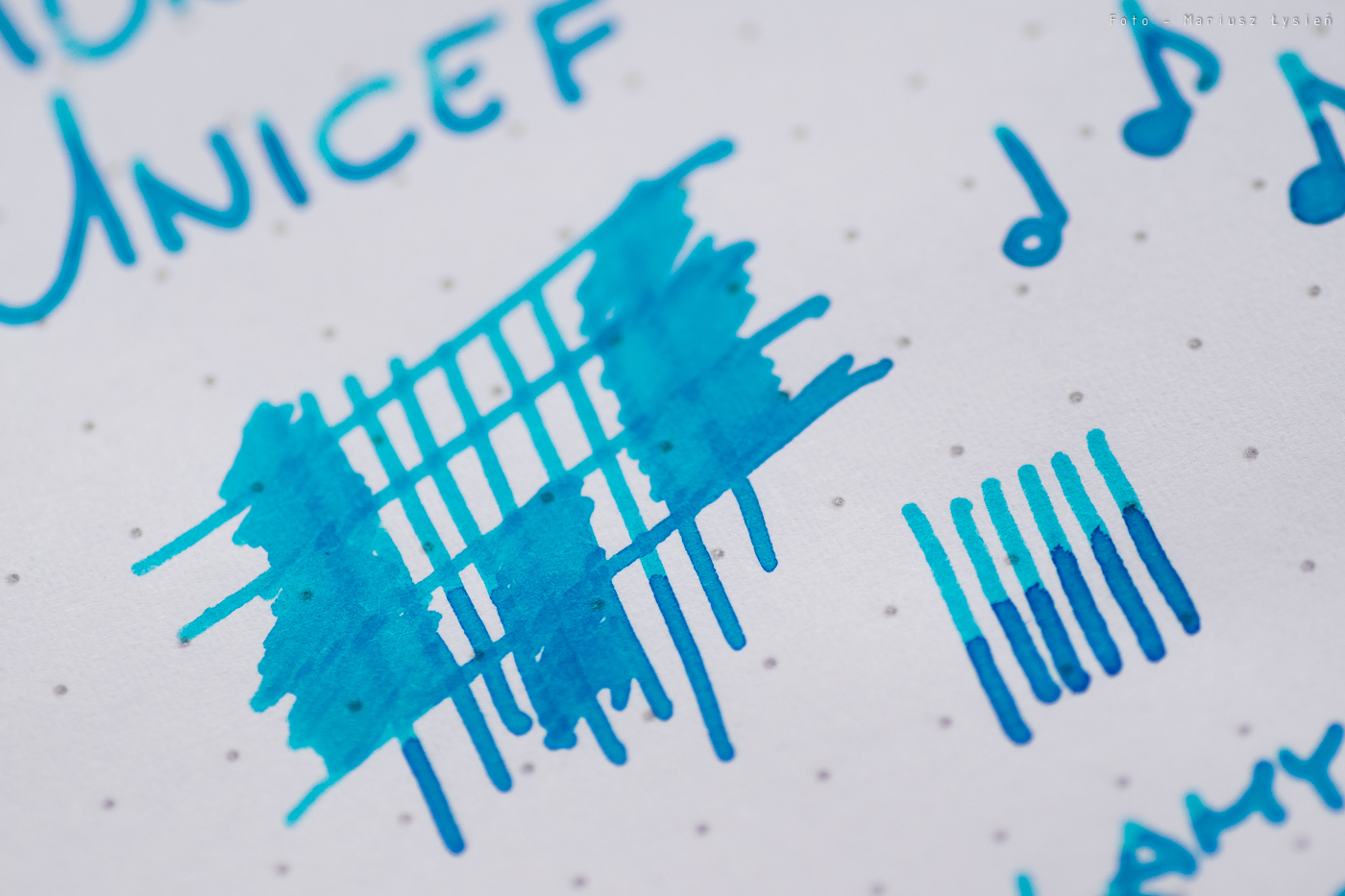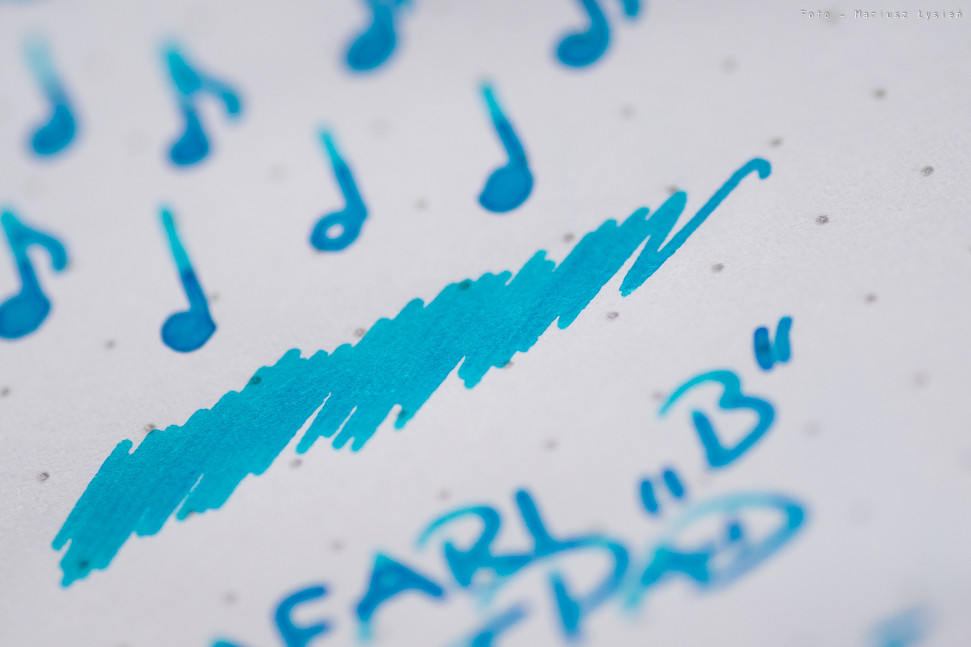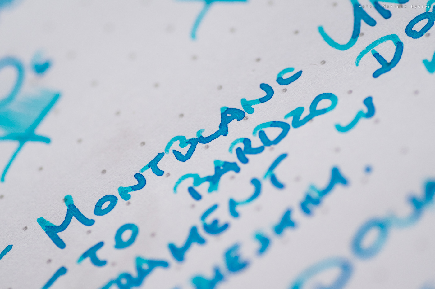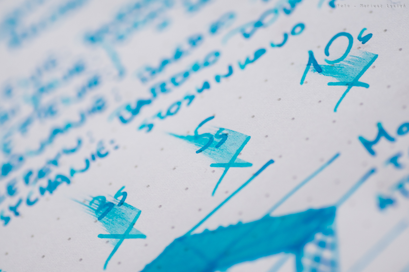 Nasycenie jest bardzo dobre. Moim zdaniem wszystkie osoby narzekające na zbyt jasny odcień atramentu dedykowanego kolekcji Miles Davis, będą obecnie zadowolone. Kolor jest jasny, ale nie jest to przesadne rozjaśnienie. Napisany tekst jest w pełni czytelny i nie męczy oka (no chyba że ktoś używa japońskiej stalówki EF bądź UEF, ale moim zdaniem w takich stalówkach używa się wyłącznie ciemnych inkaustów). W „normalnej” europejskiej F czy M jest to kolor, którego spokojnie możemy używać na co dzień.
