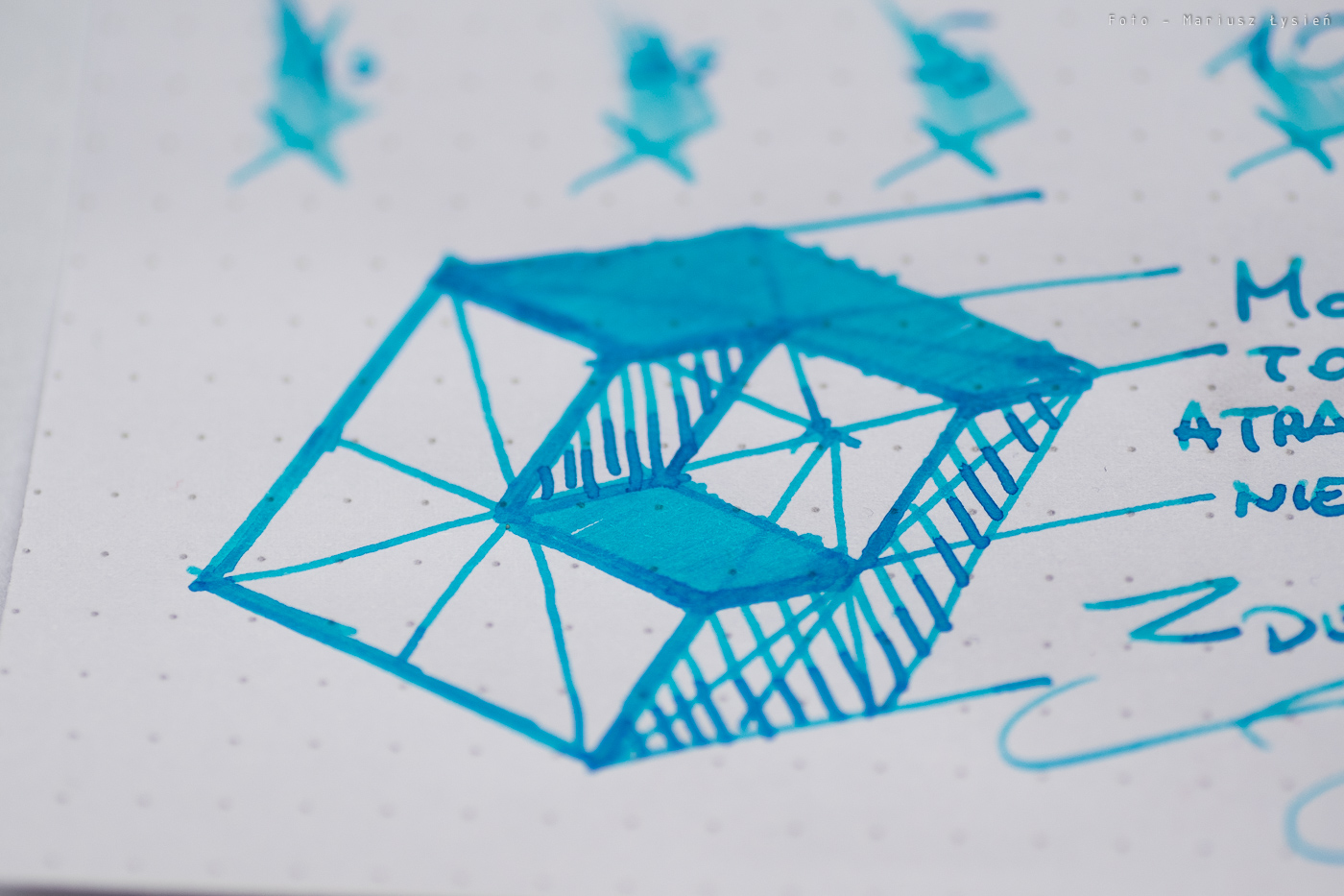 Atrament nie schnie zbyt szybko, jednak trzeba wziąć poprawkę na szeroką i mokrą kreskę stalówki Lamy Safari w rozmiarze „B”. Tak naprawdę jedyną wadą (o ile można to tak ująć skoro atrament ten nie jest oznaczony jako wodoodporny) jest jego odporność na kontakt z wodą. Około 80-90% solidnie zamoczonej płaszczyzny przestaje być czytelne, gdyż woda skutecznie wypłukuje atrament z powierzchni papieru. Trochę szkoda, że producent nie przewidział przynajmniej minimalnej wodoodporności – z pewnością dla wielu osób byłby to atut w codziennym użytkowaniu tego produktu.