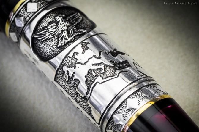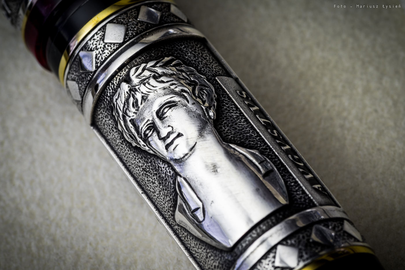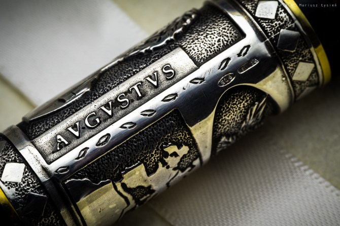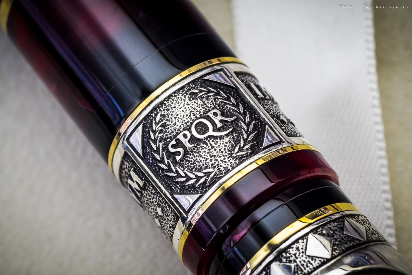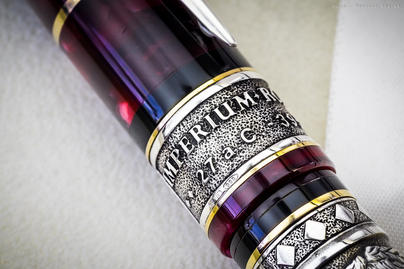 Pióro zostało wykonane z żywicy w kolorze ciemnego bordo. Dodatkowym atutem użytego materiału jest jego połyskiwanie w wybranych fragmentach, gdy patrzymy na produkt pod różnymi kątami. Dzięki temu kolor „żyje”. Żywicę zestawiono ze sporą ilością elementów metalowych. Mają one dwa kolory, chociaż trzeba przyznać, że zdecydowanie przeważa srebro sterling (świadczą o tym zresztą stosowne próby). Korpus poza wąskimi pierścieniami otrzymał szeroki element wykonany właśnie ze srebra. Umieszczono na nim charakterystycznego dla imperium rzymskiego orła, mapę cesarstwa, oraz podobiznę Oktawiana Augusta (który był pierwszym cesarzem imperium rzymskiego). Całość została oddzielona wizualnie dwoma „opaskami” z geometrycznym wzorem.