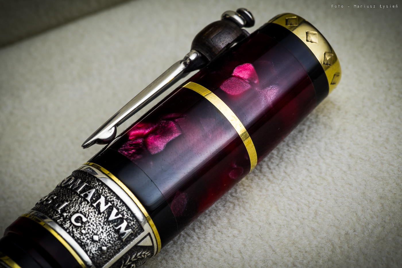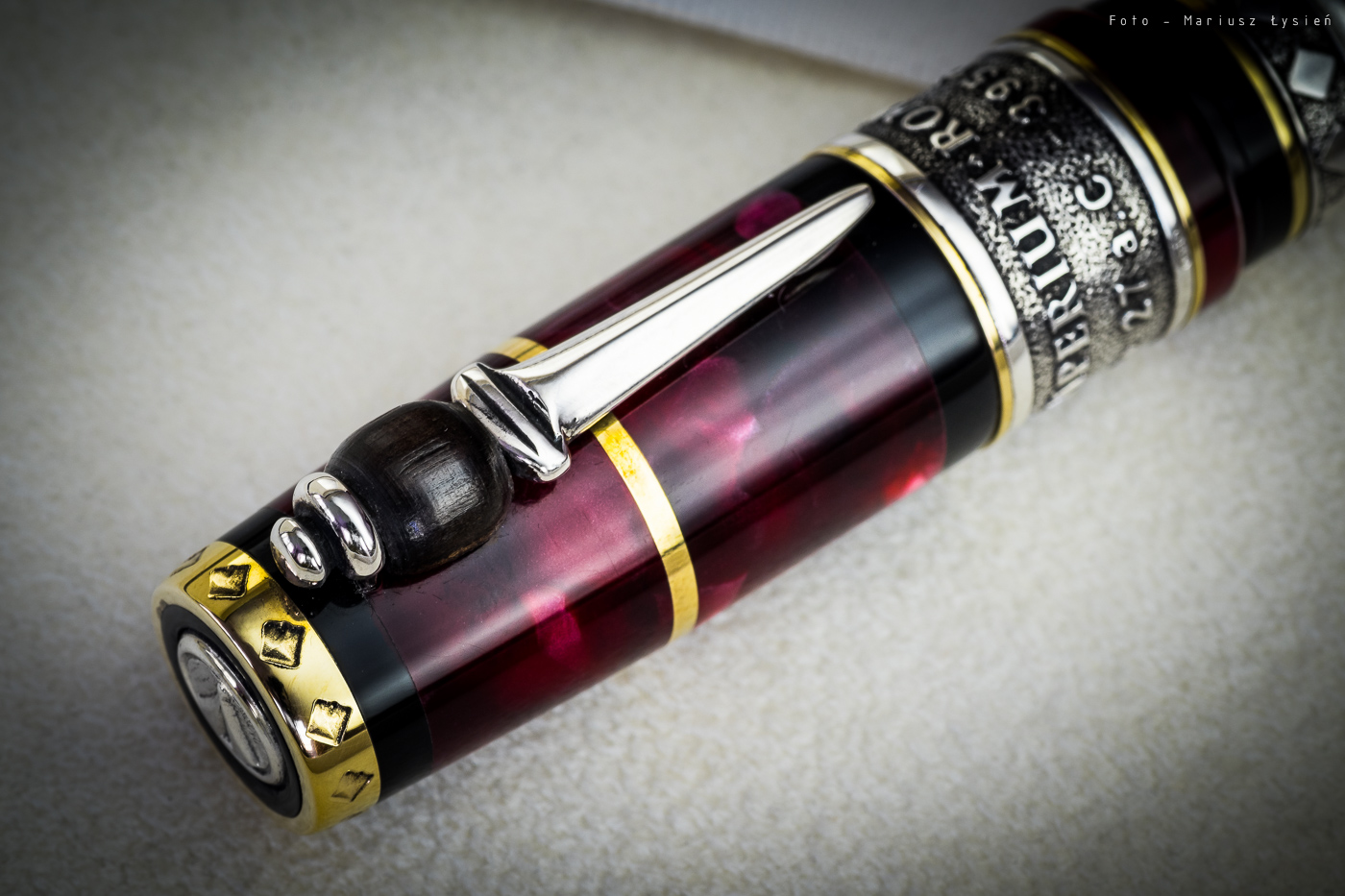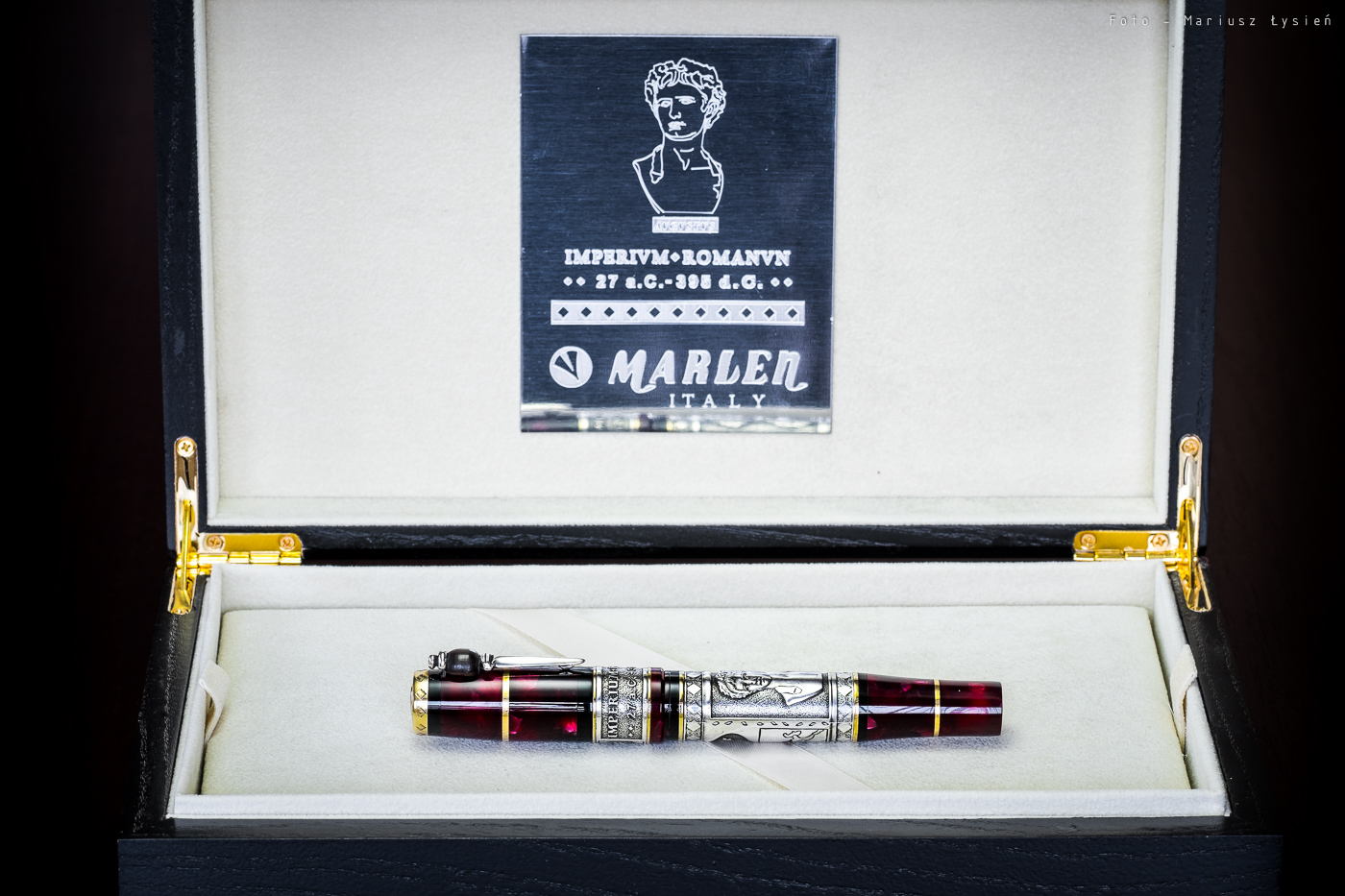 Marlen Imperium Romanum to przykład pięknie wykonanego pióra wiecznego, którego stylistyka jest zgrabnym balansem pomiędzy okazałymi zdobieniami, a elegancją. Niewątpliwie pióro to ma w sobie coś przyciągającego uwagę. Na pewno przyczynia się do tego kolorystyka oraz kontrast pomiędzy wiśniową/ bordową barwą żywicy, srebrem oraz jasnozłotymi akcentami. Cena jaką przyjdzie nam zapłacić w przypadku chęci zakupu nie jest niska, bowiem cena wynosi 7500zł. Trzeba jednak pamiętać, że producent oferuje nam elementy metalowe wykonane ze srebra, a produkt jest edycją limitowaną, w obrębie której wyprodukowano niewiele sztuk (zwłaszcza jak na tę cenę). Tak więc, jeżeli tylko pióra trafia w Twe gusta, a środki finansowe pozwalają na jego zakup, to polecam to pióro zdecydowanie.