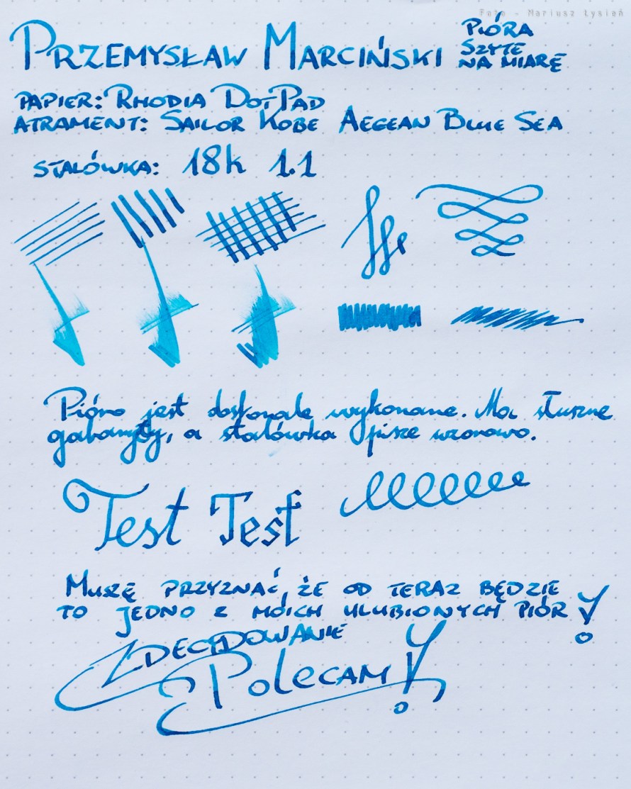 Nigdy wcześniej nie zamawiałem pióra, które miało być wykonane wg mojego pomysłu. Dzięki rzeczowej i merytorycznej wymianie uwag z wykonawcą, cały proces przebiegł znacznie sprawniej, aniżeli to początkowo podejrzewałem. Pióro jest wykonane świetnie. Wszystkie elementy są doskonale spasowane oraz wykończone. Jest to moje pierwsze pióro wykonane przez Przemka, ale wiem już, że z pewnością nie jest ono ostatnim jakie zamówiłem. Pomimo, że mam w swej kolekcji wiele piór droższych, to opisywane pióro już zostało jednym z moich ulubionych. Dlaczego? Na pewno jest świetnie wykonane. Dodatkowo mam świadomość, że jest to jeden, niepowtarzalny egzemplarz, w którego projektowaniu miałem swój udział. No i fakt, że wykonane zostało ręcznie zamiast bycia jednym z tysięcy egzemplarzy nie jest tutaj bez znaczenia. Od zawsze bardzo ceniłem sobie rękodzieło oraz umiejętności i zaangażowanie jakie ktoś wkłada w wykonanie takiego przedmiotu. Nie pozostaje mi nic innego jak tylko polecić Przemysława Marcińskiego oraz jego wyroby. Jestem pewien, że podobnie jak ja, będziecie zadowoleni.