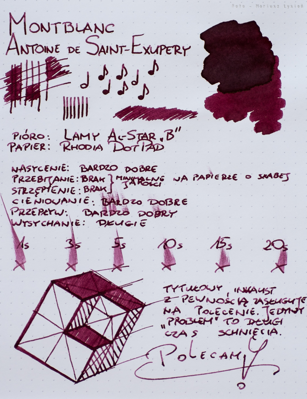 Nowy atrament z kolekcji Antoine de Saint-Excupery to bardzo ciekawa pozycja, która zdecydowanie jest warta zakupu. Ciekawa i elegancka barwa oraz bardzo dobre właściwości sprawiają, że będzie to wartościowe uzupełnienie naszej kolekcji atramentów. Jedynym mankamentem może być długi czas wysychania, więc jeżeli jest to dla nas kluczowa kwestia, to musimy poszukać innego produktu bądź korzystać z niego w piórach, które maja cieńsze gradacje stalówek. Dla mnie osobiście czas wysychania nie jest istotny, więc z przyjemnością będę go używał.