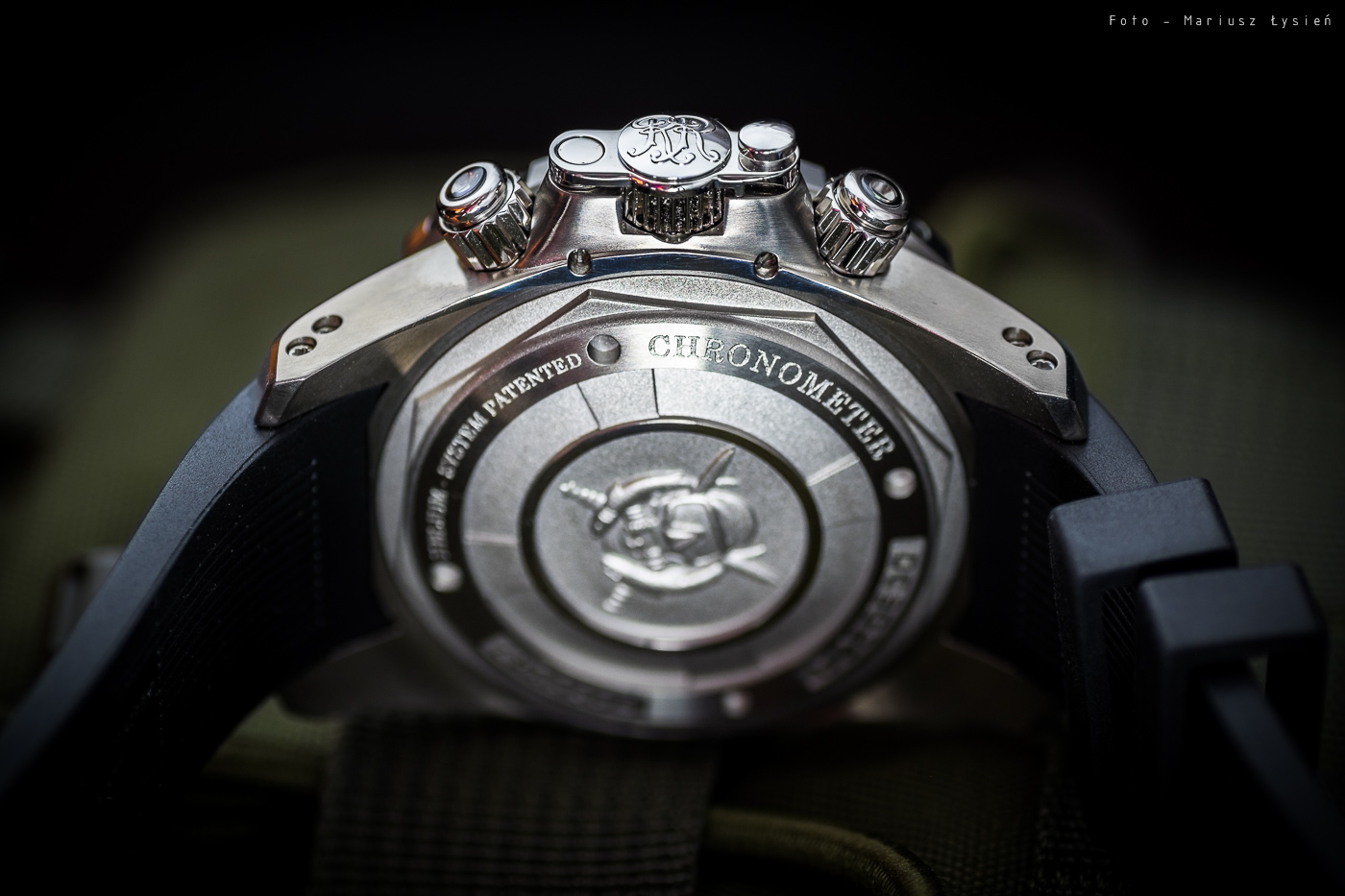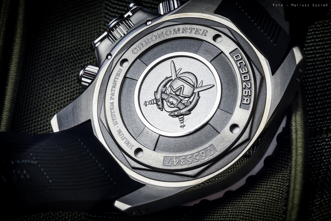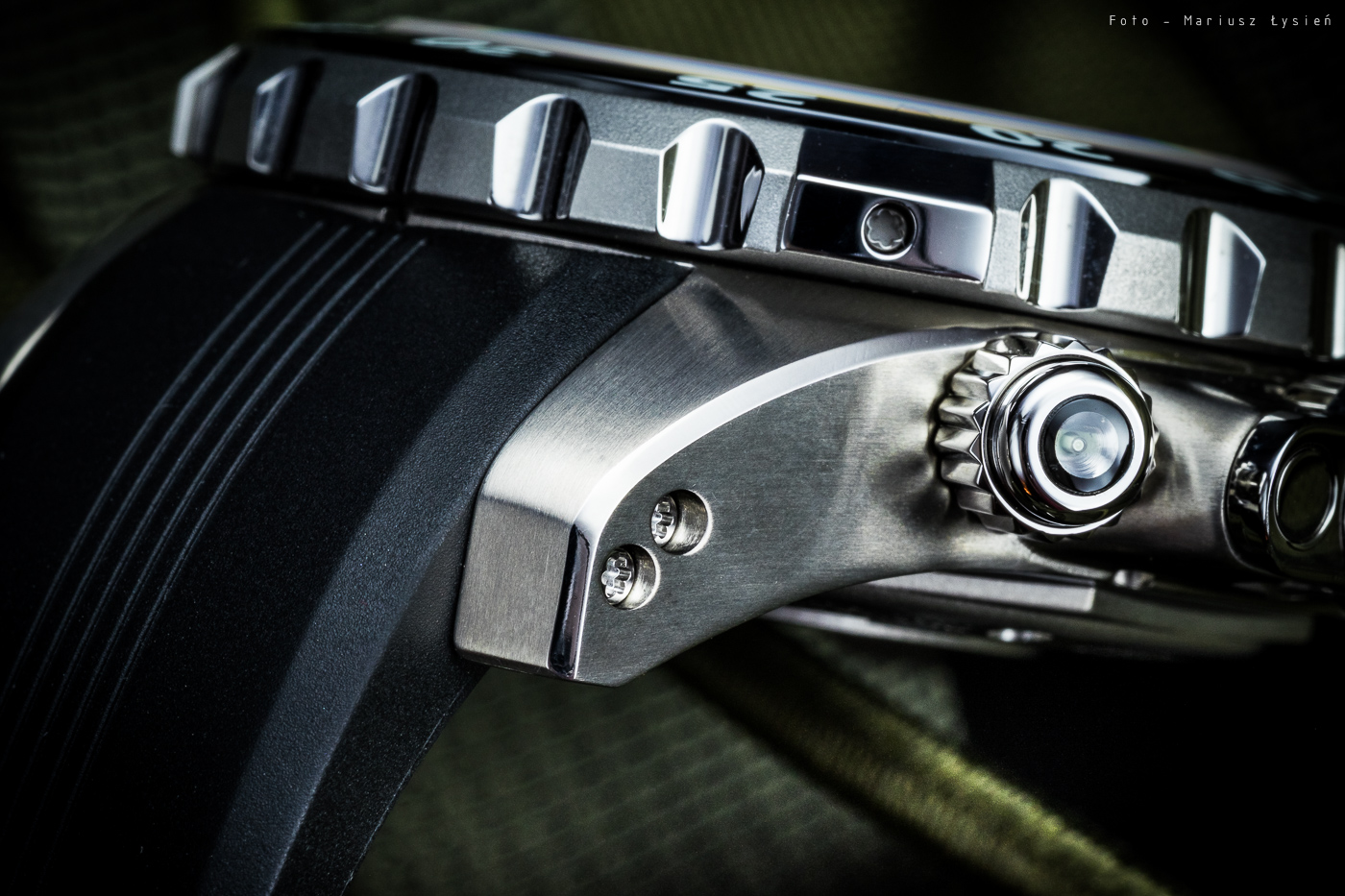 Mój pierwszy wybór padł na NEDU – to tzw. diver, który połączono z funkcją chronografu. Rozsądne 42mm średnicy sprawiają, że zegarek nie jest przesadnie wielki, aczkolwiek zdecydowanie trudno nazwać go małym. Do tego pokaźna wysokość 17,3mm sprawia, że „jest co założyć na nadgarstek”. Jeżeli preferujemy zegarki, które sprawnie będą się wsuwały pod wąskie mankiety, to sugeruję rozejrzenie się za innym modelem. Nie oznacza to jednak, że całość jest przesadnie ciężka. Koperta została wykonana z tytanu. Jej powierzchnia jest szczotkowana, jednak wybrane wąskie płaszczyzny będące w pewnym sensie krawędziami koperty, zostały wypolerowane na wysoki połysk. Koperta została wyposażona w opatentowane rozwiązanie zaworu helowego oraz osłonę zakręcanej koronki. Z prawej strony koperty umieszczono także dwa przyciski do obsługi funkcji stopera – system zabezpieczeń umożliwia korzystanie z tego rozwiązania także pod wodą. Wodoodporność została przez producenta oszacowana na poziomie 600m. Zegarek jest także odporny na wstrząsy o wartości mniejszej niż 7500Gs oraz pole magnetyczne słabsze niż 4800A/m.