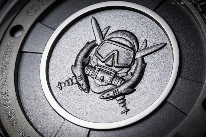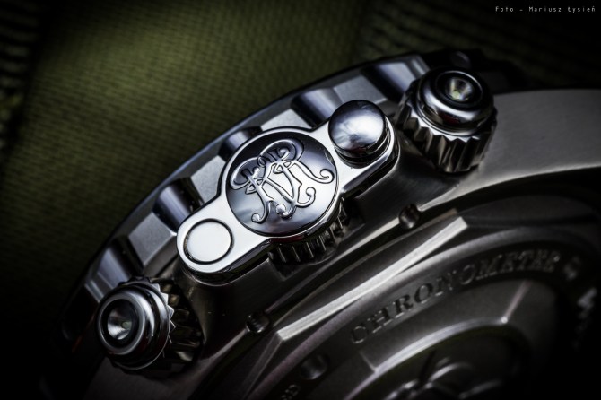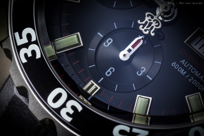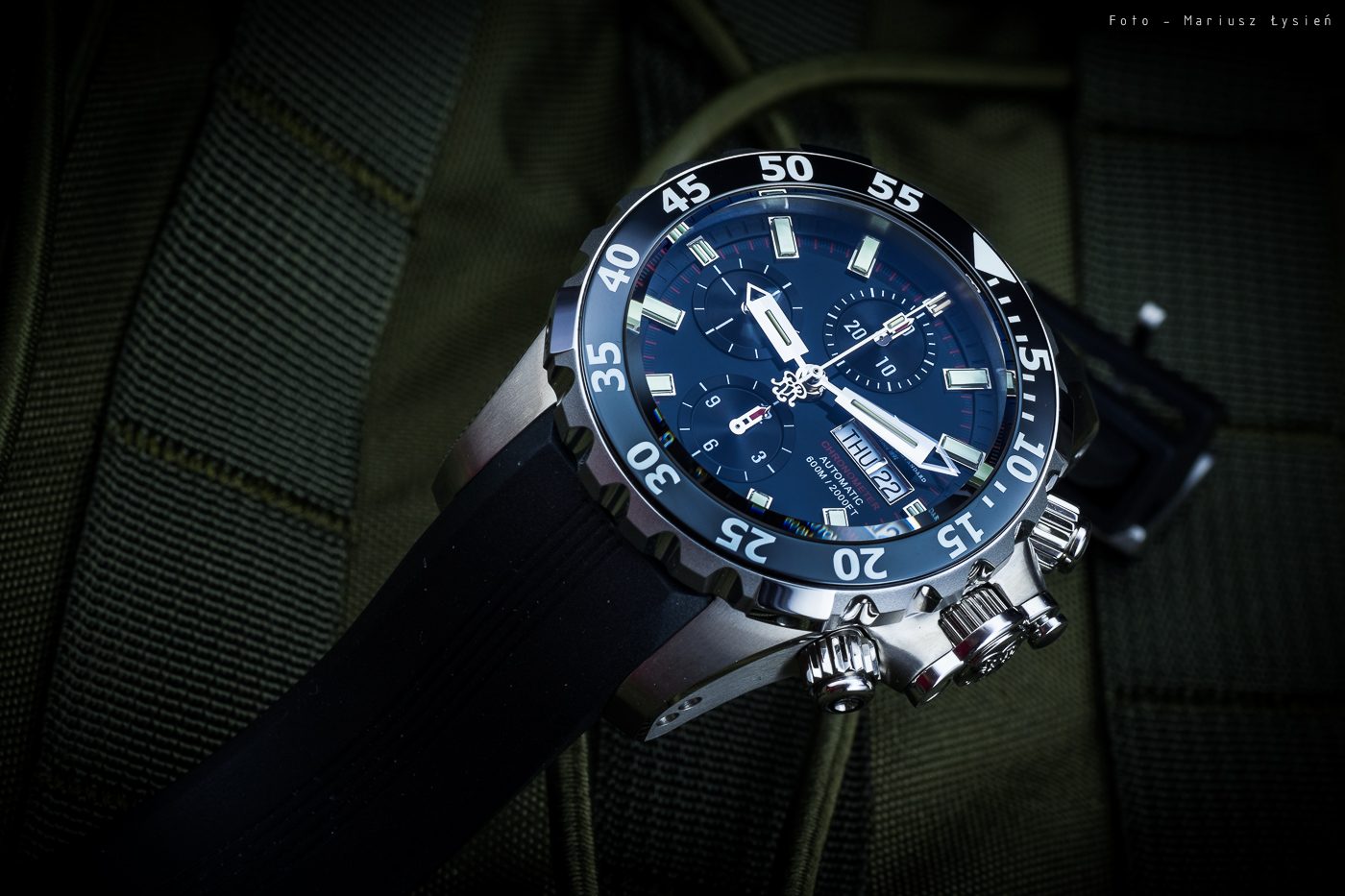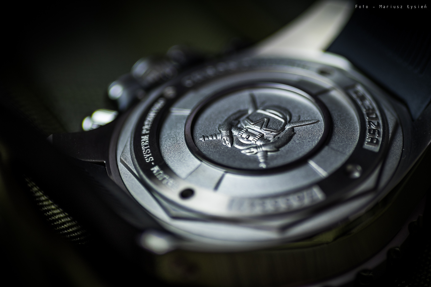 Mój pierwszy wybór padł na NEDU – to tzw. diver, który połączono z funkcją chronografu. Rozsądne 42mm średnicy sprawiają, że zegarek nie jest przesadnie wielki, aczkolwiek zdecydowanie trudno nazwać go małym. Do tego pokaźna wysokość 17,3mm sprawia, że „jest co założyć na nadgarstek”. Jeżeli preferujemy zegarki, które sprawnie będą się wsuwały pod wąskie mankiety, to sugeruję rozejrzenie się za innym modelem. Nie oznacza to jednak, że całość jest przesadnie ciężka. Koperta została wykonana z tytanu. Jej powierzchnia jest szczotkowana, jednak wybrane wąskie płaszczyzny będące w pewnym sensie krawędziami koperty, zostały wypolerowane na wysoki połysk. Koperta została wyposażona w opatentowane rozwiązanie zaworu helowego oraz osłonę zakręcanej koronki. Z prawej strony koperty umieszczono także dwa przyciski do obsługi funkcji stopera – system zabezpieczeń umożliwia korzystanie z tego rozwiązania także pod wodą. Wodoodporność została przez producenta oszacowana na poziomie 600m. Zegarek jest także odporny na wstrząsy o wartości mniejszej niż 7500Gs oraz pole magnetyczne słabsze niż 4800A/m.