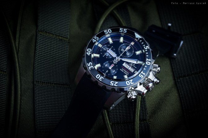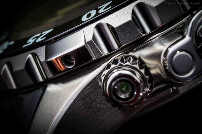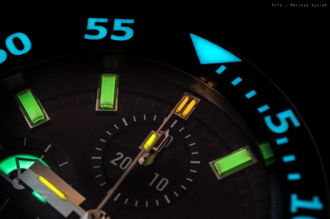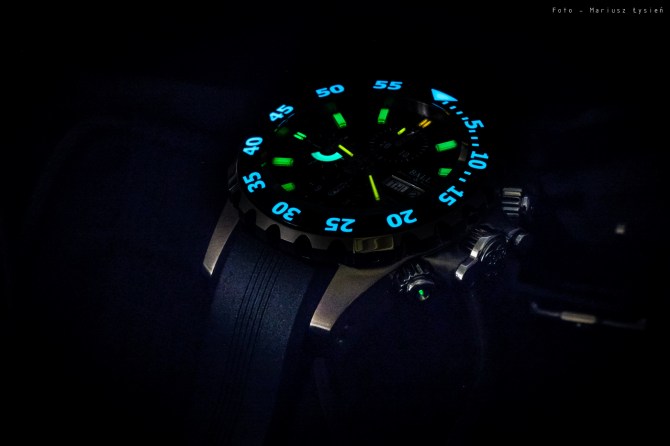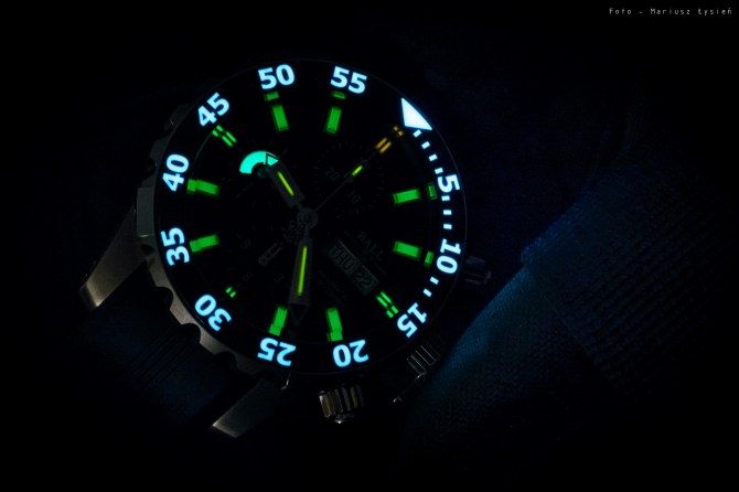 Pierścień lunety wykonano z ceramiki, którą uzupełniono materiałem luminescencyjnym. Szkoda, że świecące elementy bezela nie są wykonane na bazie trytu – wtedy ich czas świecenia byłby zdecydowanie dłuższy. Trzeba jednak powiedzieć jasno, że z funkcji odmierzania czasu za pomocą pierścienia lunety nie korzystamy przeważnie zbyt długo – zwłaszcza gdy światła jest niewiele, więc czas świecenia indeksów jest wystarczający. Z pewnością jednak docenimy możliwość odczytania bieżącego czasu o dowolnej porze np nocy.